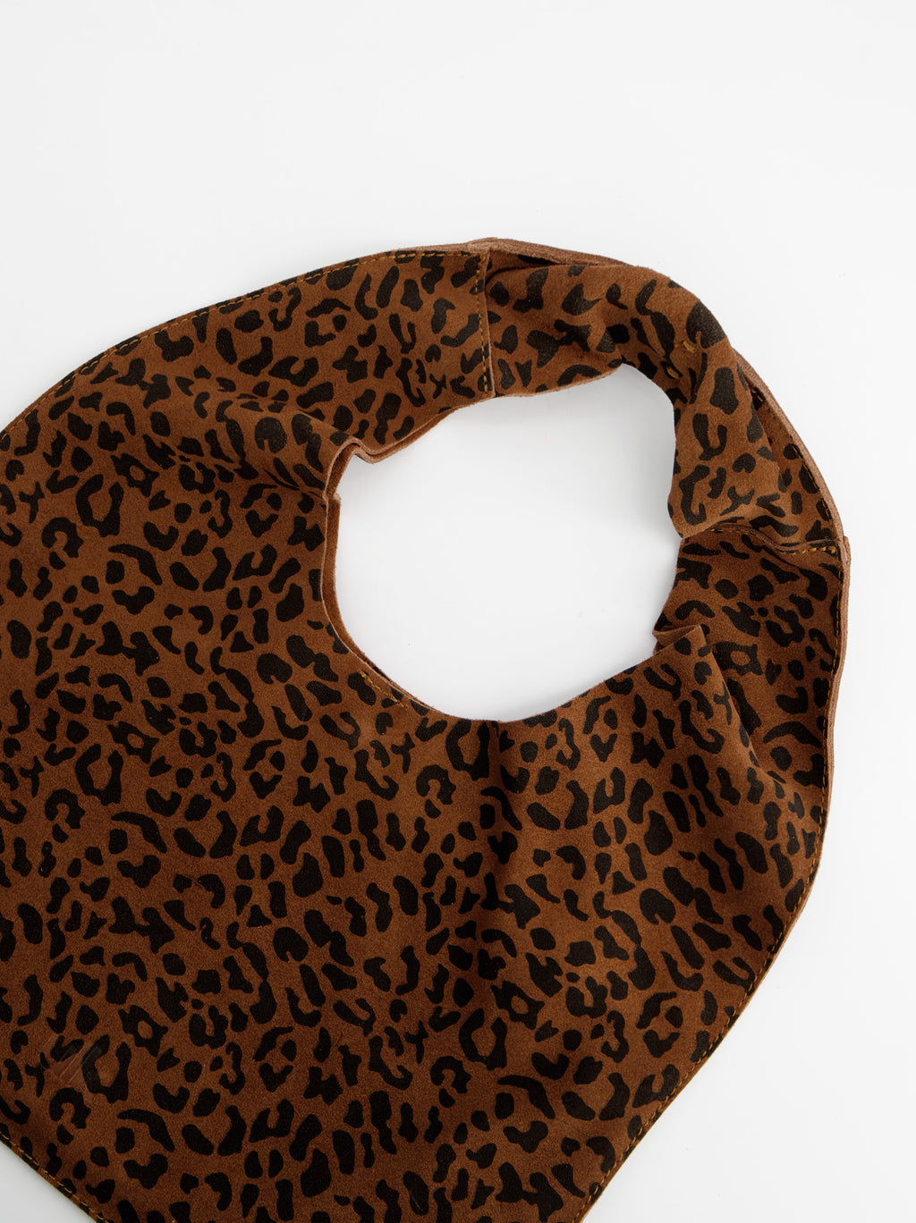 Bolso de hombro con estampado de leopardo. Fabricado en piel. Destaca por su silueta triangular y fusiona funcionalidad y sencillez. Incorpora bolsa interior separable con cierre de cordón, útil para proteger y organizar objetos personales. Accesorio de uso versátil que combina vanguardia con practicidad diaria.