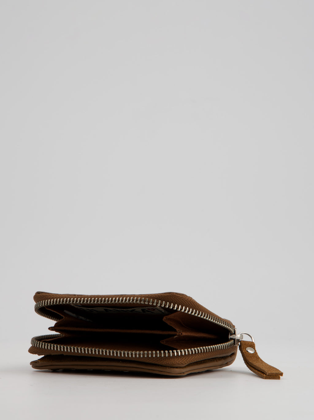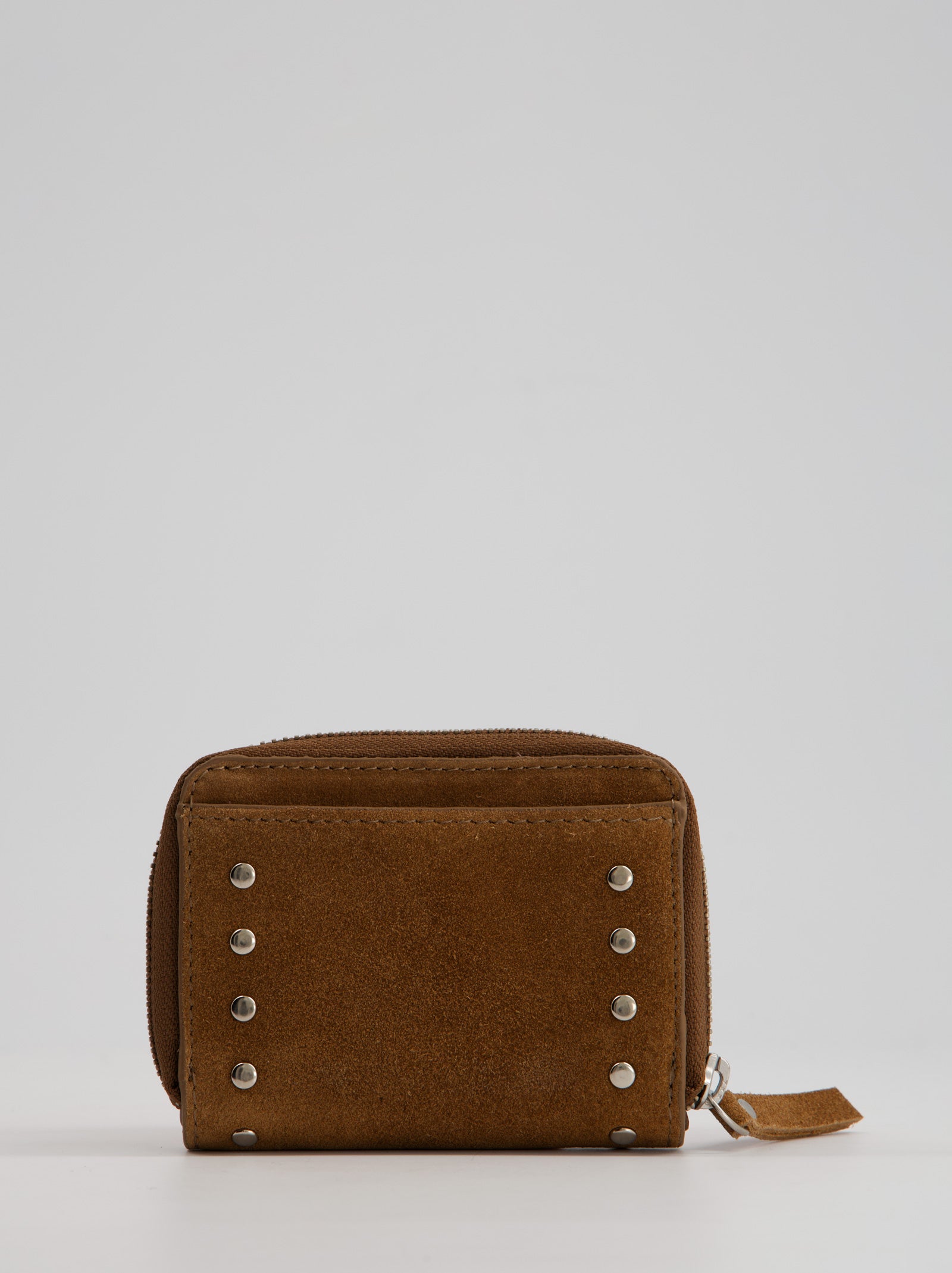 Cartera de ante con tachuelas. Solapa billetera con múltiples ranuras para tarjetas. Bolsillo cremallera exteriror. Cierre de boton a presión. Logo en golpe seco en solapa. Medidas: 8x12 cm.