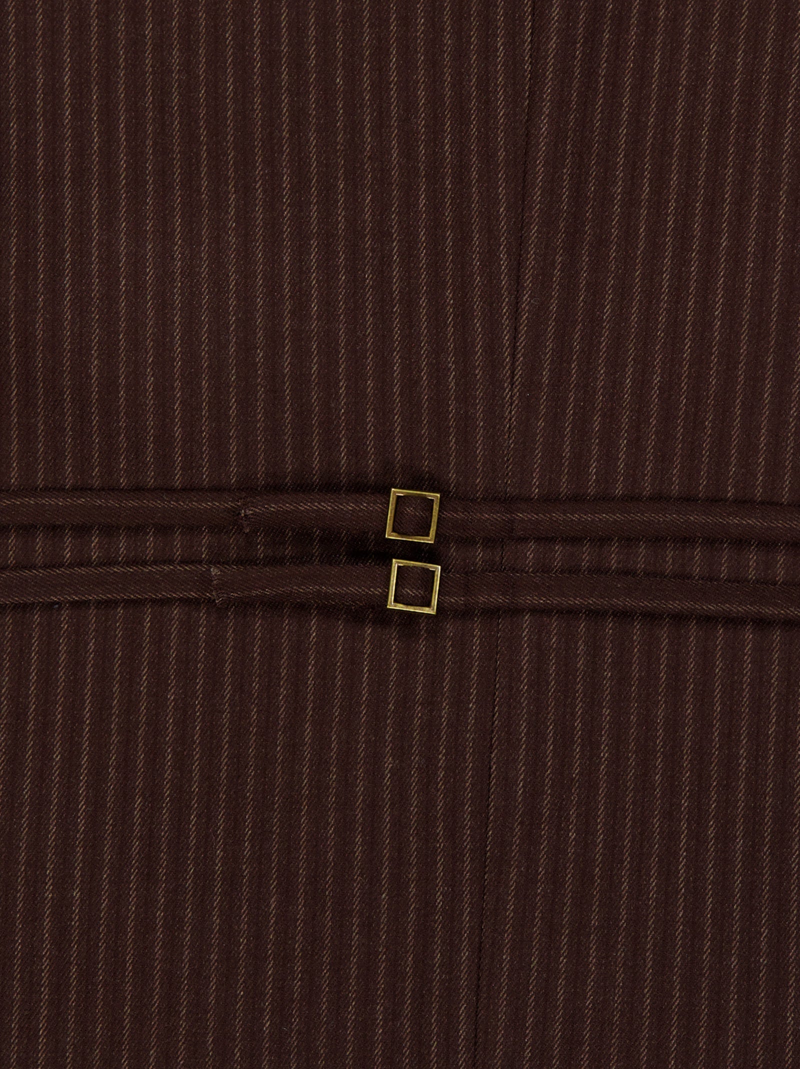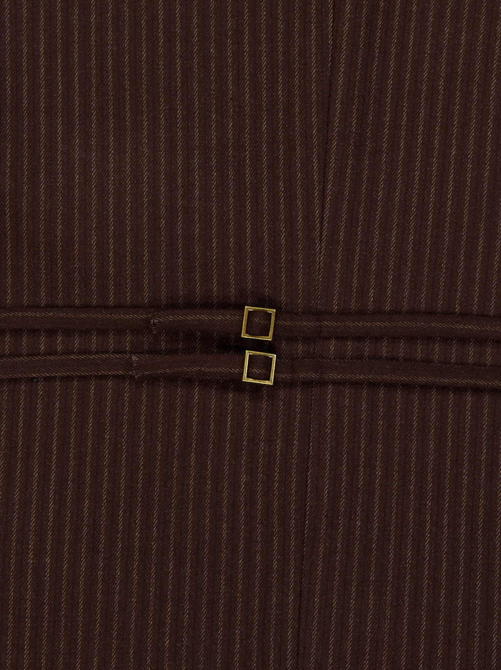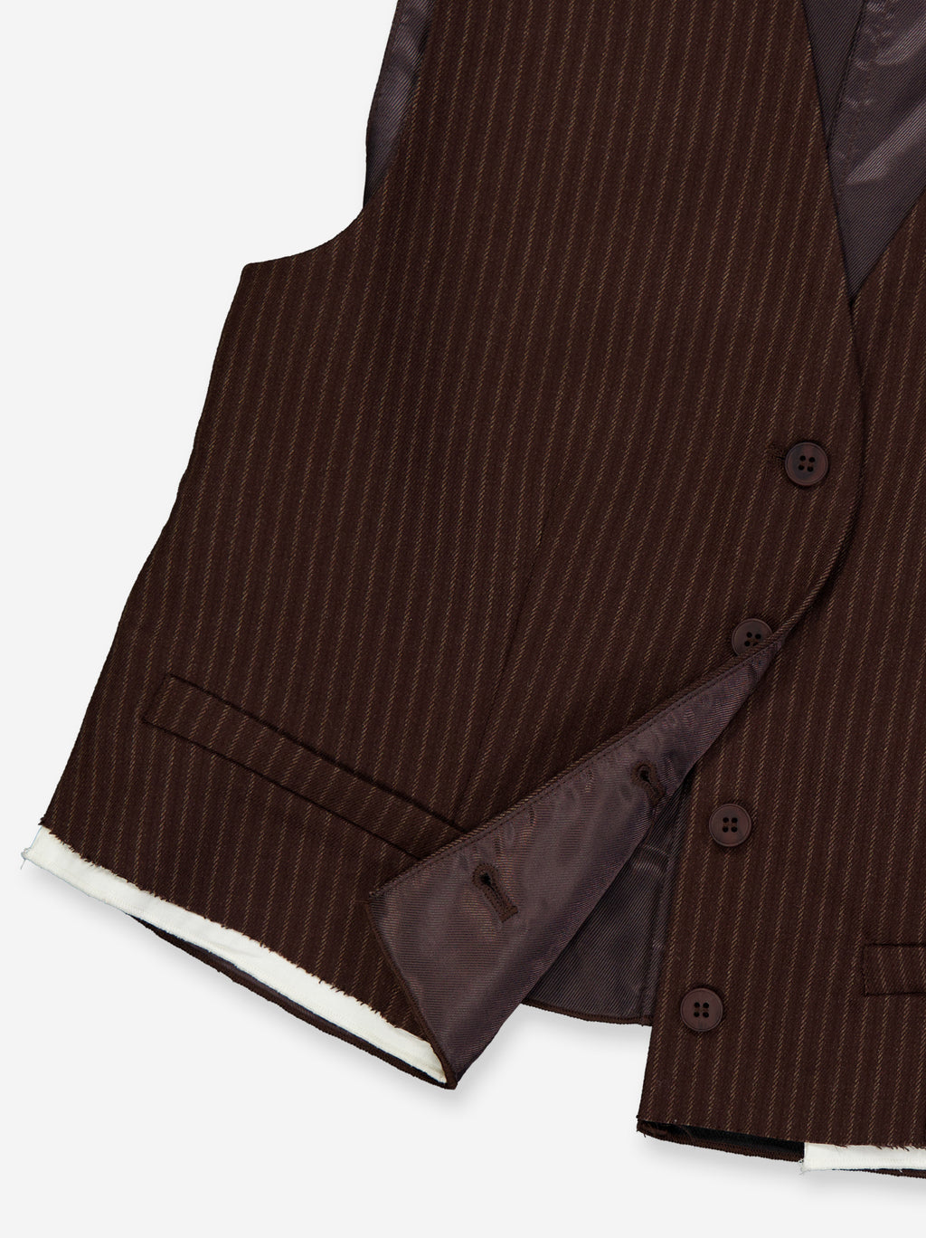 Chaleco sastre con raya diplomática. Bajo deshilachado con forro visto. Falsos bolsillos. Cuello pico y cierre con botones. Ajuste con hebilla doble en la espalda.