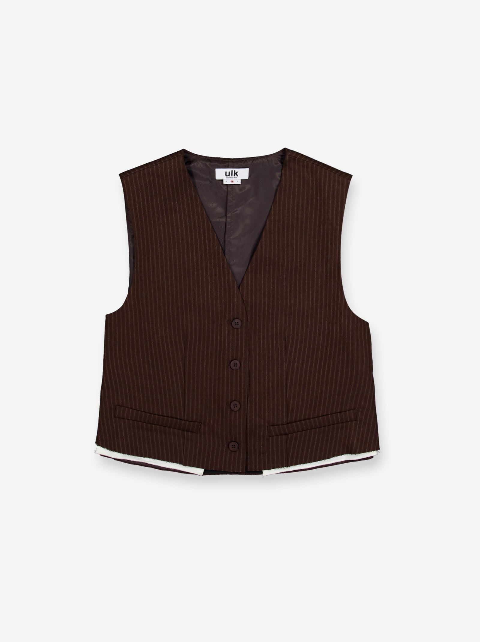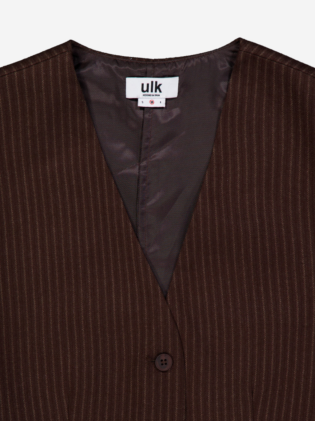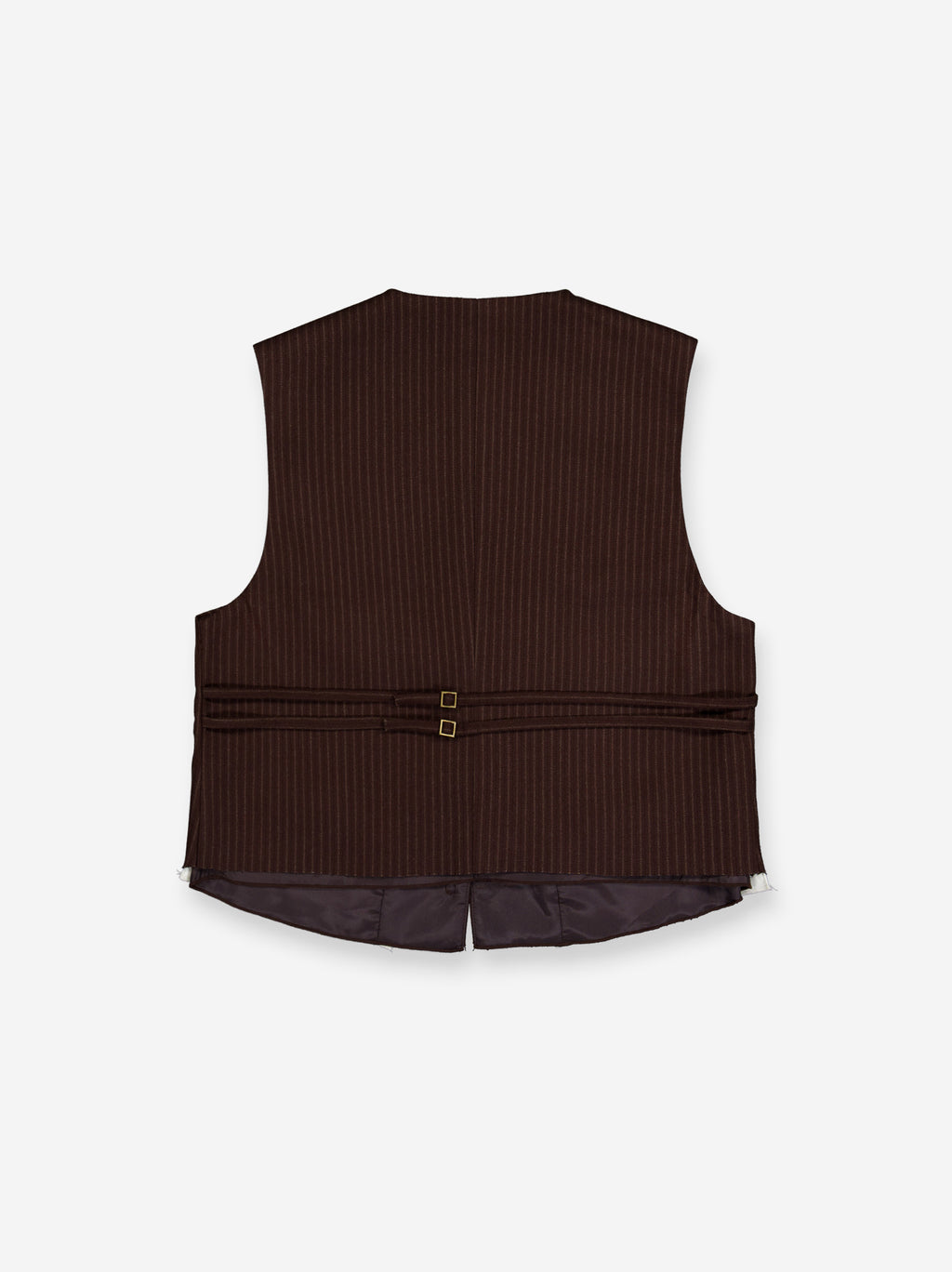 Chaleco sastre con raya diplomática. Bajo deshilachado con forro visto. Falsos bolsillos. Cuello pico y cierre con botones. Ajuste con hebilla doble en la espalda.