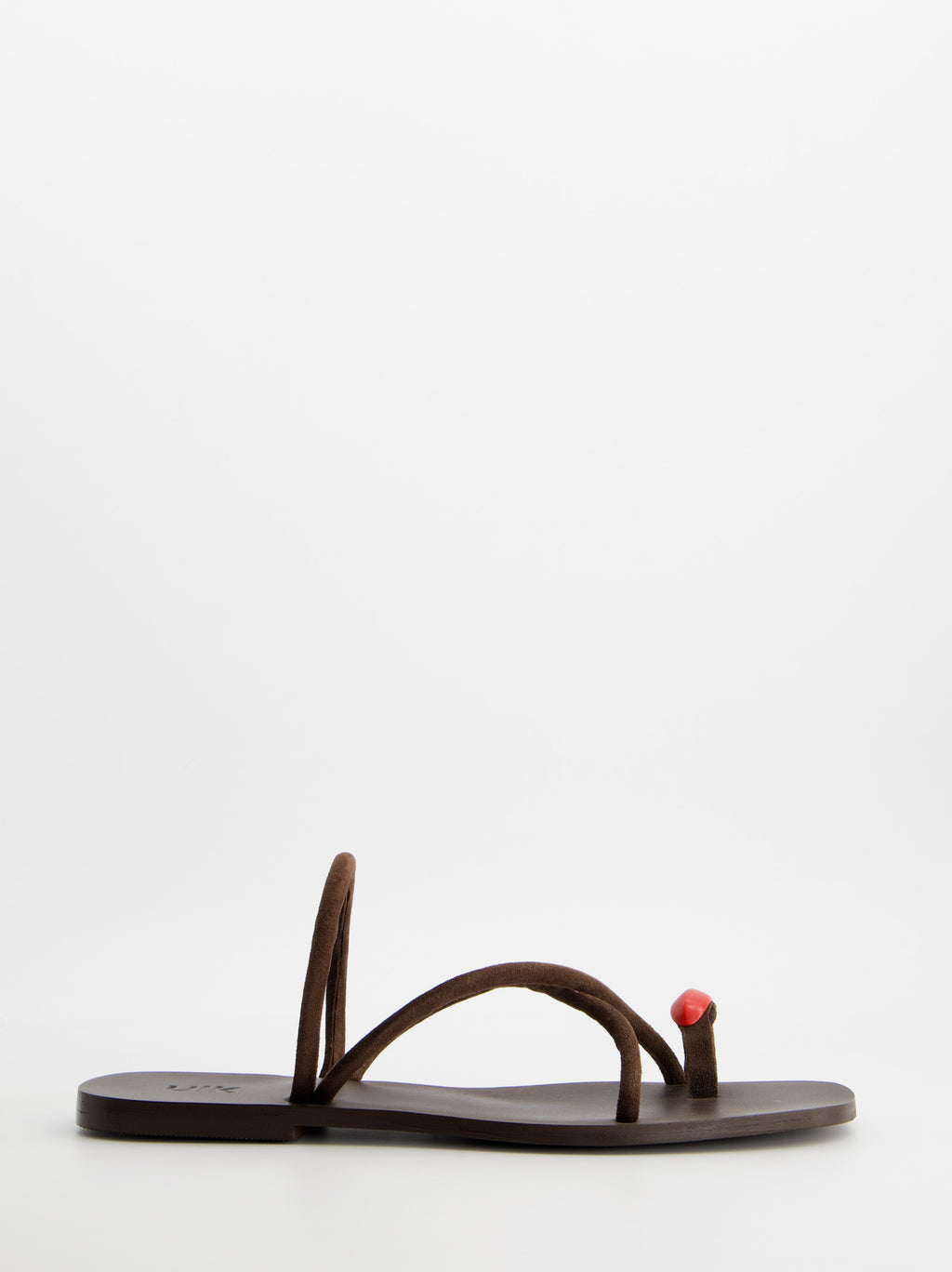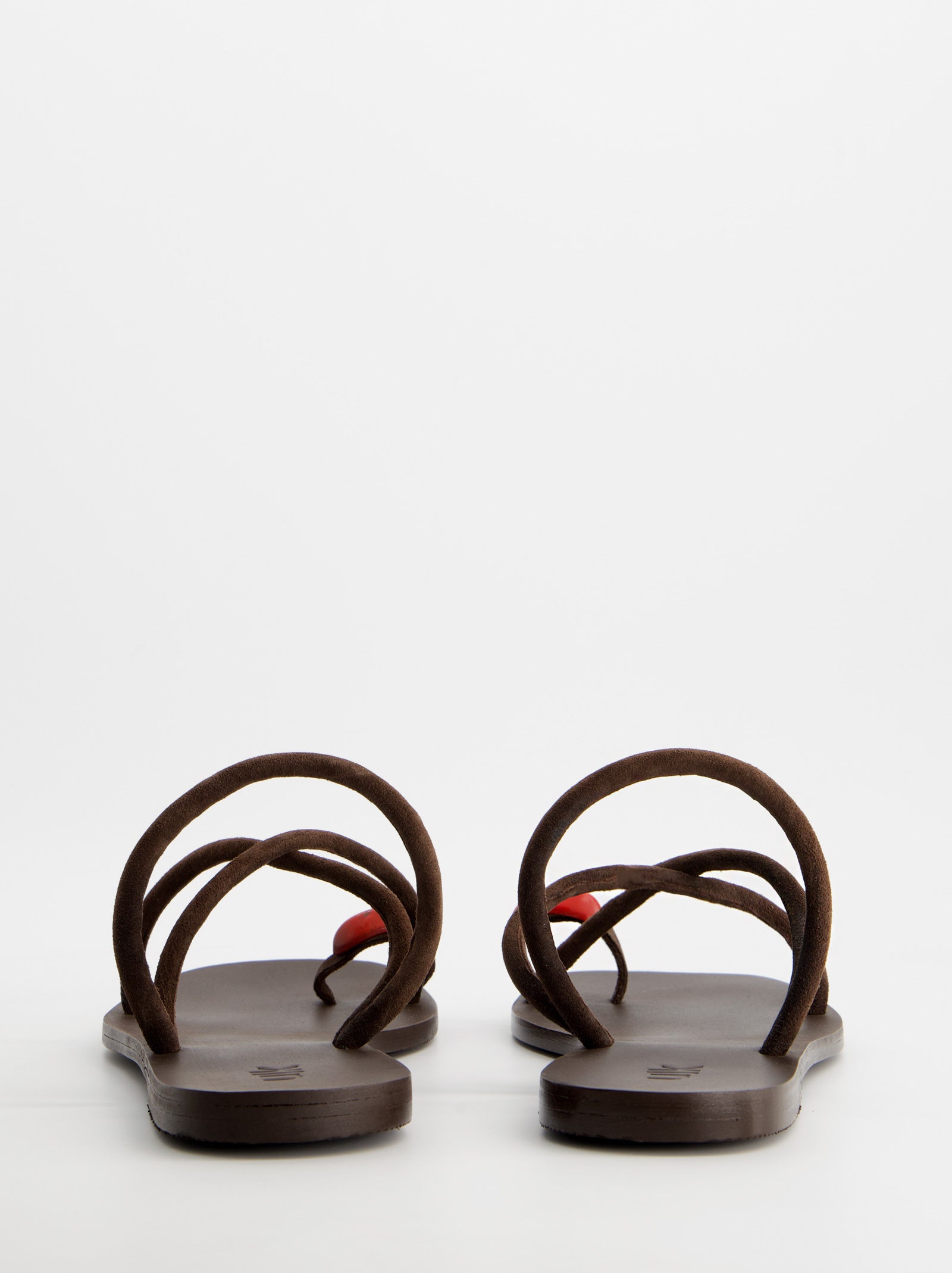 Sandalias planas de piel en color marrón. Elegante diseño de tiras cruzadas. Detalle decorativo sobre el dedo, fusionando un estilo minimalista con un acento artístico y sofisticado.
