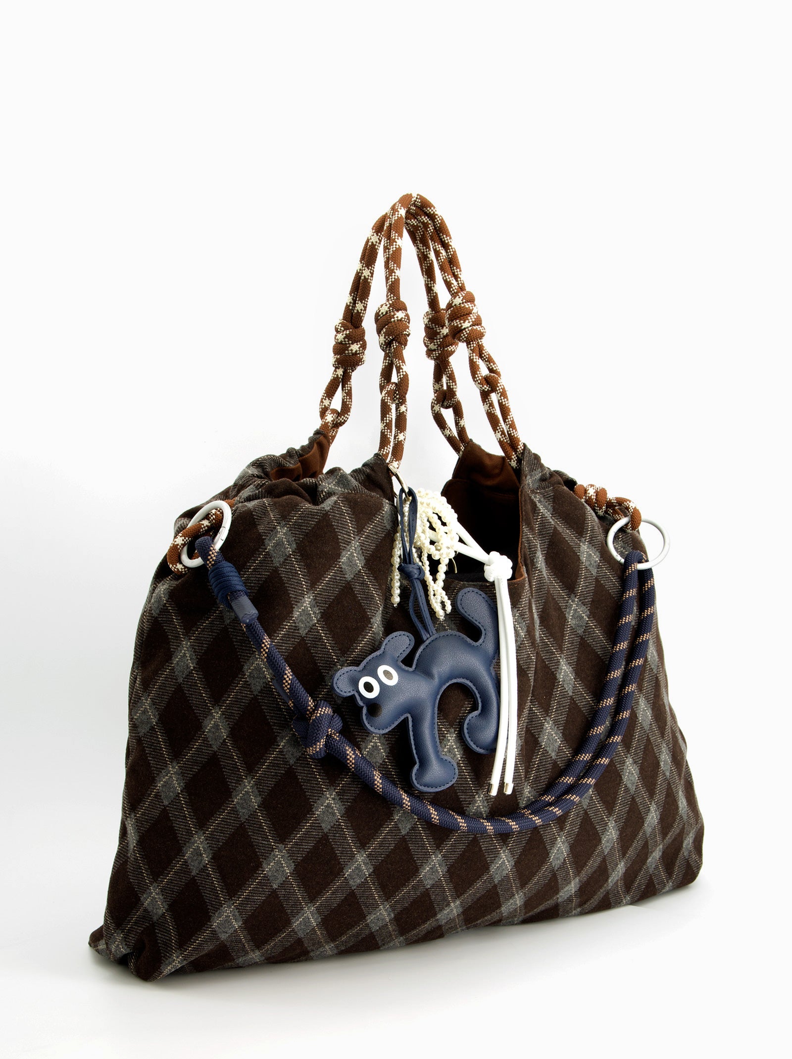 Bolso de hombro tipo tote diseñado con patrón a cuadros en tonos marrones y grisáceos. Presenta una silueta relajada y versátil junto con asas dobles de cuerda adornadas por charms. Perfecto accesorio para quienes busquen una estética bohemia, con carácter, sin perder estilo casual.