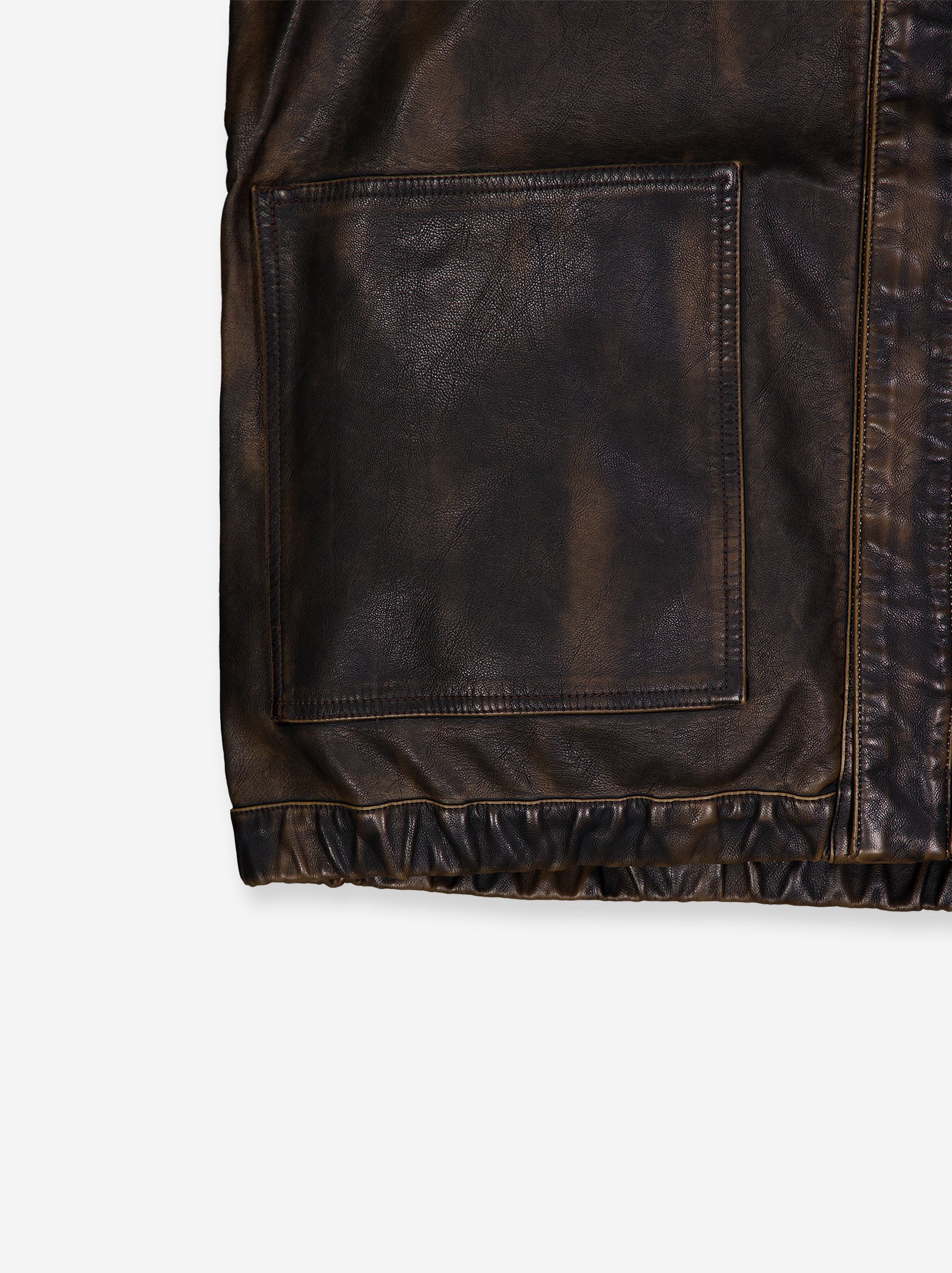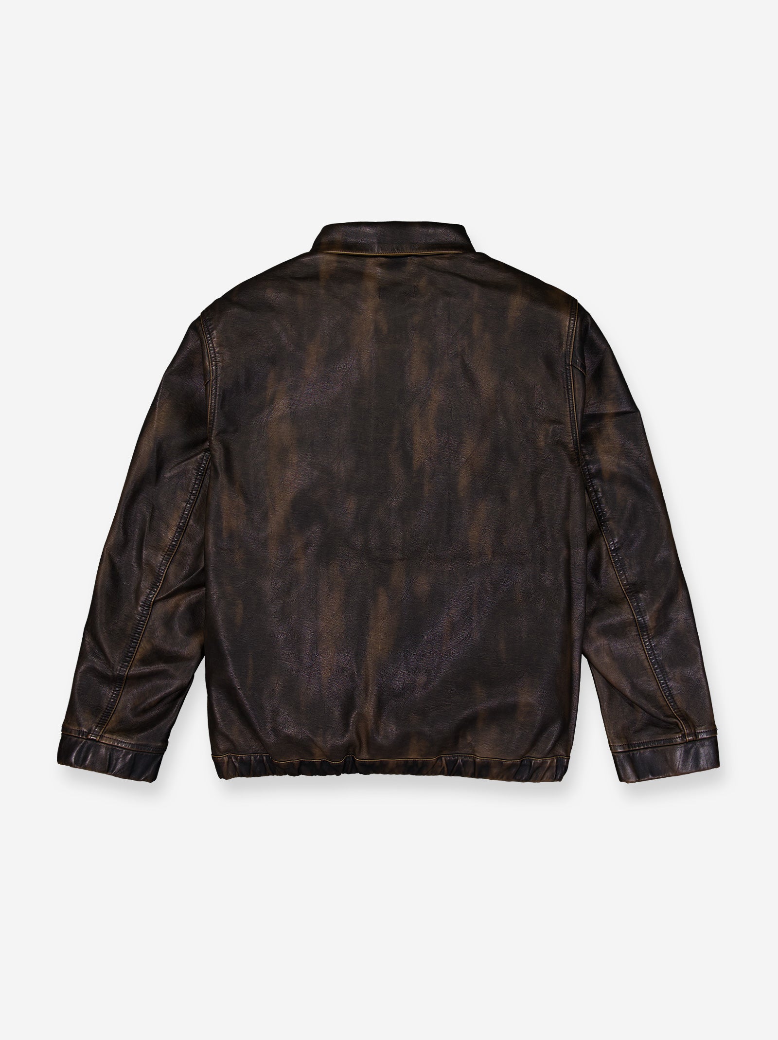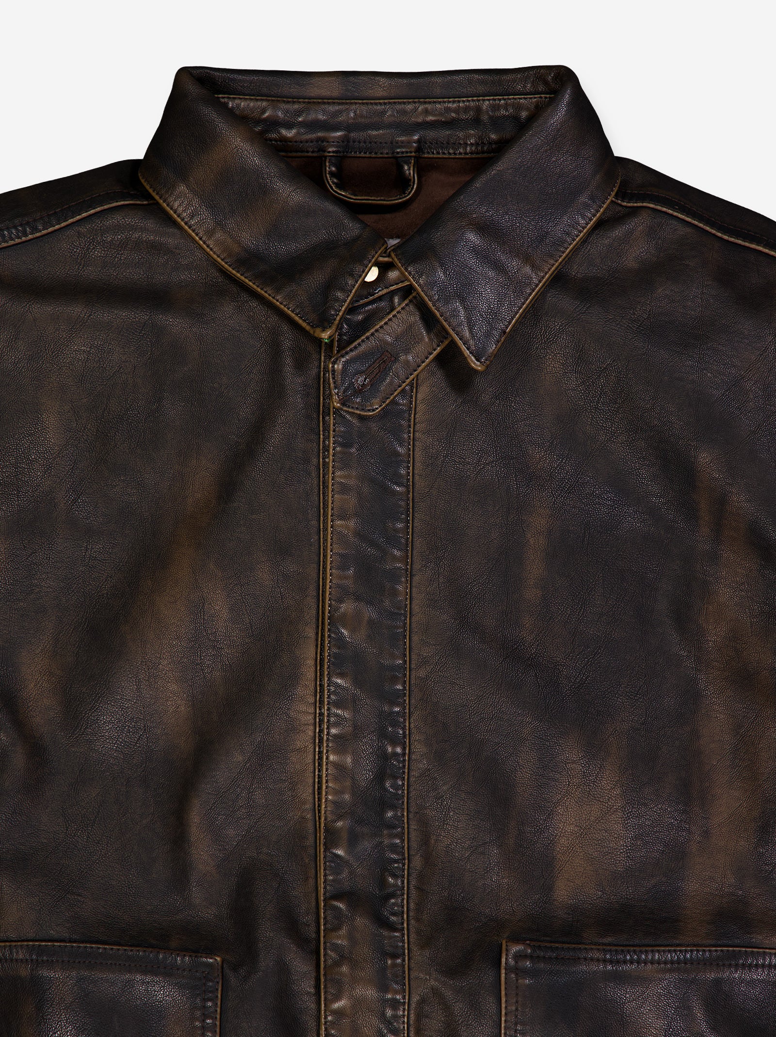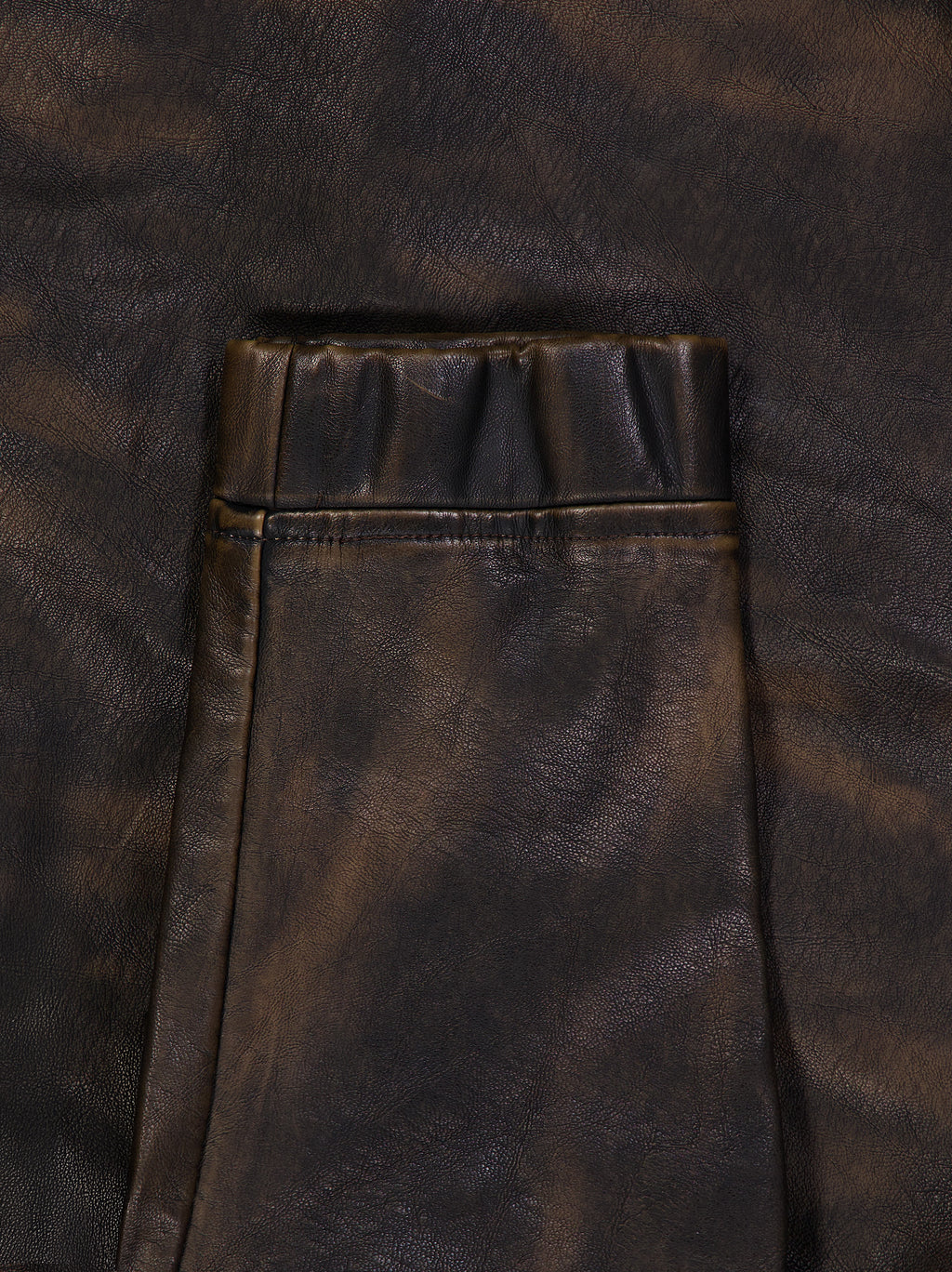 Chaqueta estilo bomber con efecto piel y acabado desgastado. Presenta un diseño vintage, con cuello de solapa y amplios bolsillos delanteros perfectos para un look práctico, casual y elegante al mismo tiempo.