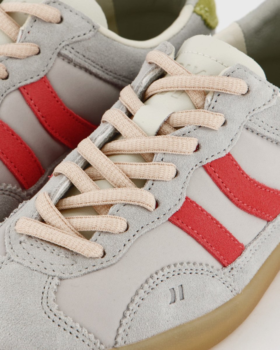 Zapatillas deportivas bajas de piel tipo serraje combinado con nylon. Corte sencillo y clásico con cierre de cordones. La pieza de talón y el logo contrastan tanto por color como por textura. La plantilla de foam acolchada lleva impreso un diseño multilogo. El forro de piel contrasta en la parte trasera siguiendo el tono del corte. La suela de goma ligera en colores miel lleva un pespunte en la base que refuerza la unión entre el corte y la misma suela.