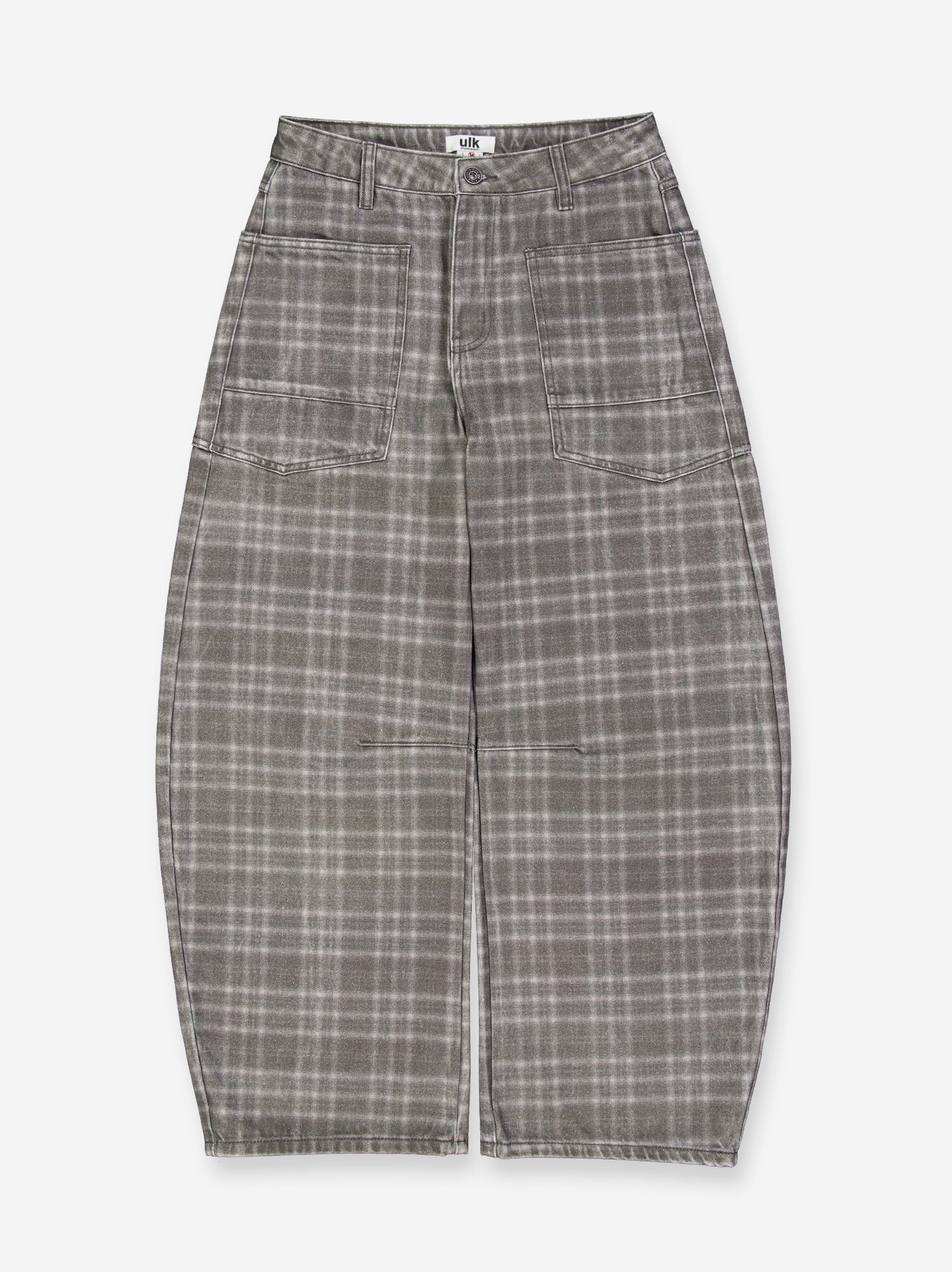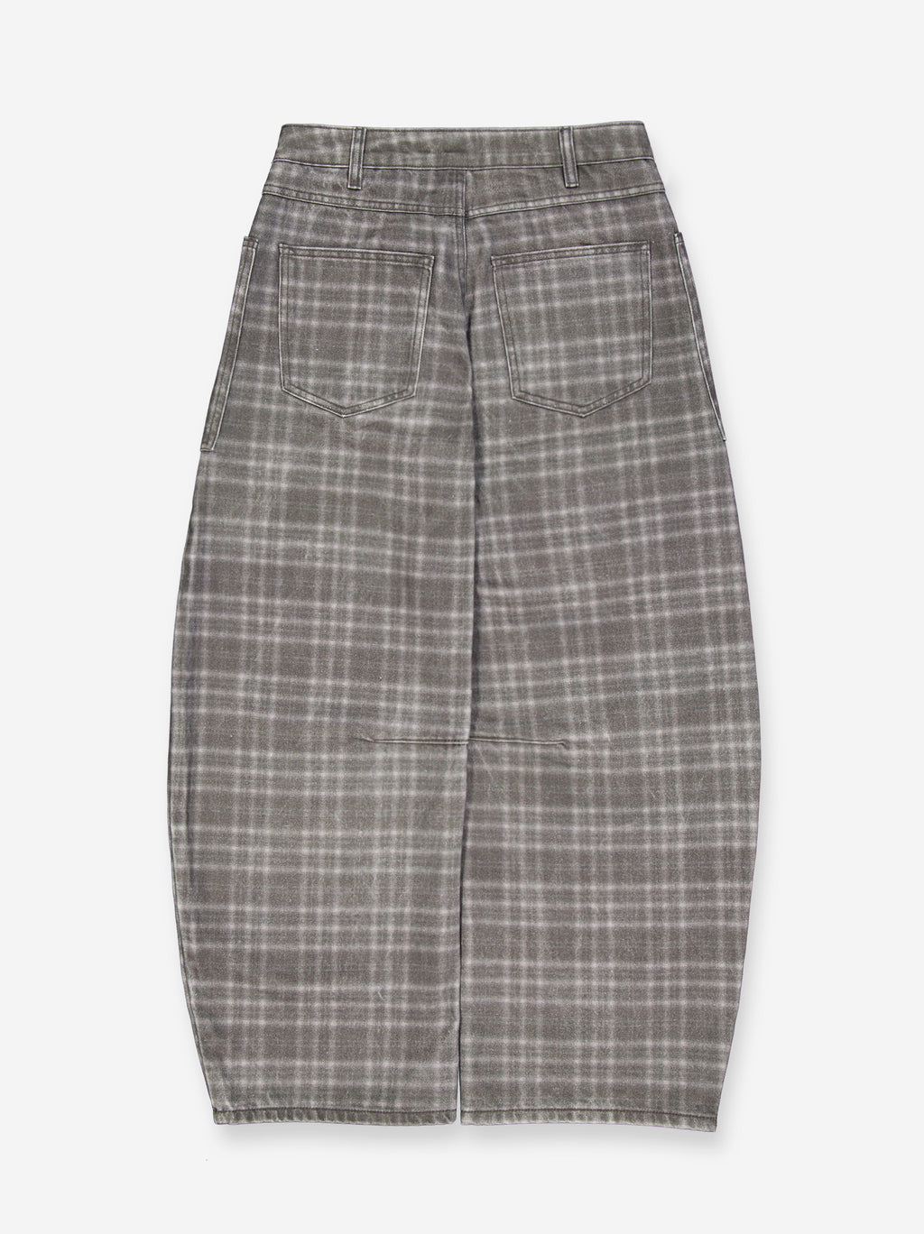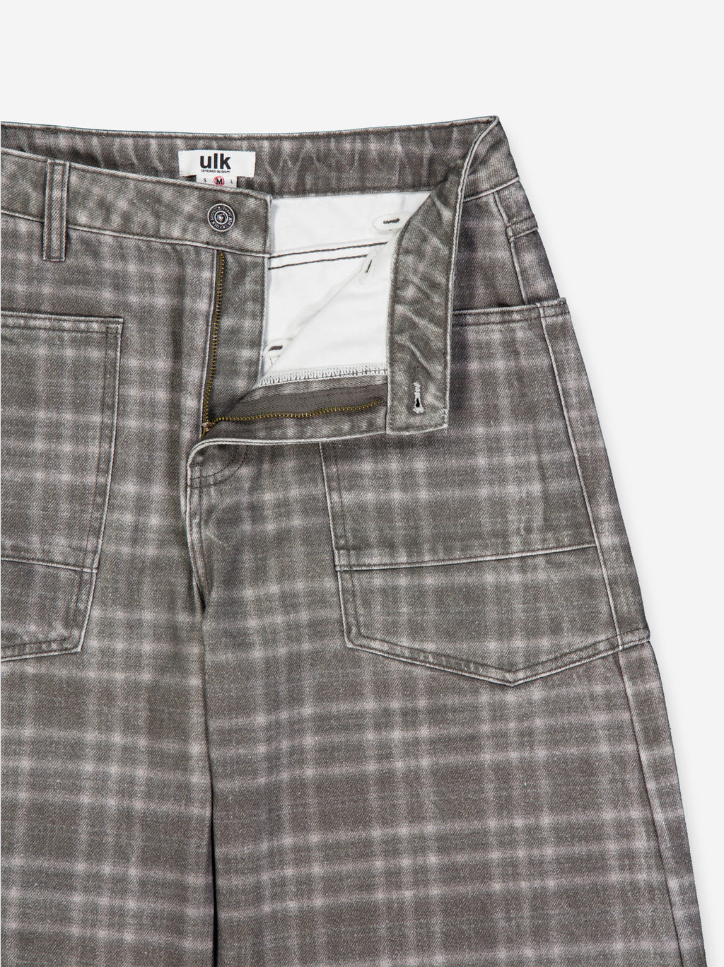 Jeans balloon de tiro medio estampado en tartán. Cuatro bolsillos. Detalle de costuras a la altura de la rodilla. Cierre frontal con cremallera y botón metálico.