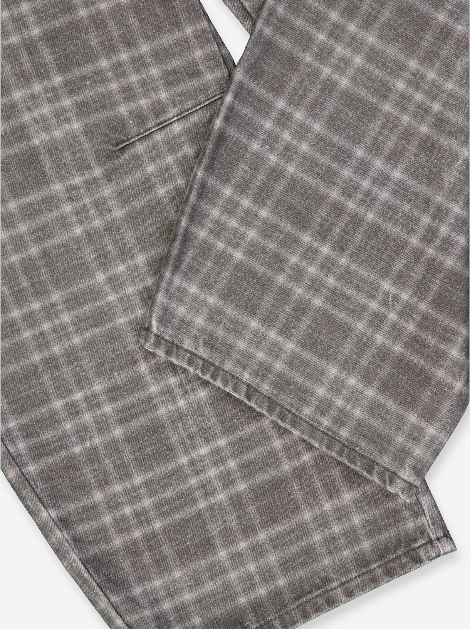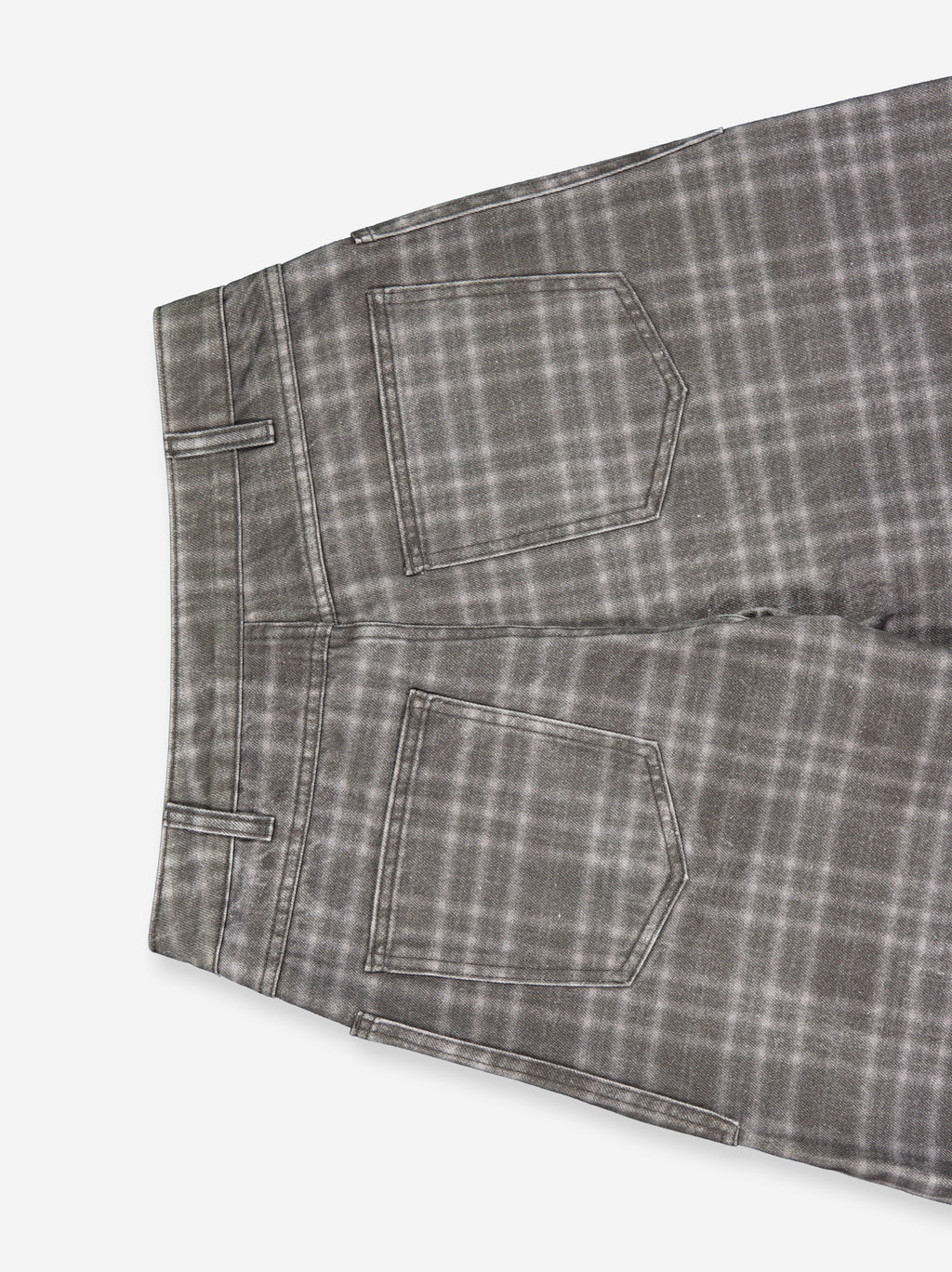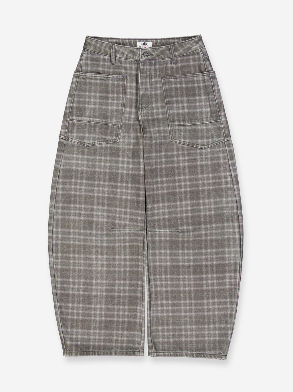Jeans balloon de tiro medio estampado en tartán. Cuatro bolsillos. Detalle de costuras a la altura de la rodilla. Cierre frontal con cremallera y botón metálico.
