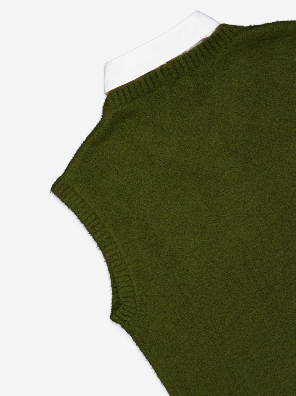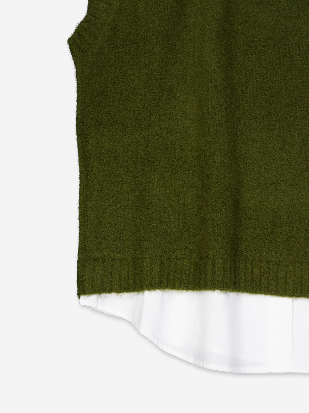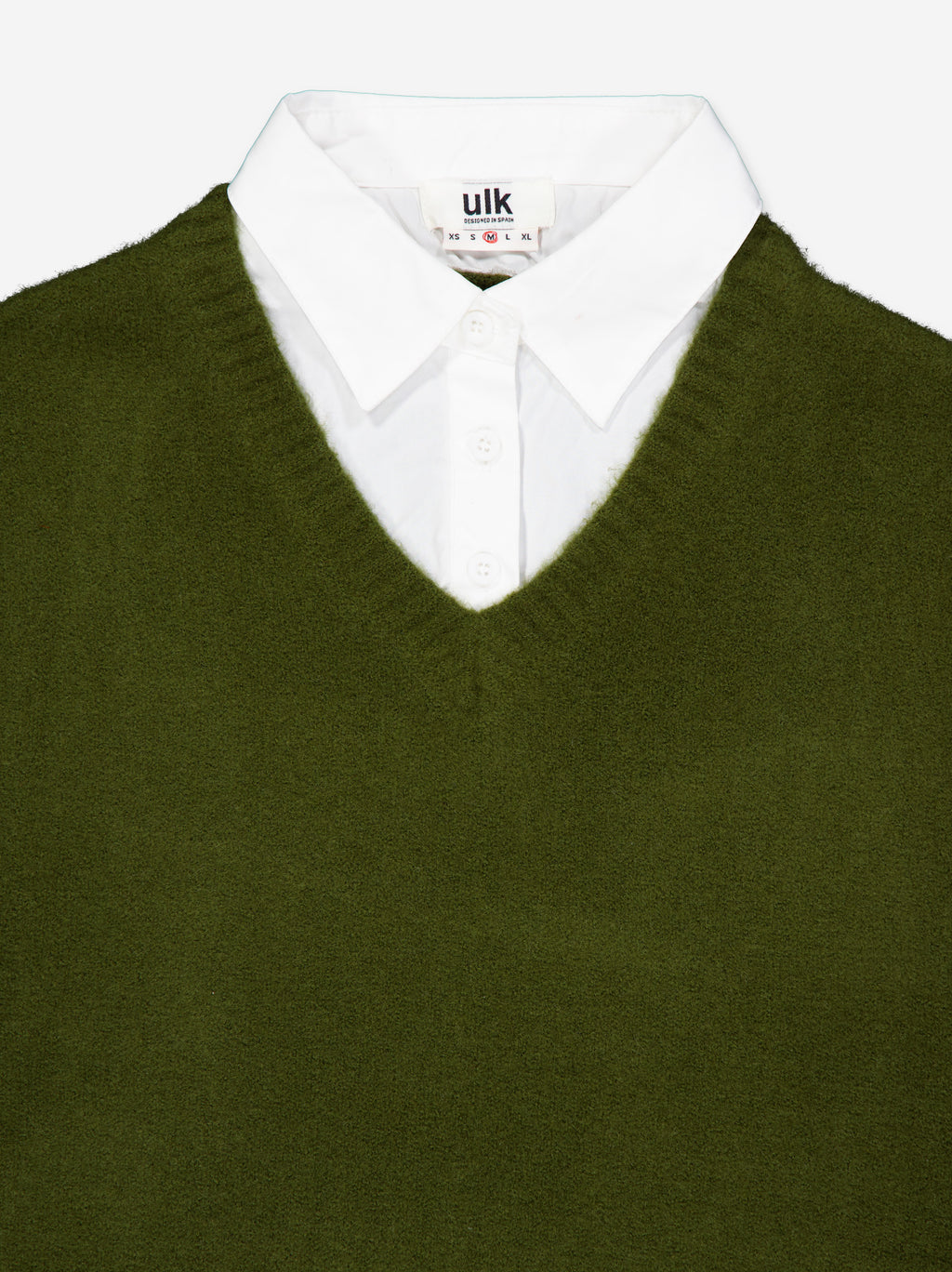 Chaleco punto liso con cuello de camisa y faldón. Cuello pico y manga sisa. Acabados en rib.