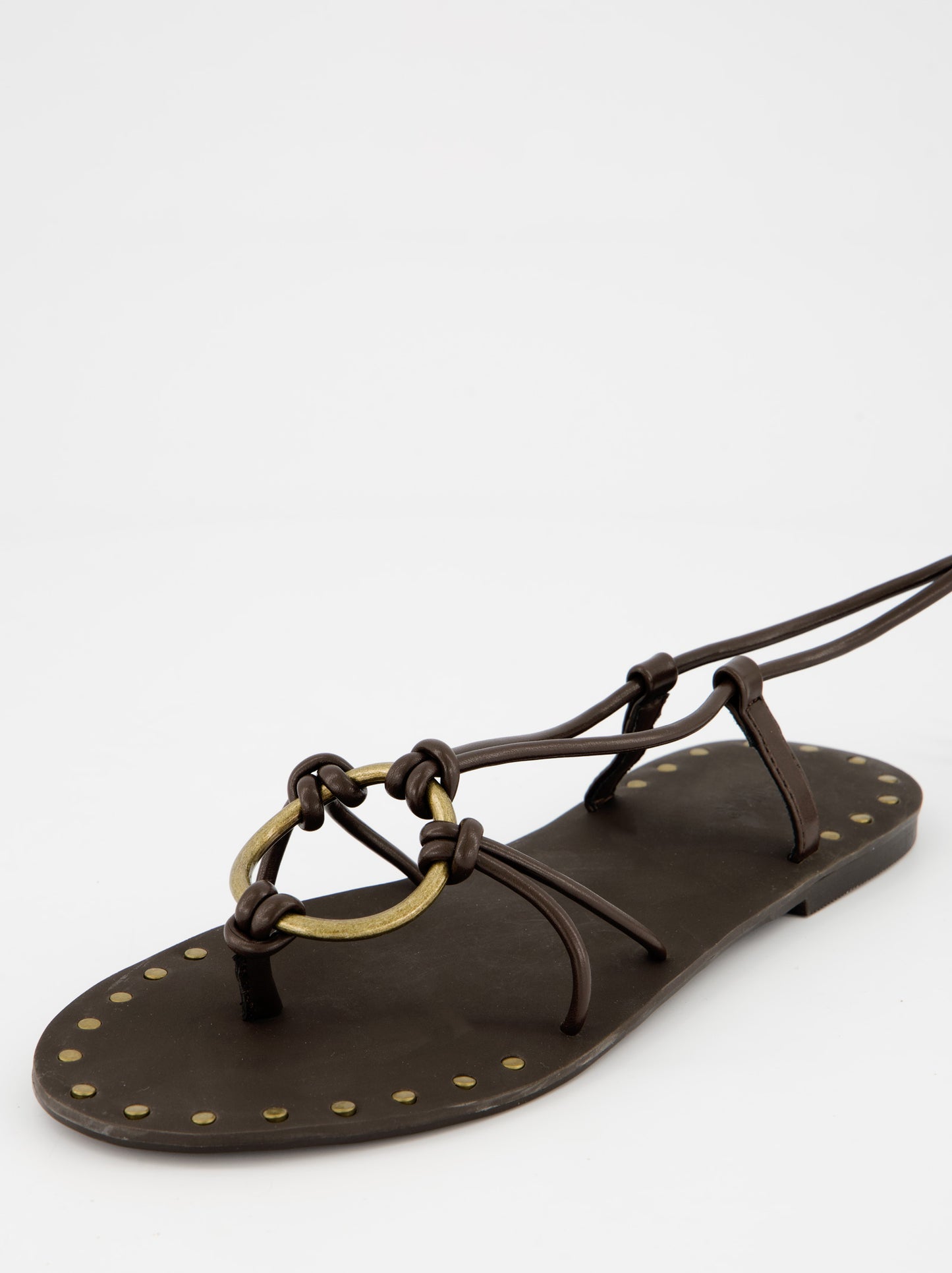 Sandalias planas de piel en color marrón. Diseño con tiras finas, anilla metálica decorativa en el empeine y suela con detalle de tachuelas. Perfectas para los días de verano, combinan comodidad y estilo en cada paso.