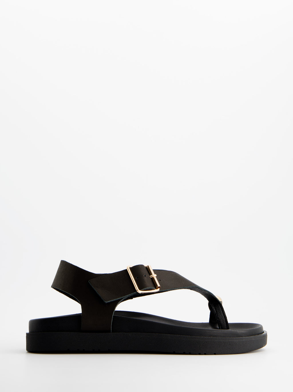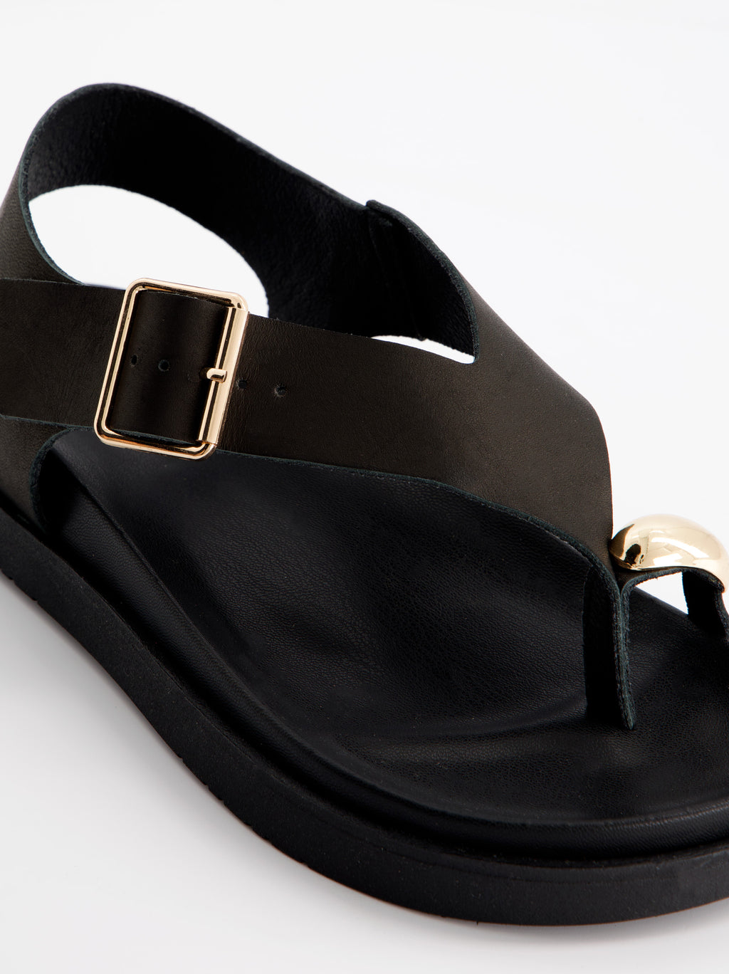 Sandalias planas con tiras cruzadas en el empeine y tiras para atar al tobillo con hebilla ajustable. Posición para el dedo con detalle metálico. Fabricadas en piel. Suela de goma de 3 cm.
