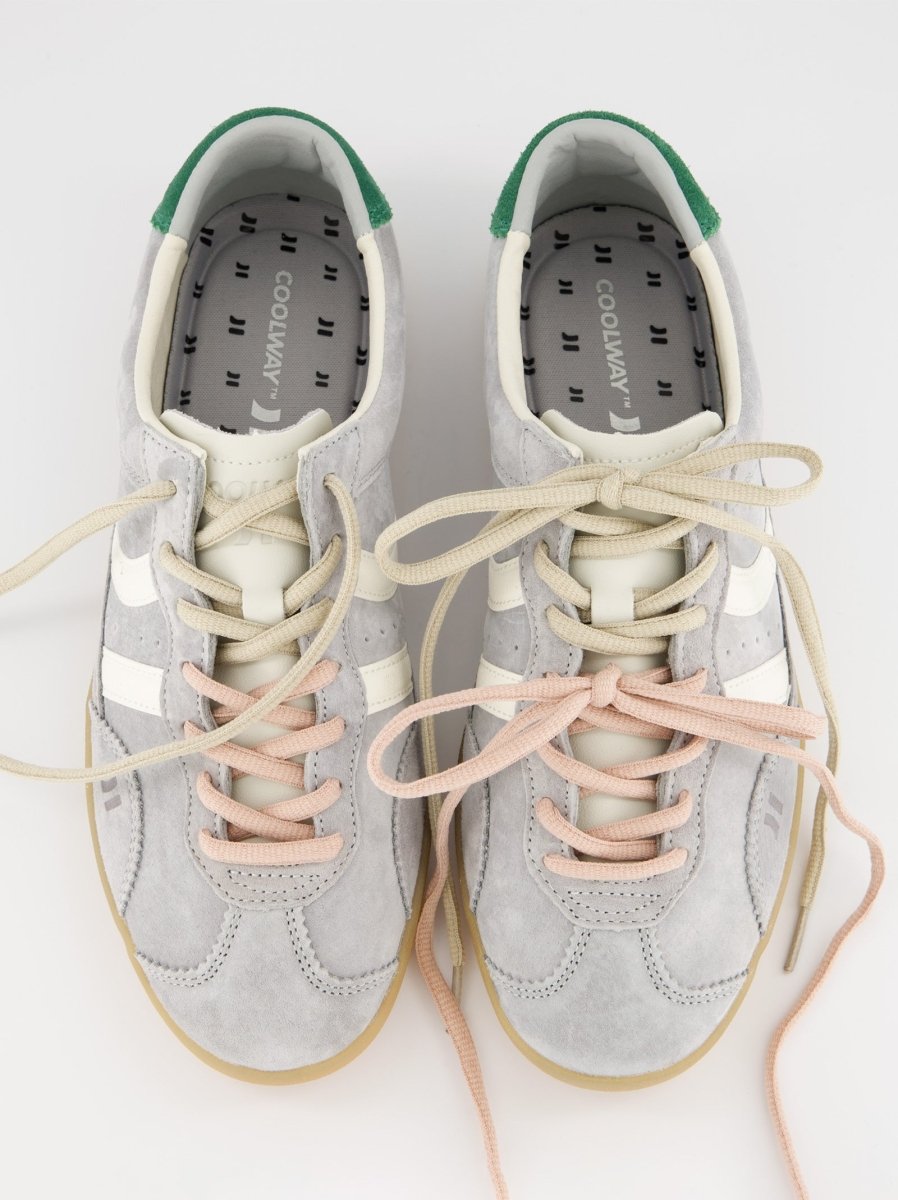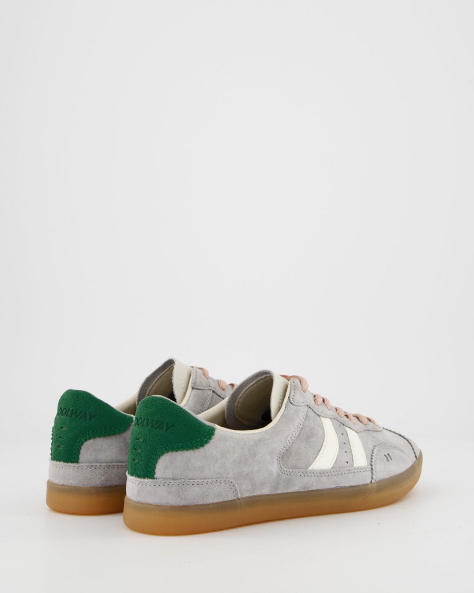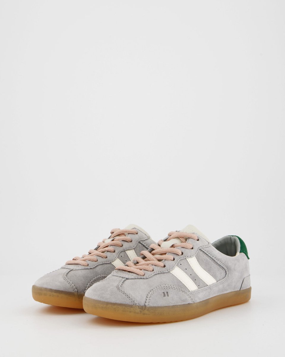 Zapatillas deportivas bajas de piel tipo serraje. Corte sencillo y clásico con cierre de cordones. La pieza de talón y el logo contrastan tanto por color como por textura. La plantilla de foam acolchada lleva impreso un diseño multilogo. El forro de piel contrasta en la parte trasera siguiendo el tono del corte. La suela de goma ligera en colores miel lleva un pespunte en la base que refuerza la unión entre el corte y la misma suela.