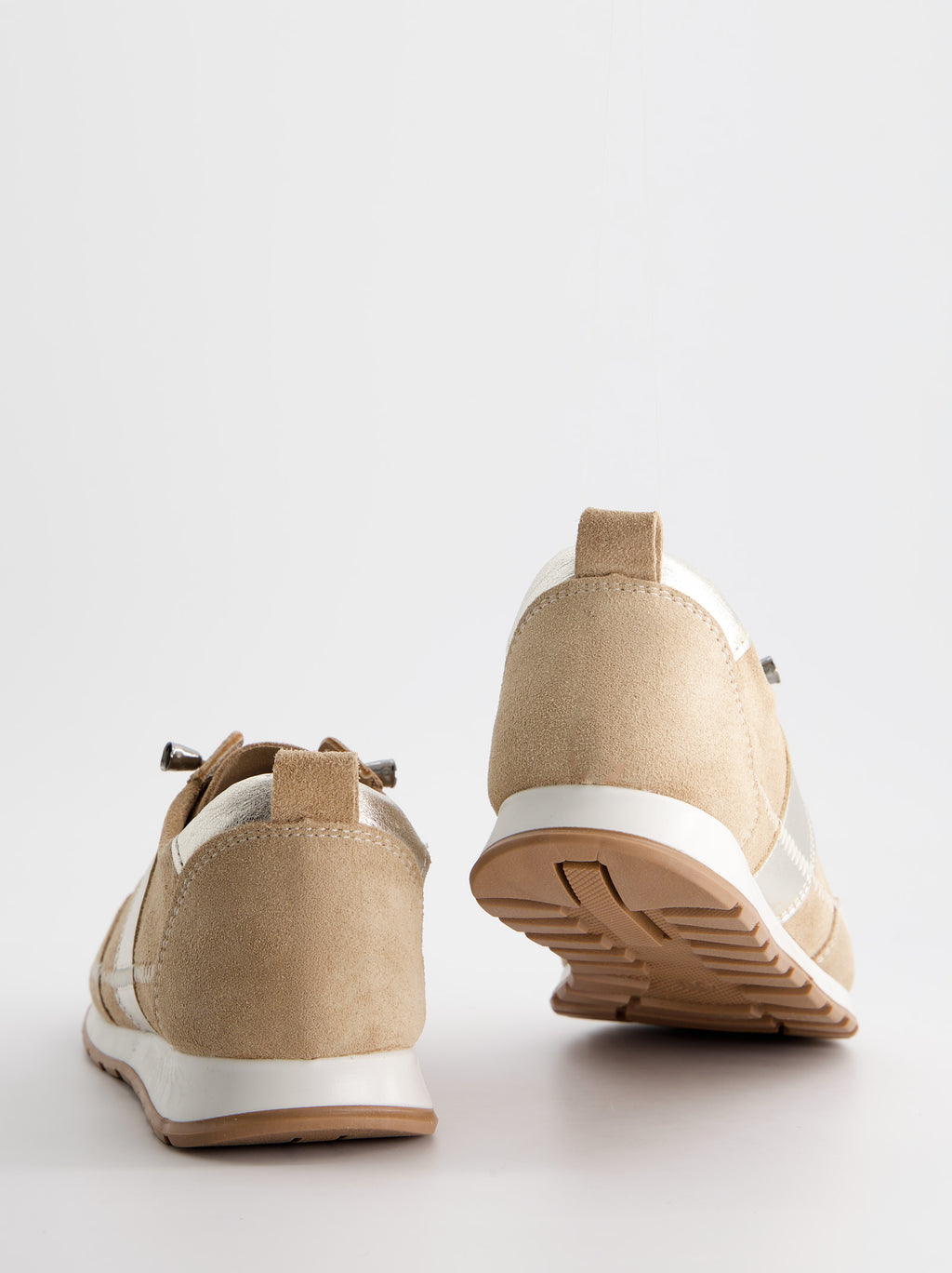 Eleva tu estilo casual con estas sneakers diseñadas en un sofisticado ante color arena con detalles metalizados. Destacan por su costura en zigzag vista y una silueta retro running que fusiona comodidad y tendencia urbana. Cuentan con un cierre de cordones elásticos con topes técnicos y una suela track bicolor con excelente tracción. Perfecto para looks versátiles, aportando una estética artesanal y moderna a cualquier outfit diario. Suela de 2 cm.