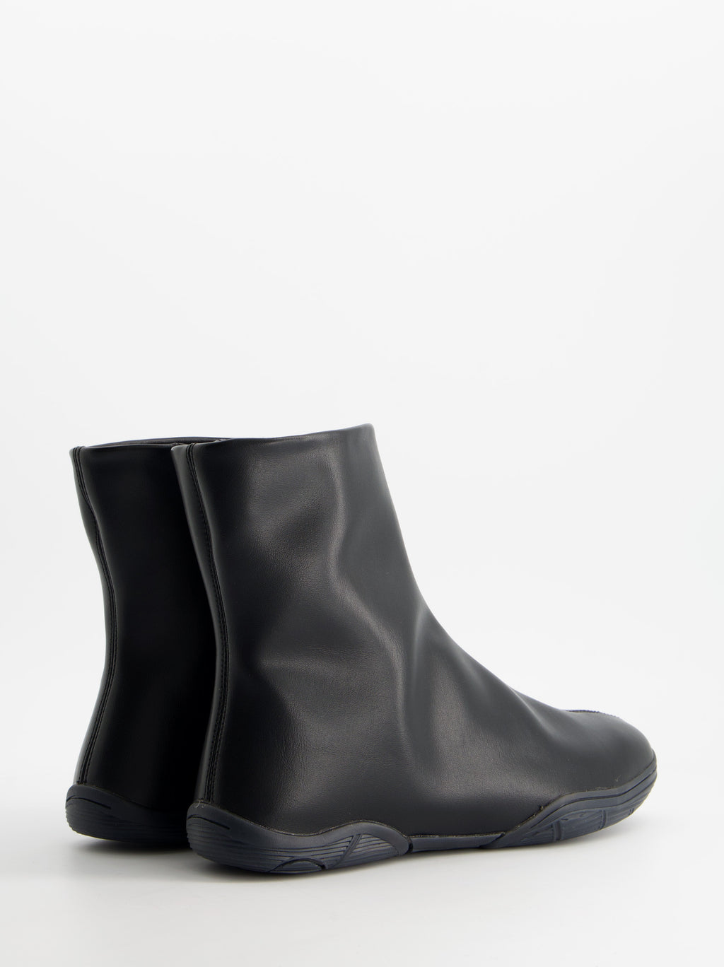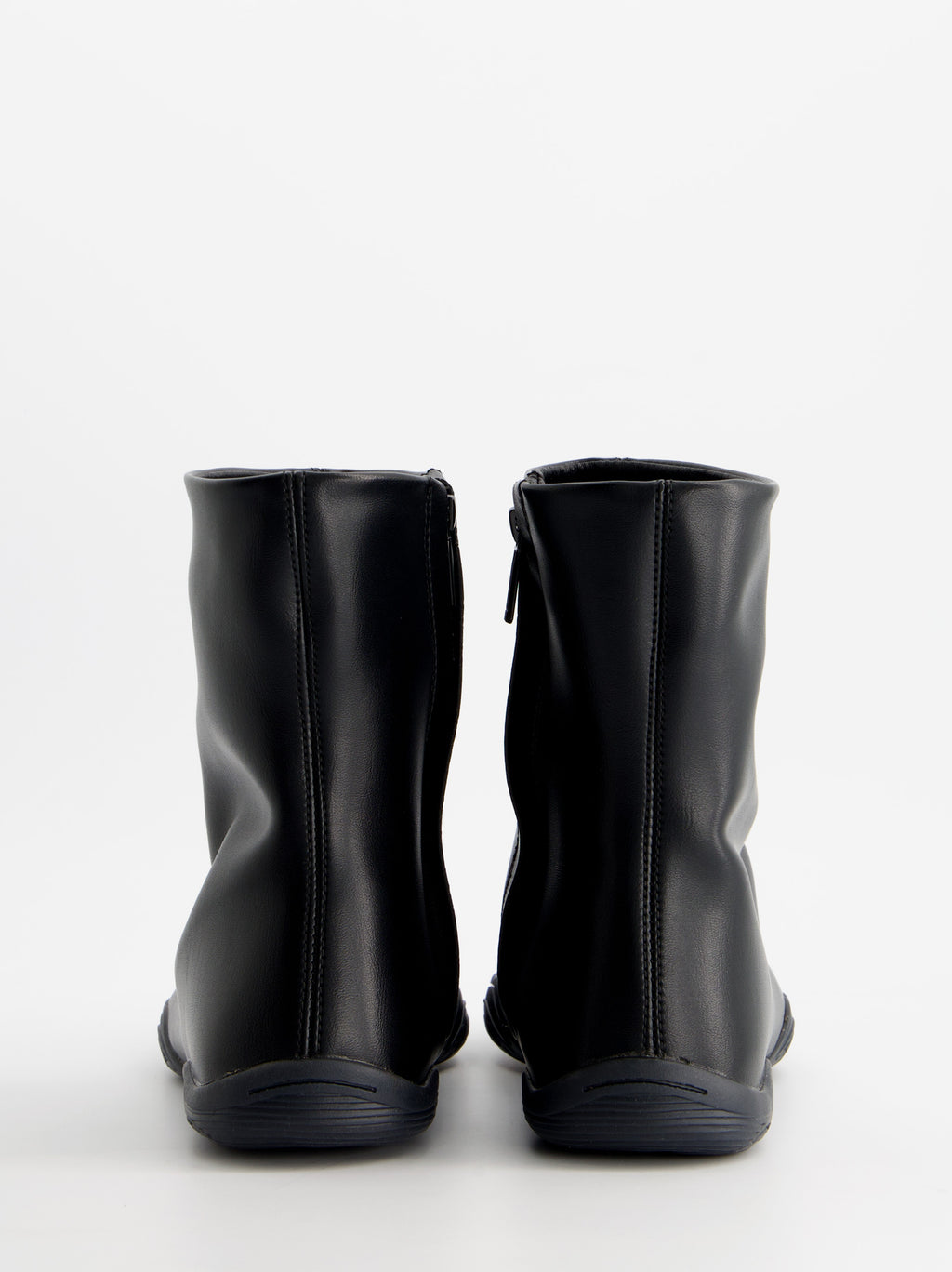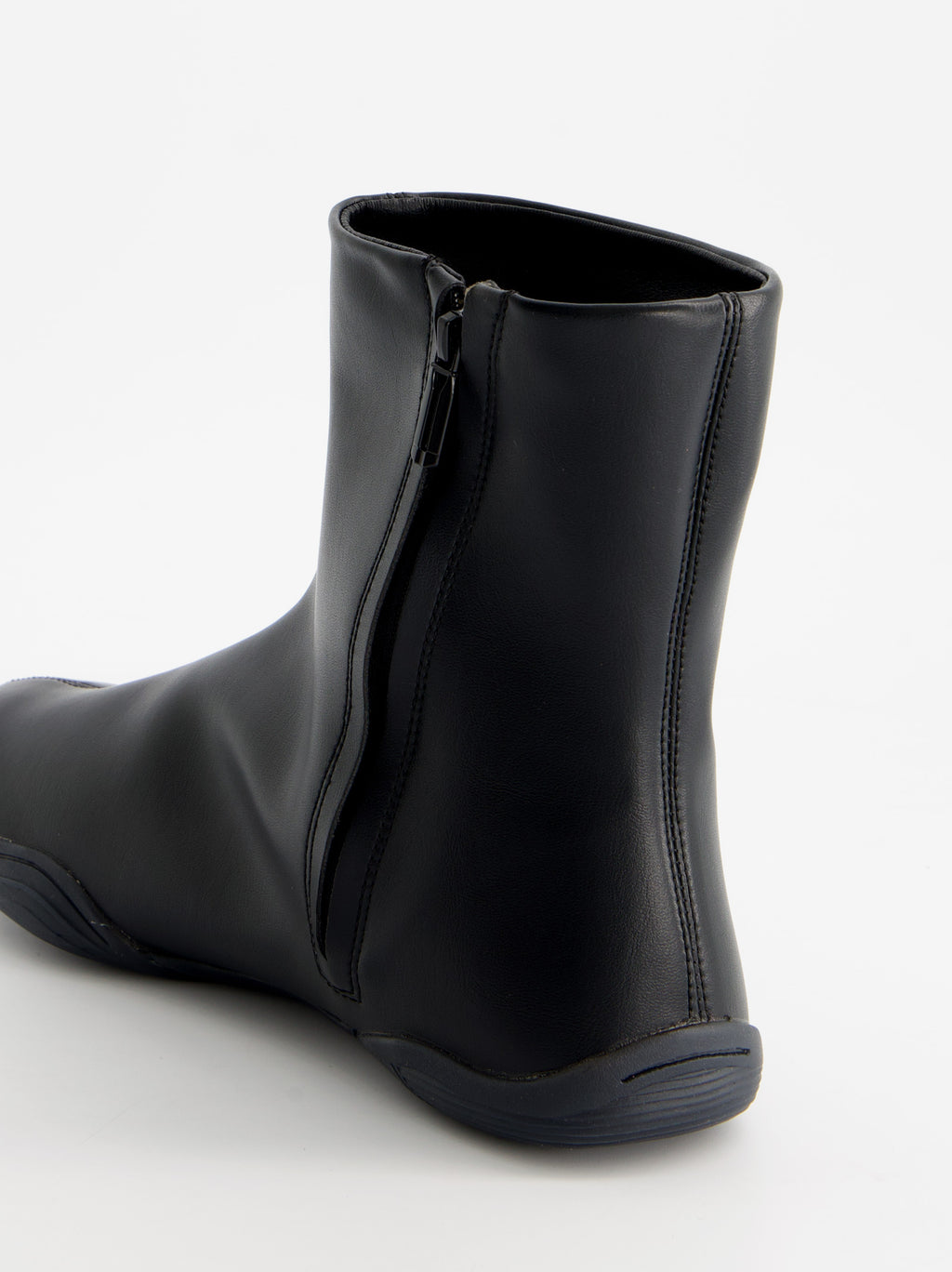 Botín plano de piel. Suela de goma. Cierre con cremallera lateral. Acabado en punta redonda.
