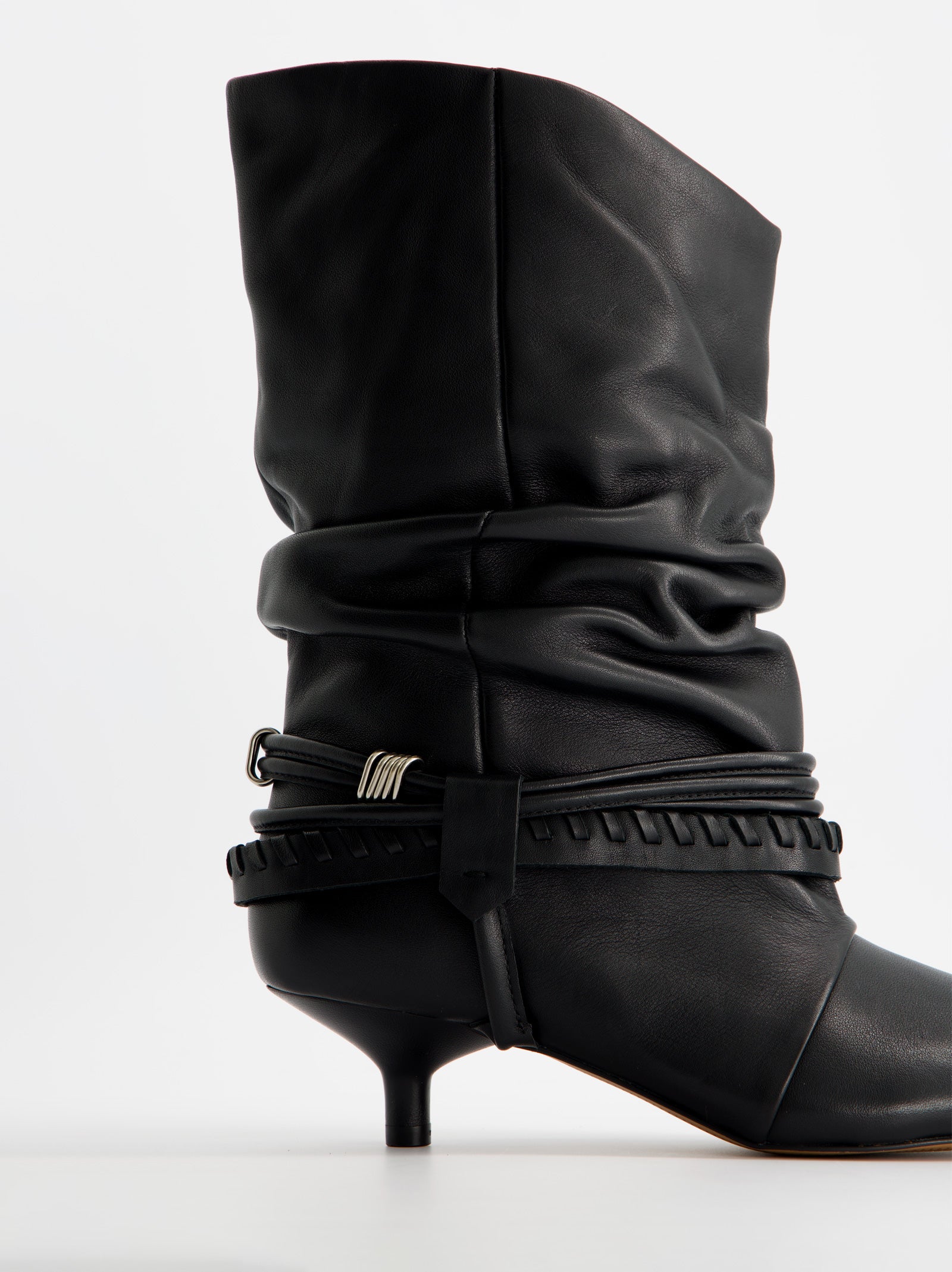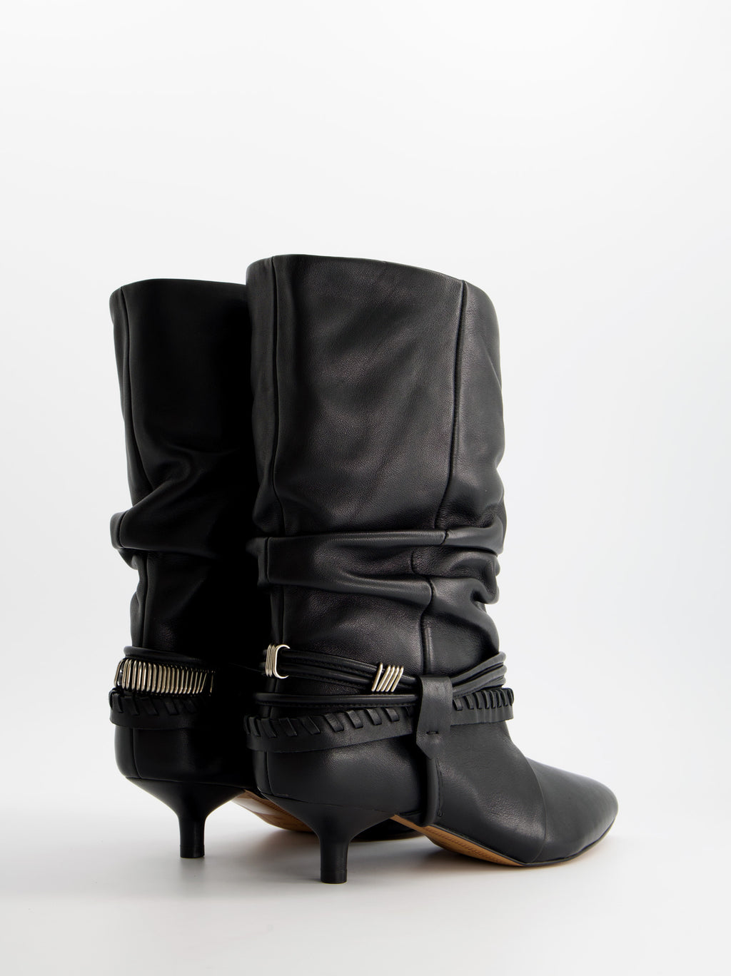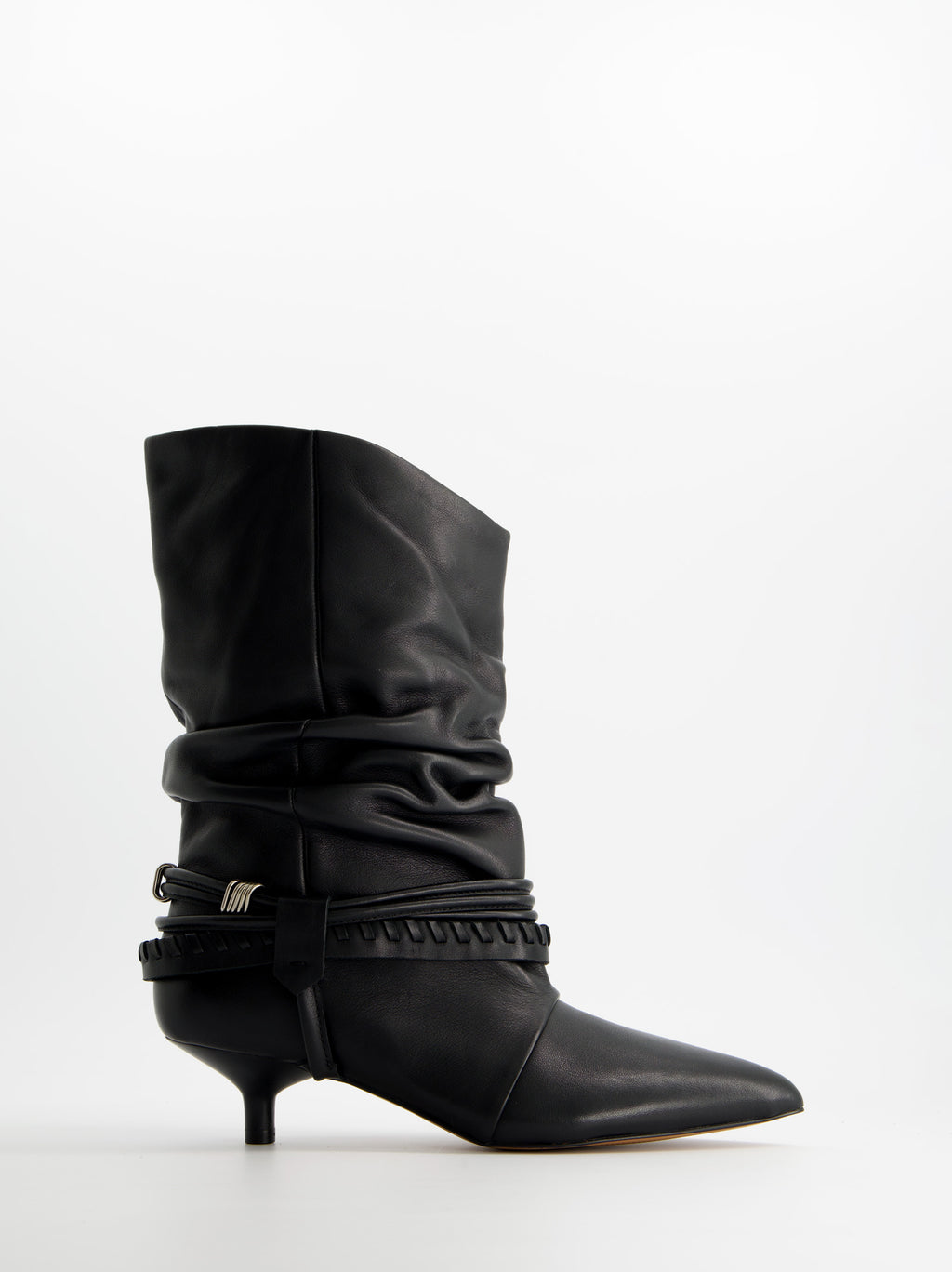 Botín de piel estilo boho con tacón kitten de 3 cm. Tiras decorativas con trenzados y elementos metálicos decorativos. Acabado en punta.