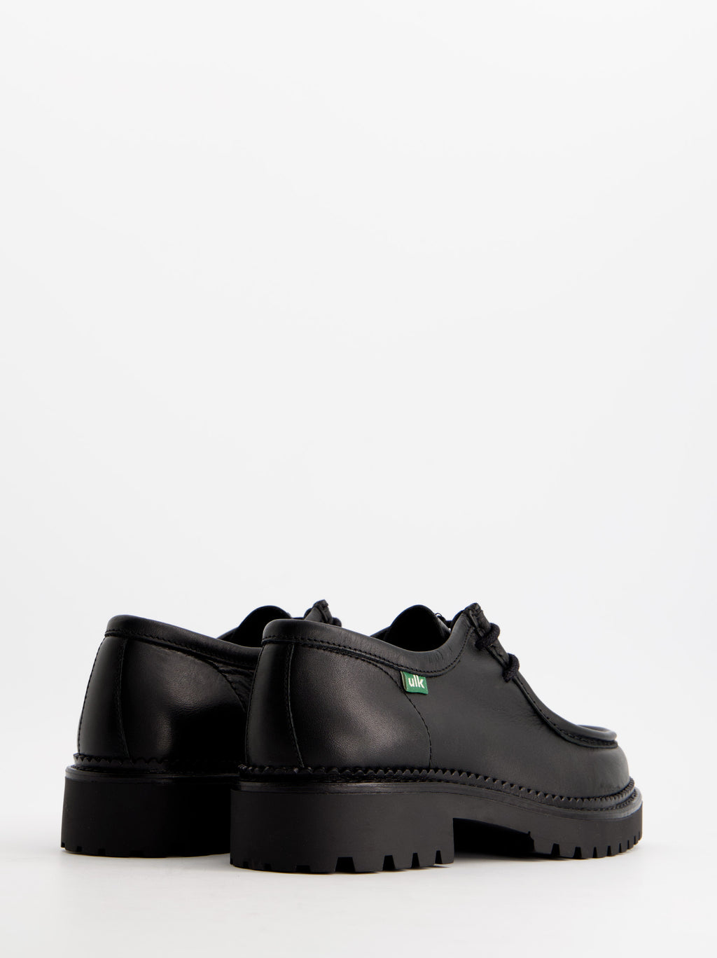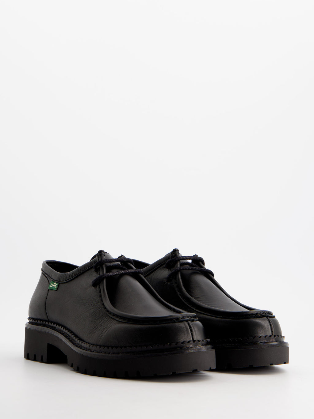 Mocasines negros de piel para hombre tipo Derby. Diseñados para combinar elegancia y modernidad. Cierre frontal acordonado. Suela de 3 cm.