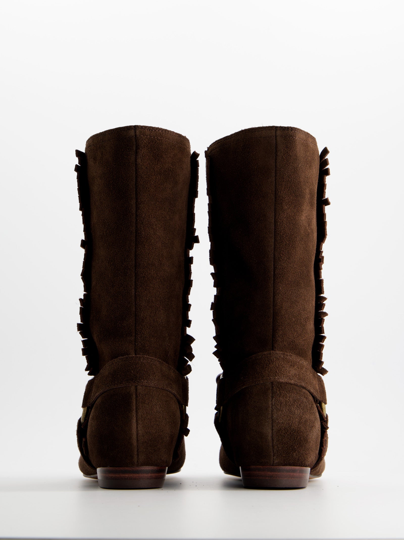 Flat suede ankle boot with boho-style decorative embroidery and colorful studs. Decorative side fringes. Mid-calf length. Rubber sole.