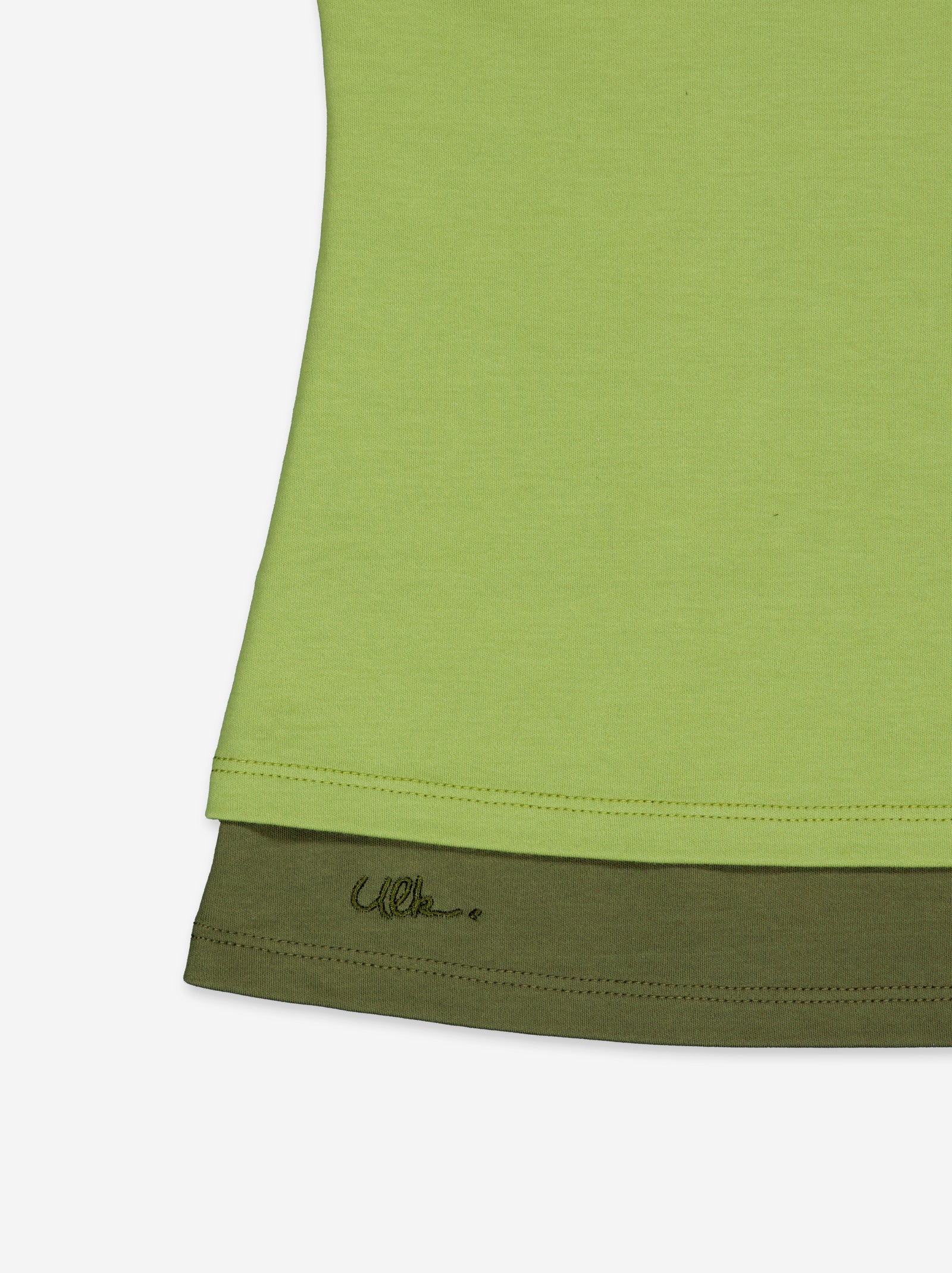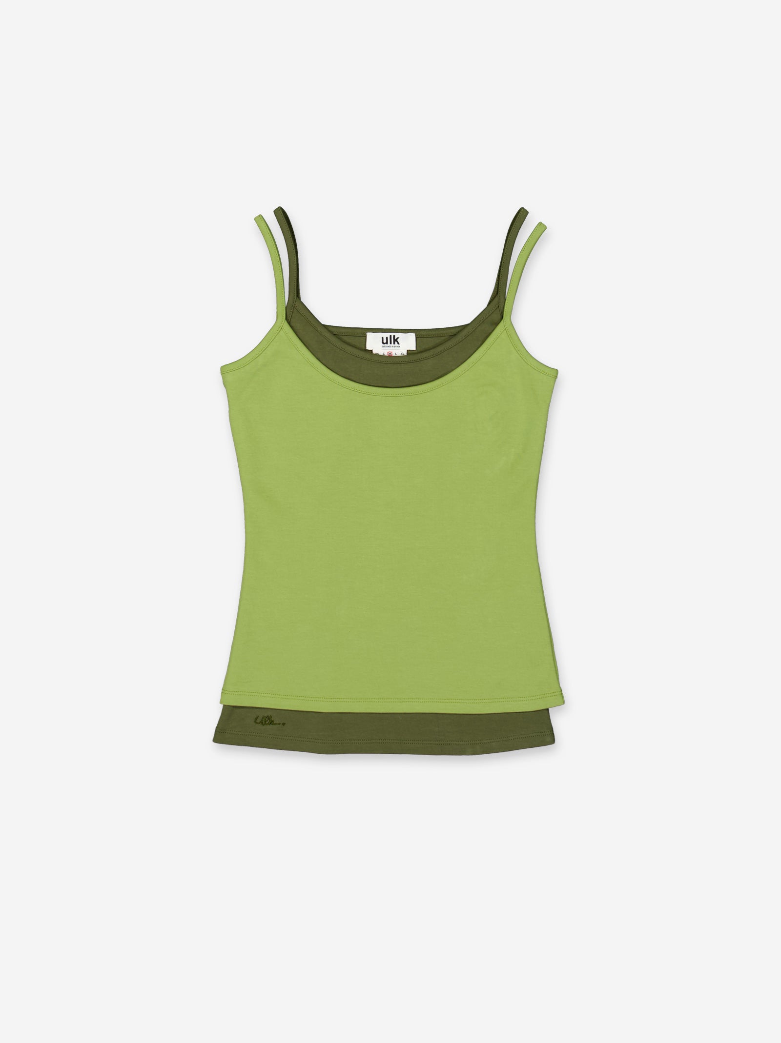 Contrast-color fitted double-breasted top with a round neckline and straps.
