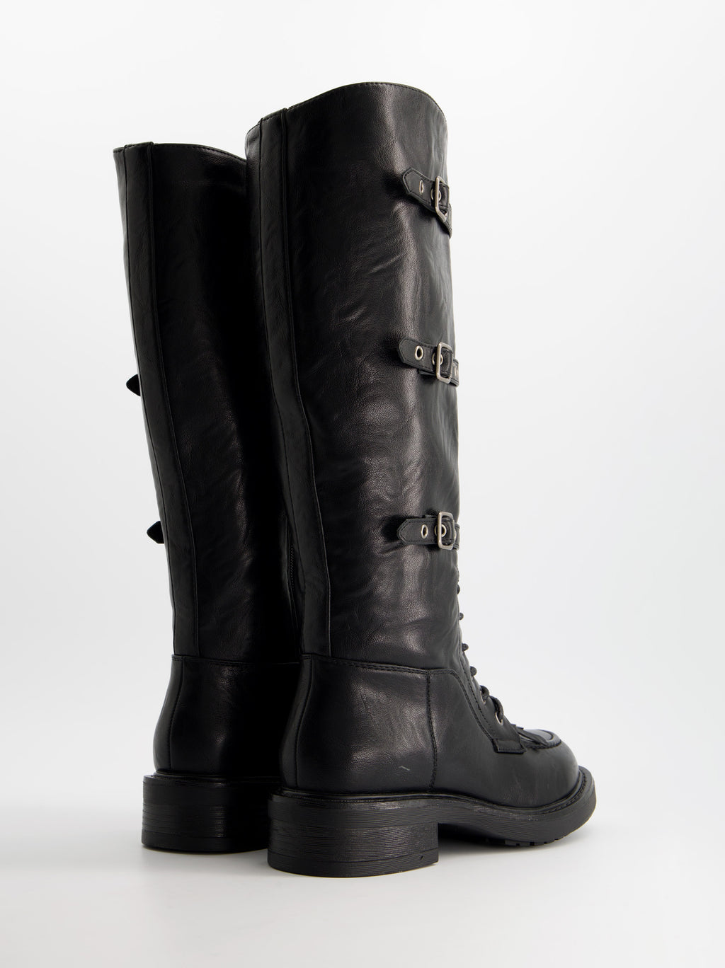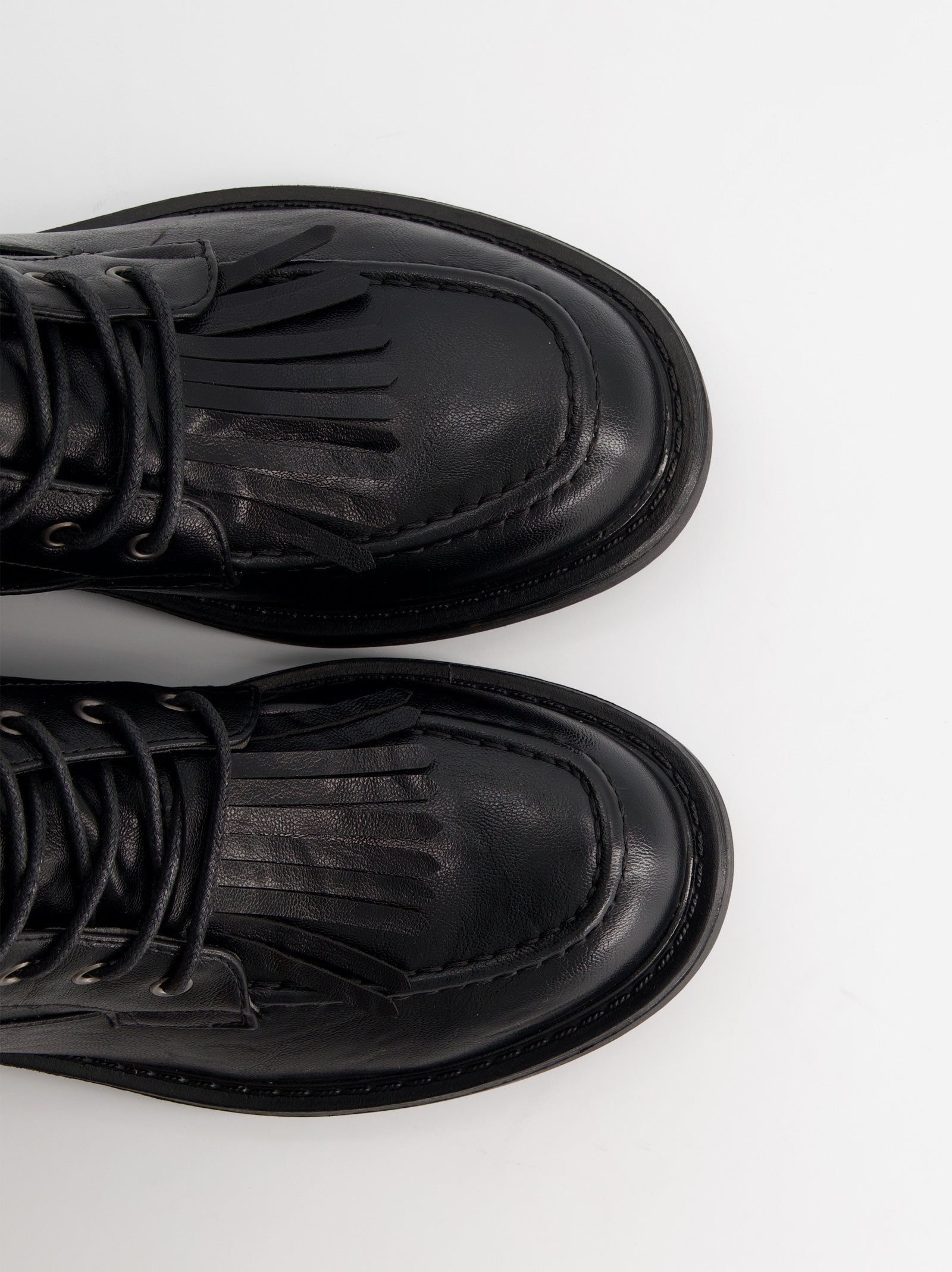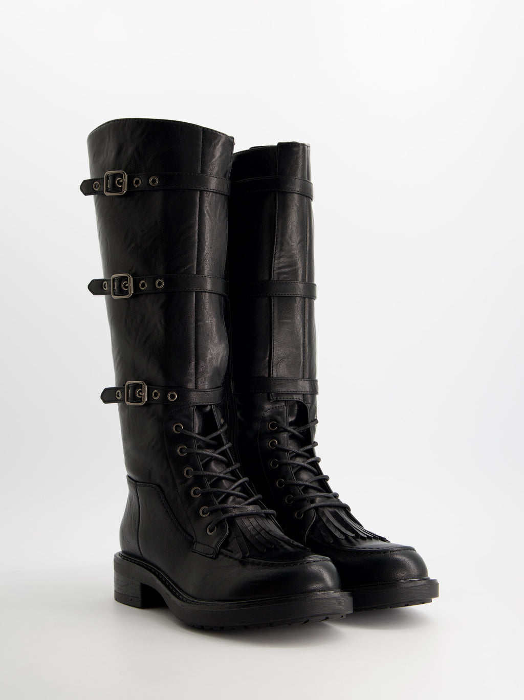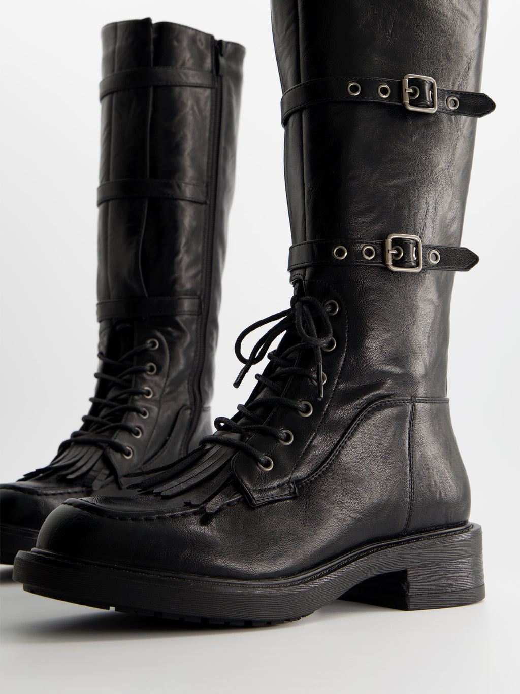Military-style high boot made of synthetic leather. Decorative buckles and fringes. Lace-up closure with side zipper. 3 cm rubber sole.