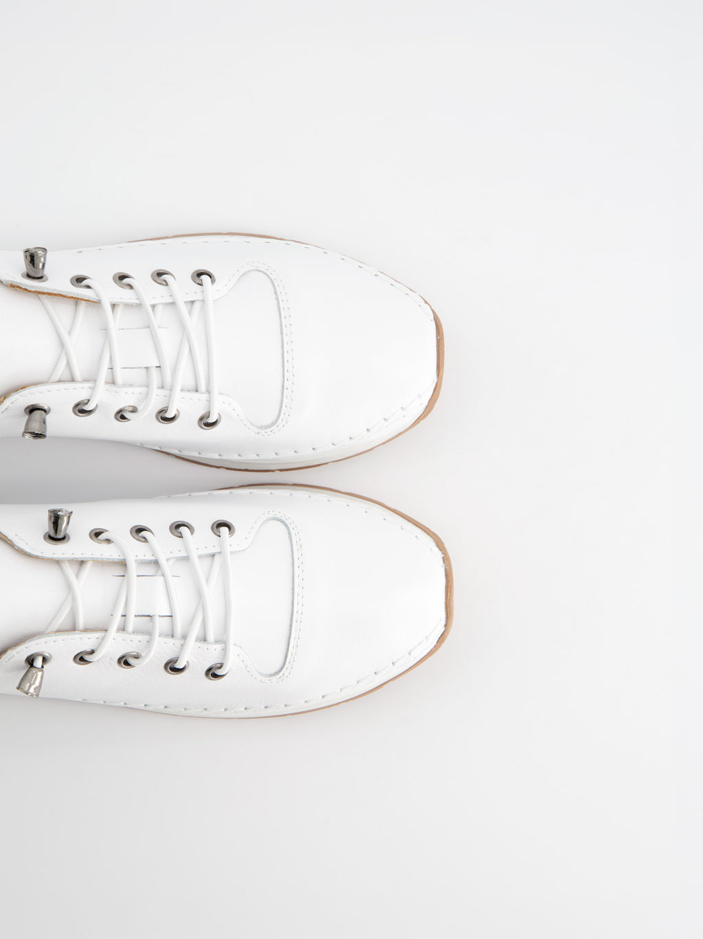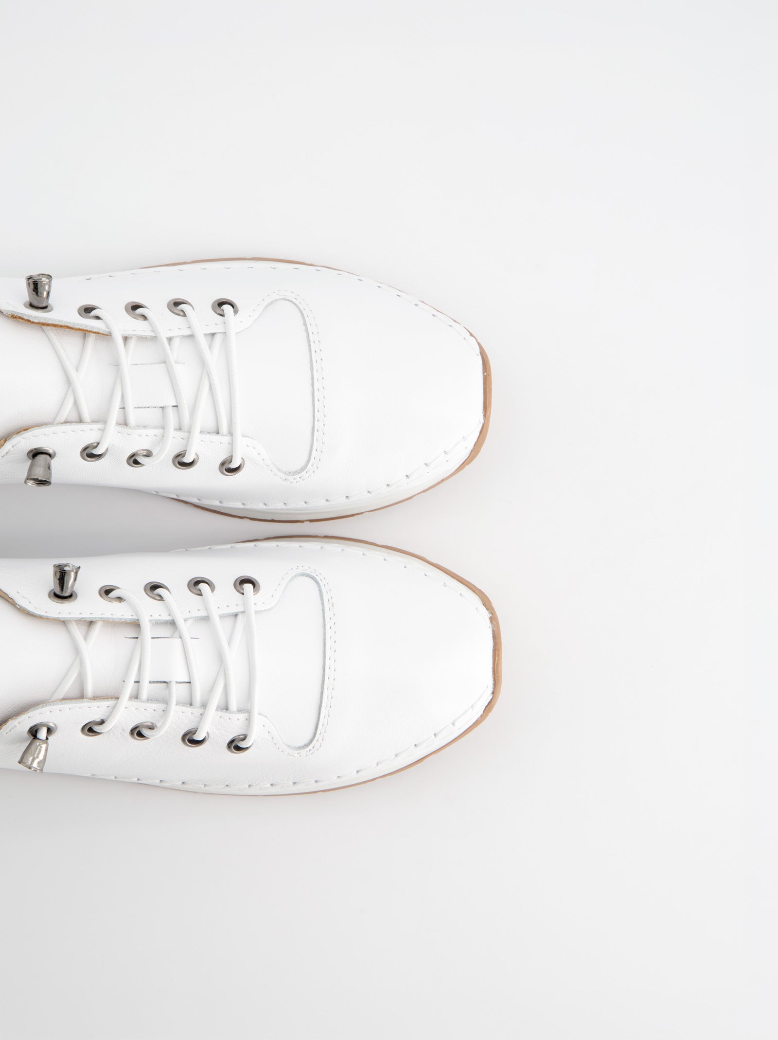 White leather sneakers. They stand out for their 2 cm caramel-colored serrated sole and decorative perimeter stitching that adds a handcrafted touch. They feature elastic quick-adjust laces with metal stoppers for a comfortable and fast fit. The interior and insole ensure maximum comfort and durability with every step. A versatile and modern shoe perfect for any occasion.