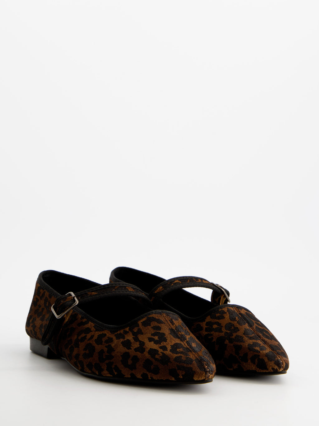 Pointed Mary Jane-style ballet flats with a leopard print. Made of leather. A sophisticated, elegant, and minimalist design ensures a clean and comfortable silhouette. A strap fastens over the instep with a metal buckle. 1 cm sole.