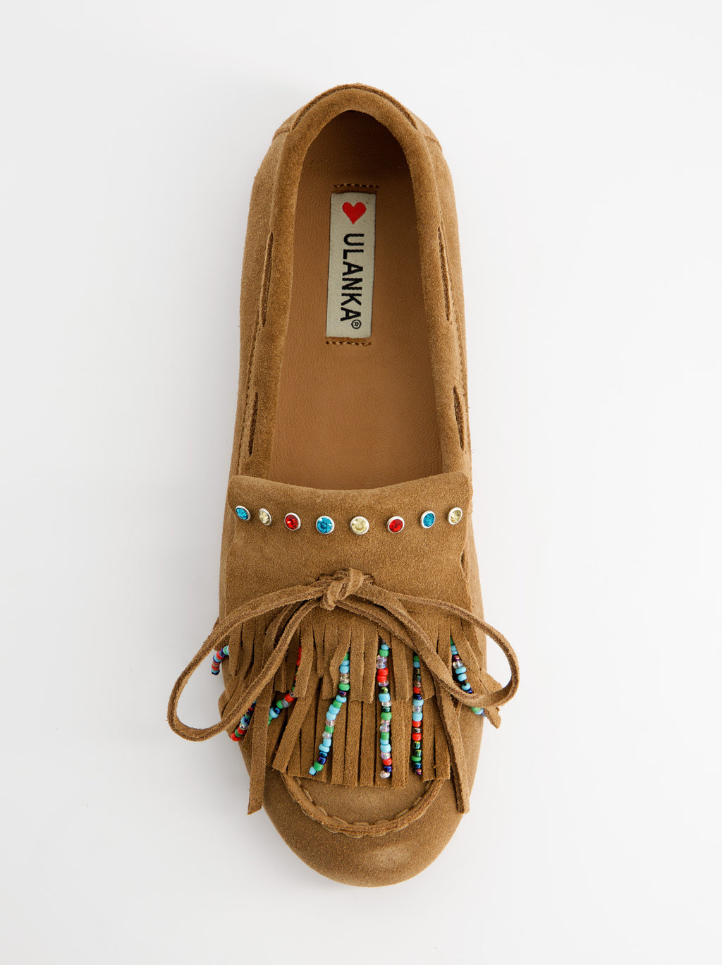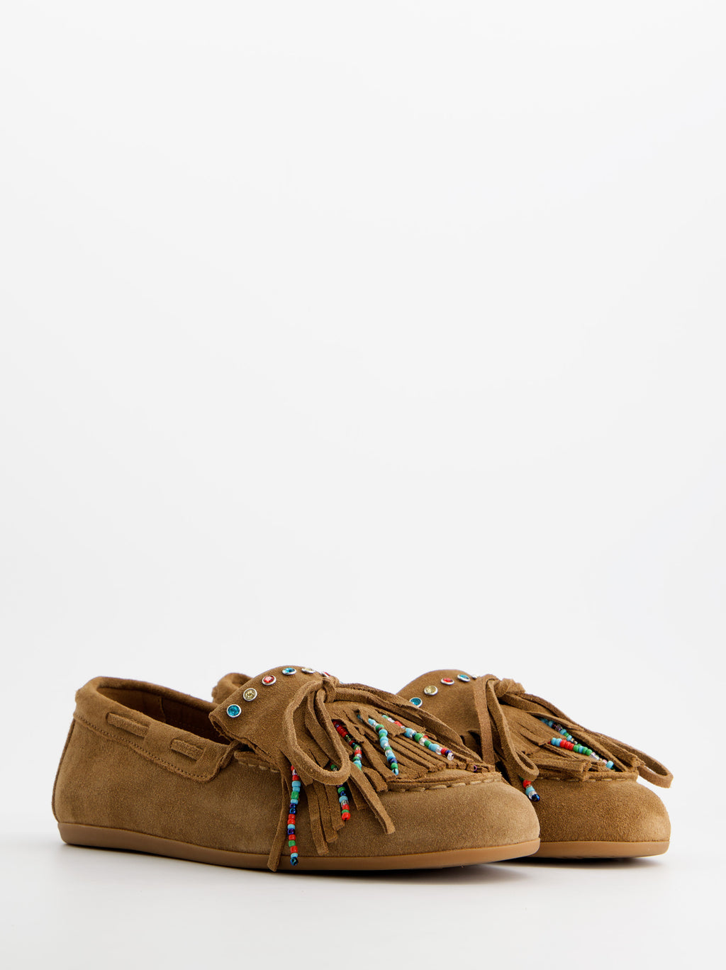 Brown nautical loafers. Designed with boho-style fringes. Made of suede. Lace-up closure. 1 cm flat sole.