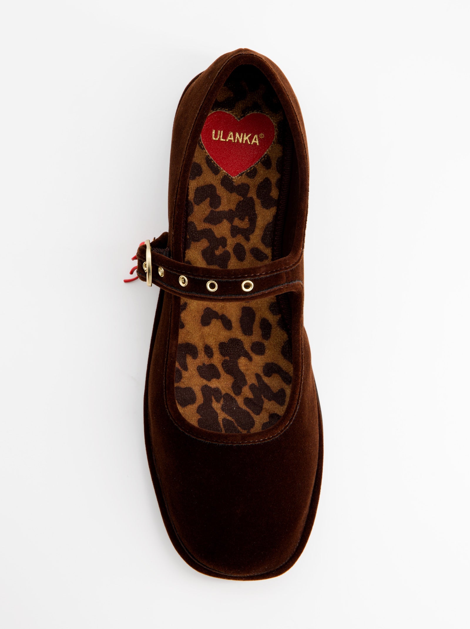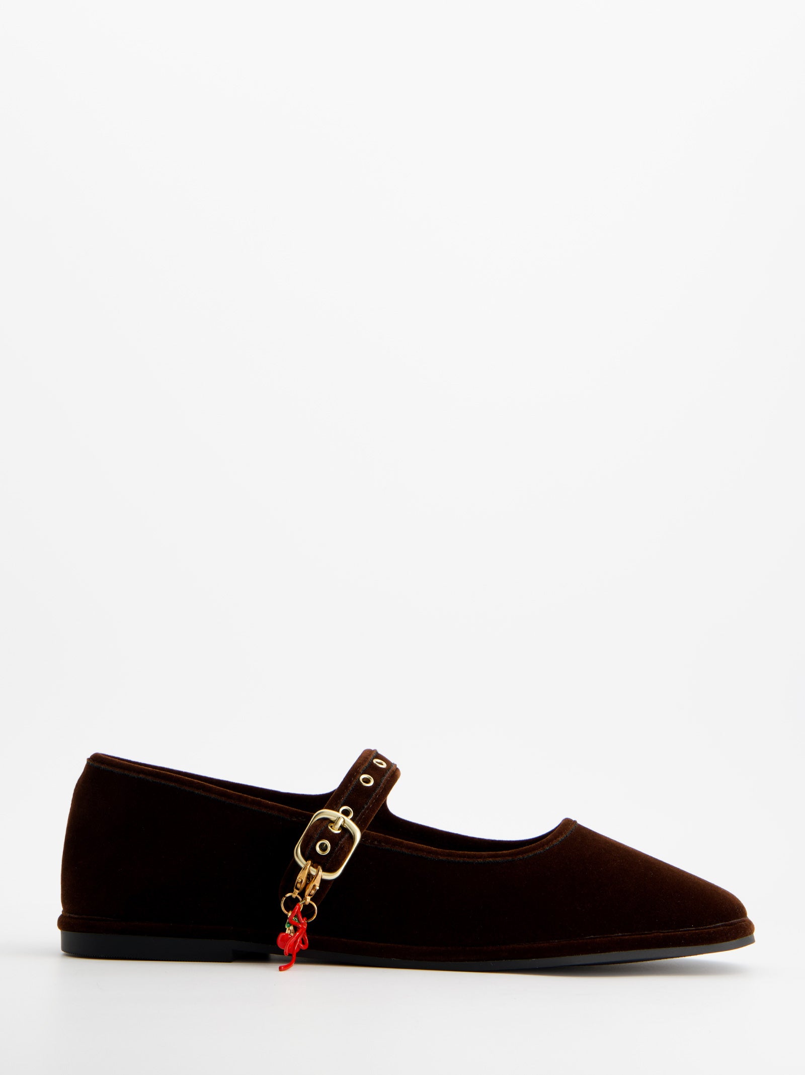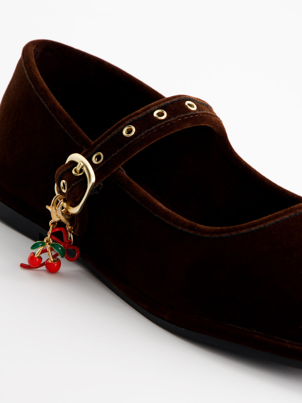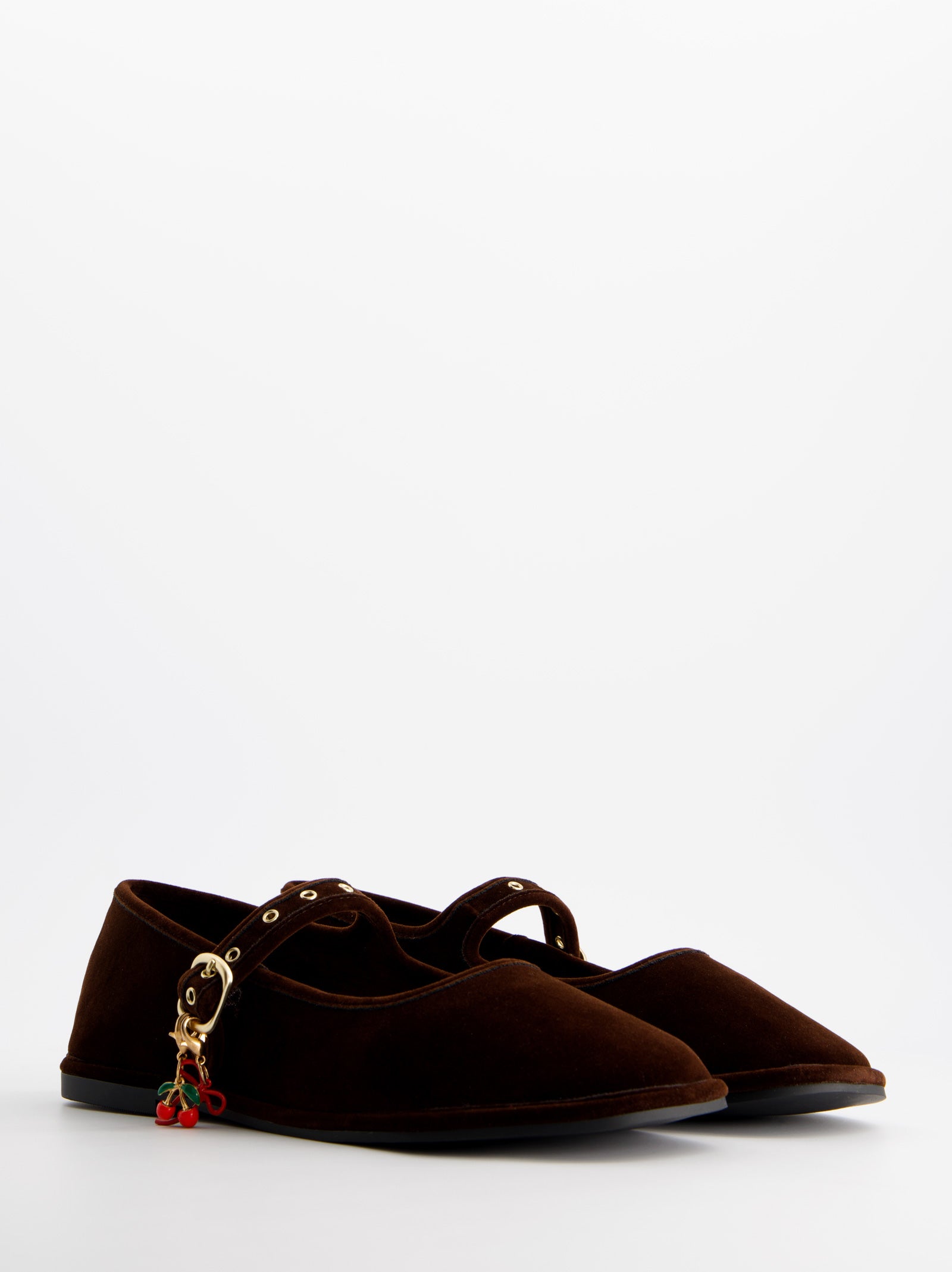 Velvet-effect Venetian blinds with adjustable buckle closure and decorative charms. Flat sole.