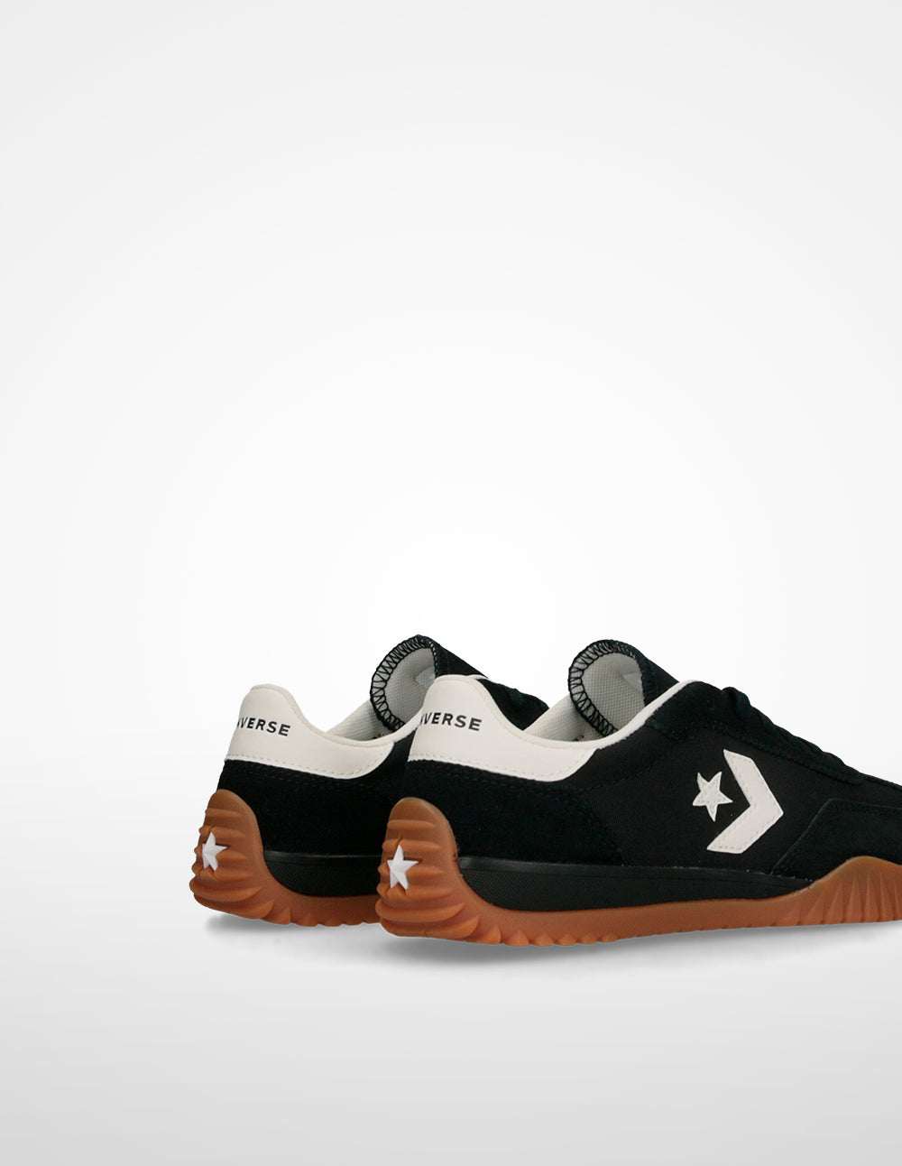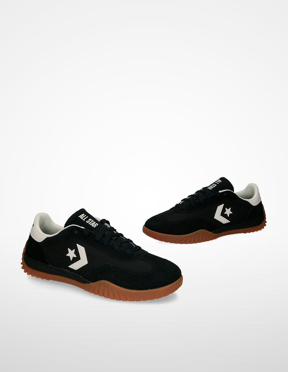 Meet the Run Star Trainer, a tribute to Converse sport, style and heritage. Sleek details and cushioning pair well with your favorite outfits from day to night. Durable nylon upper with suede overlays and leather details for a sophisticated design. 3-layer memory foam insole provides a comfortable, cushioned ride that contours to your foot. Rubber outsole with traction for grip. Premium details like perforated eyelets and waxed laces. Iconic star and chevron, All Star and Converse logos. Black sneakers.