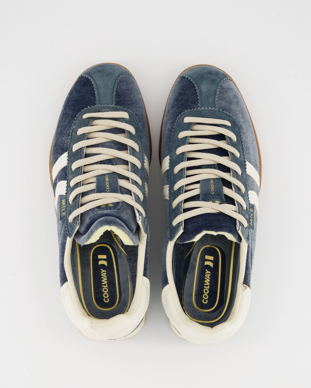 Retro-style sneaker with a thin velvet sole and contrasting color details. Semi-transparent, foam-padded tongue. Leather lining visible. Interchangeable two-tone oval laces. Lightly padded collar. Flexible rubber sole for durability and grip, and a Phylon midsole for lightness and comfort. Features the "MILE" model name on the side in antique gold.