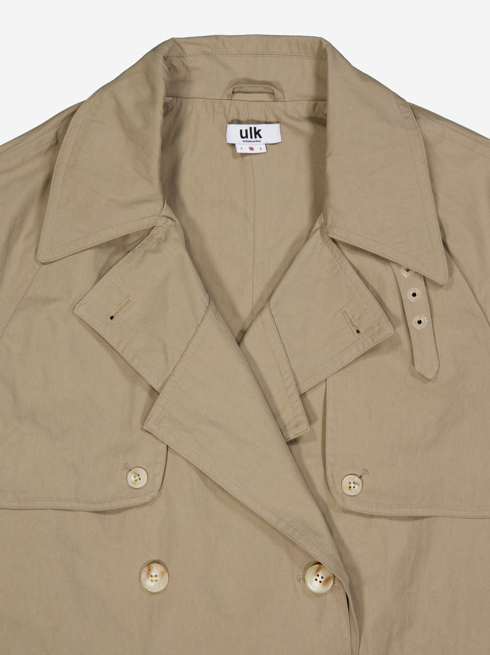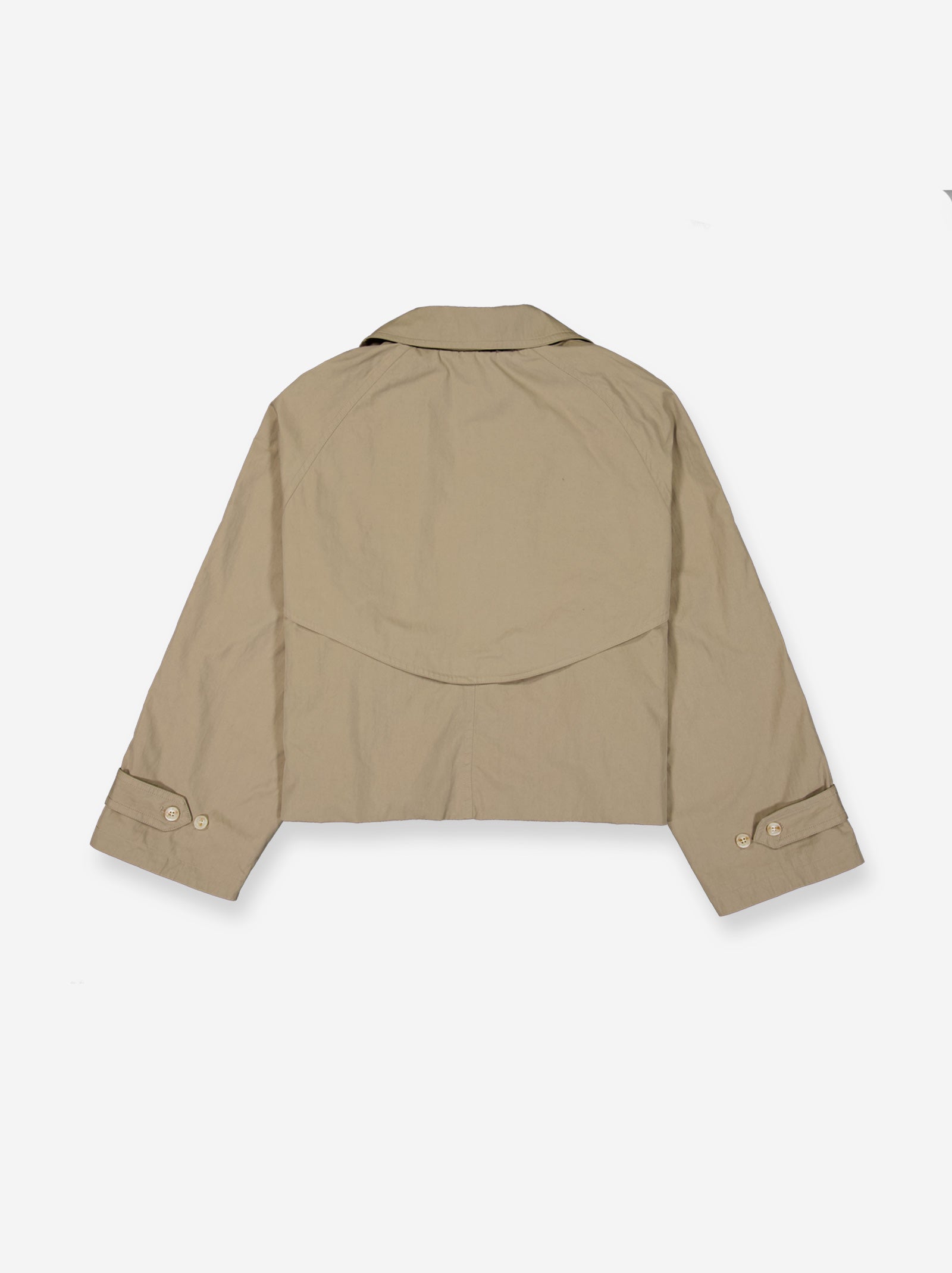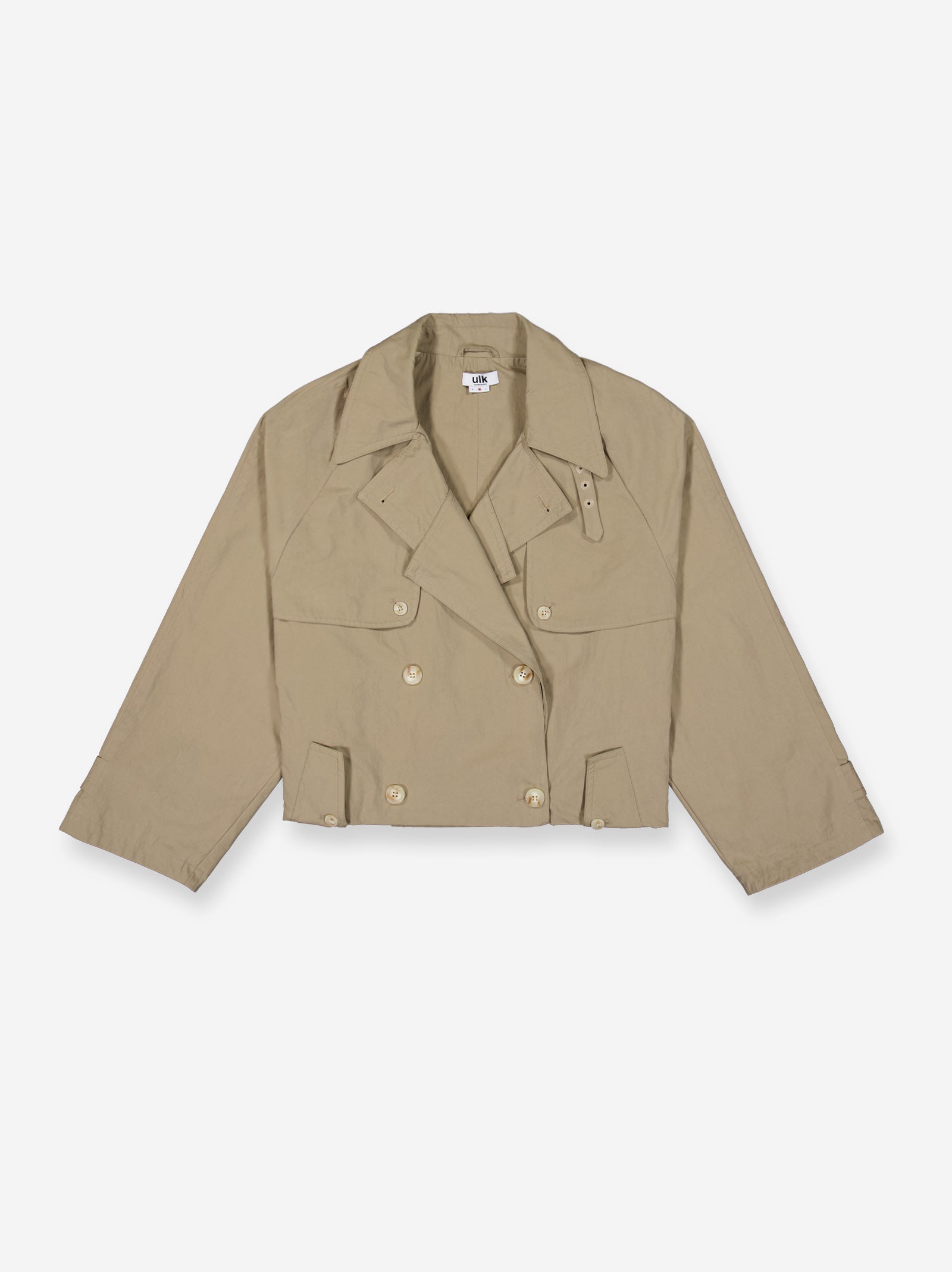 Cazadora estilo gabardina de corte cropped. Cierre frontal abotonado cruzado y amplias solapas. Perfecto para un look elegante y moderno.