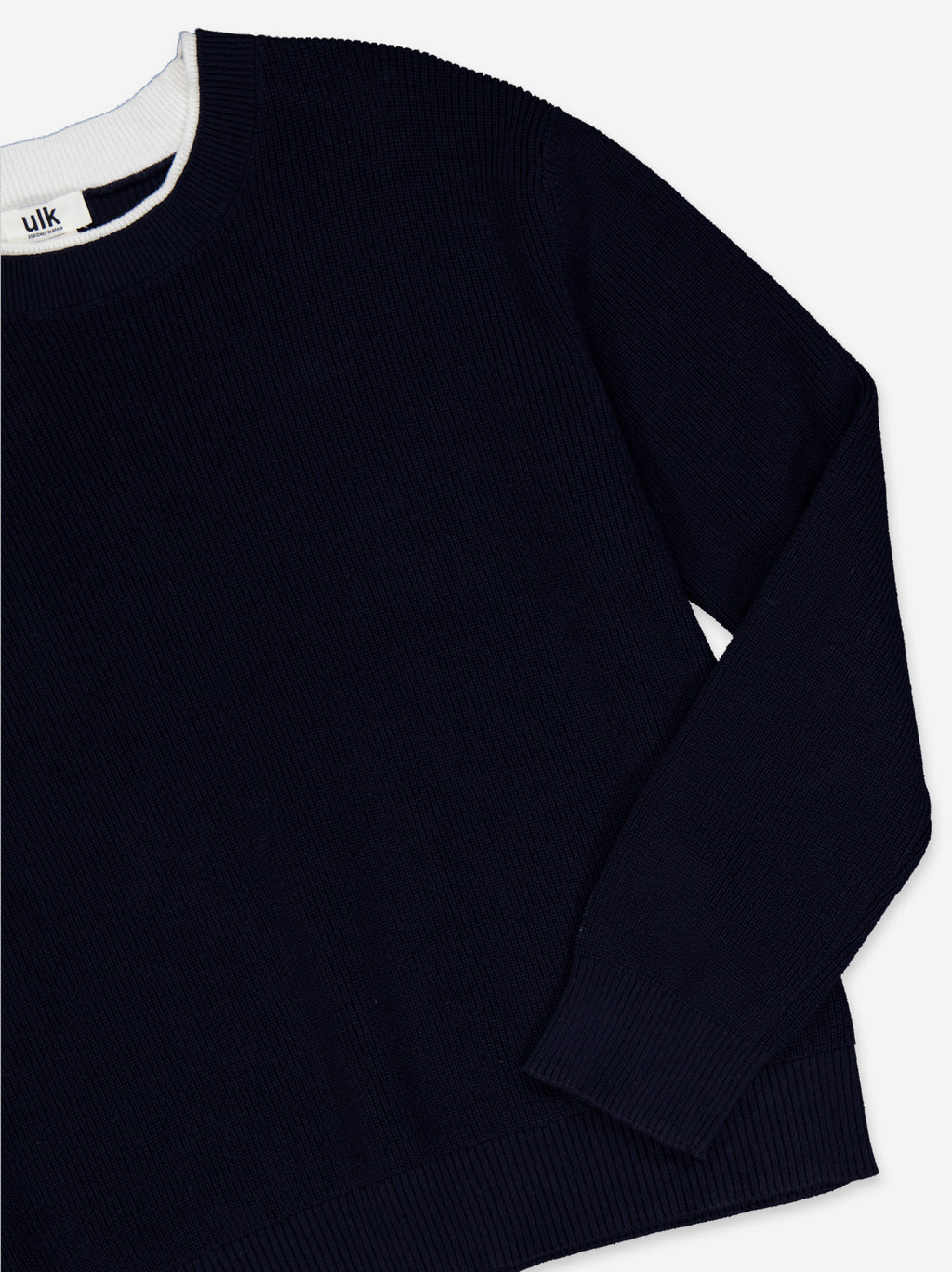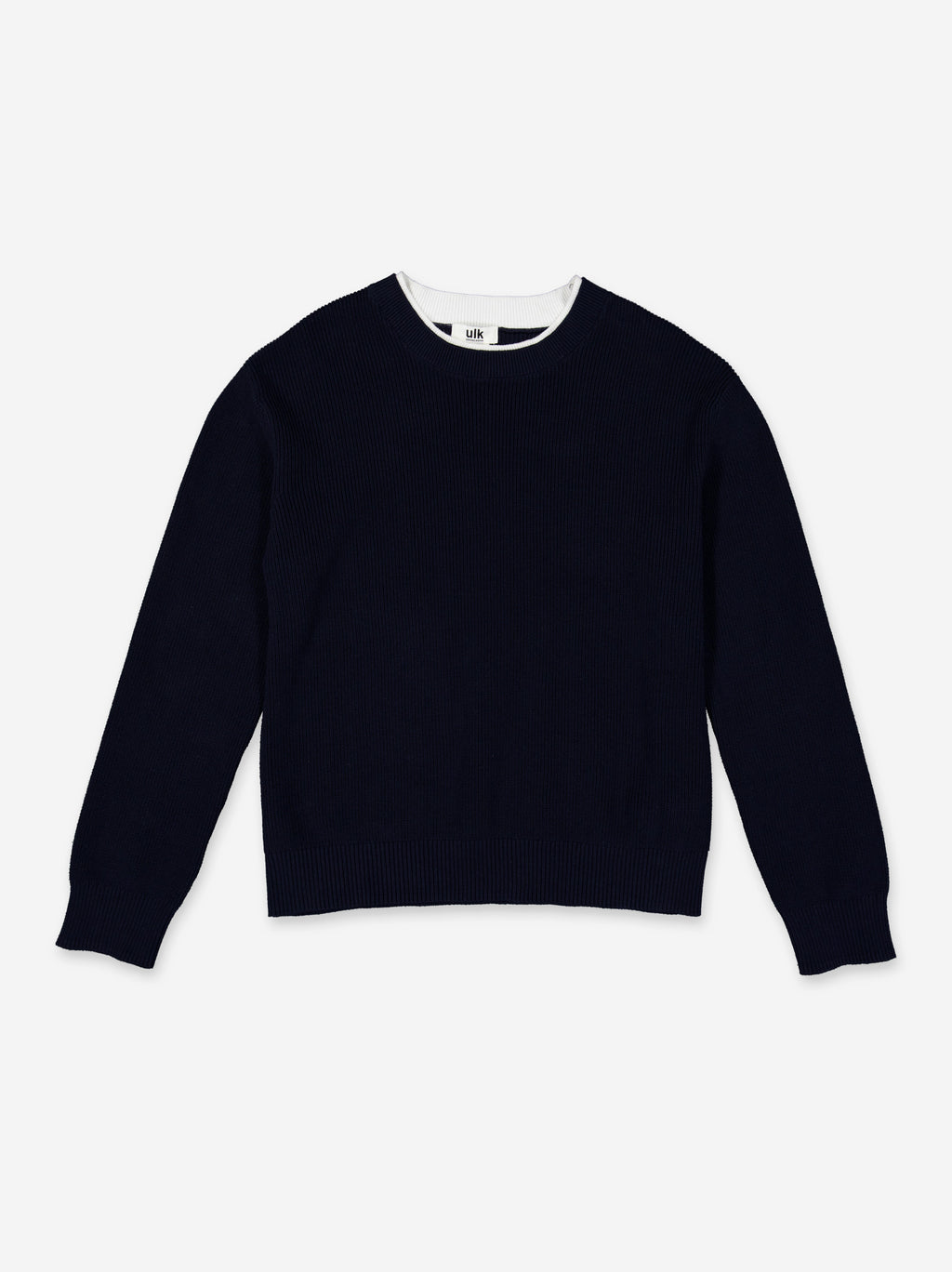 Long-sleeved knit sweater with a ribbed construction. Contrast-color mock-neckline detail.
