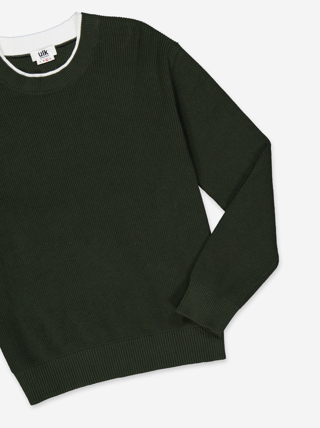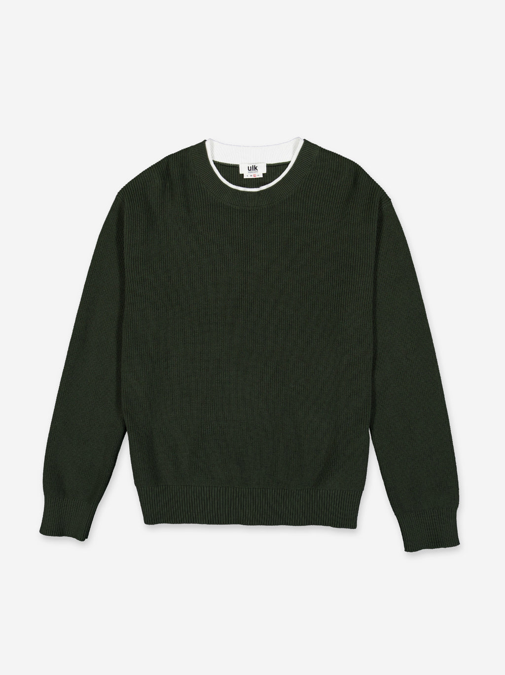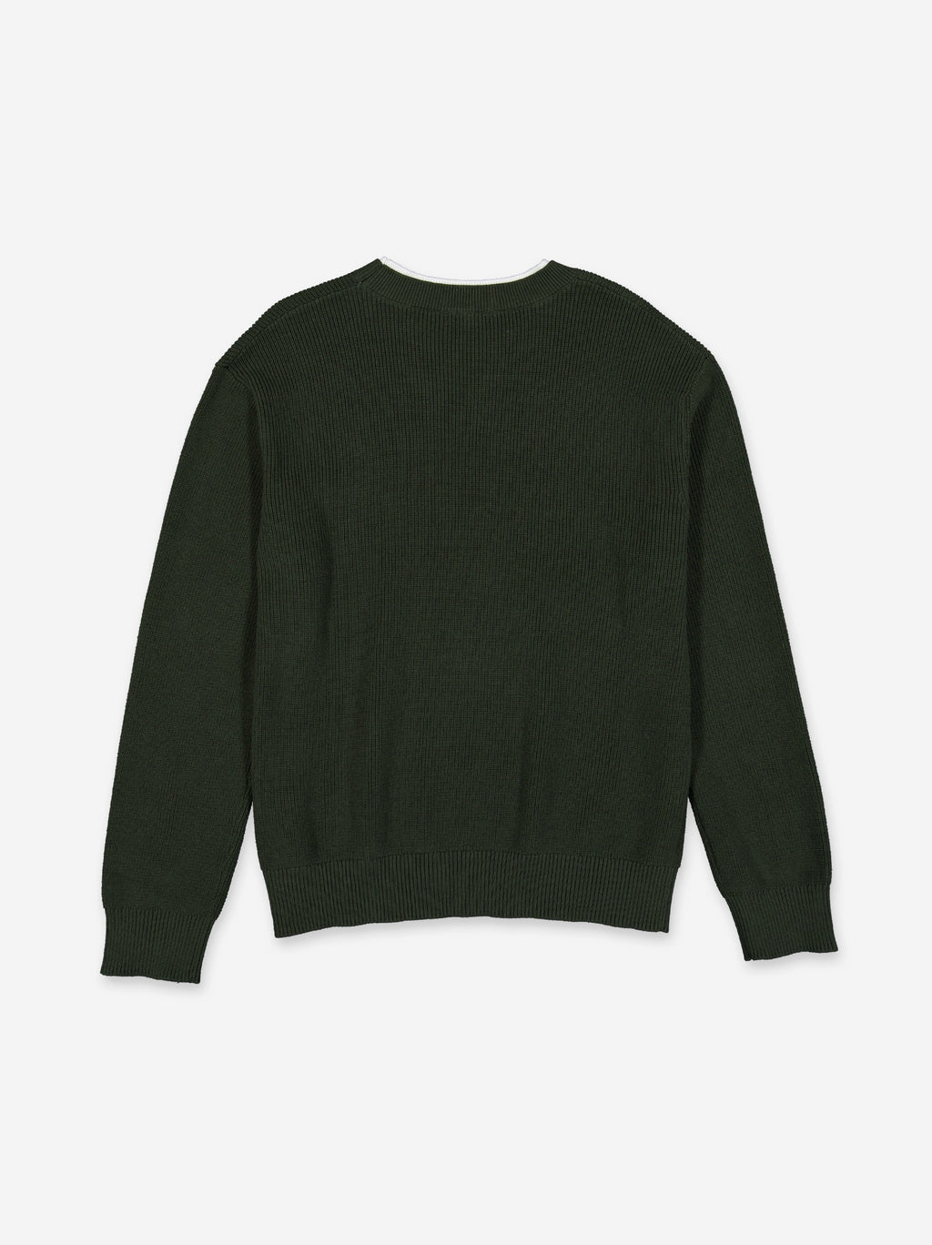 Long-sleeved knit sweater with a ribbed construction. Contrast-color mock-neckline detail.