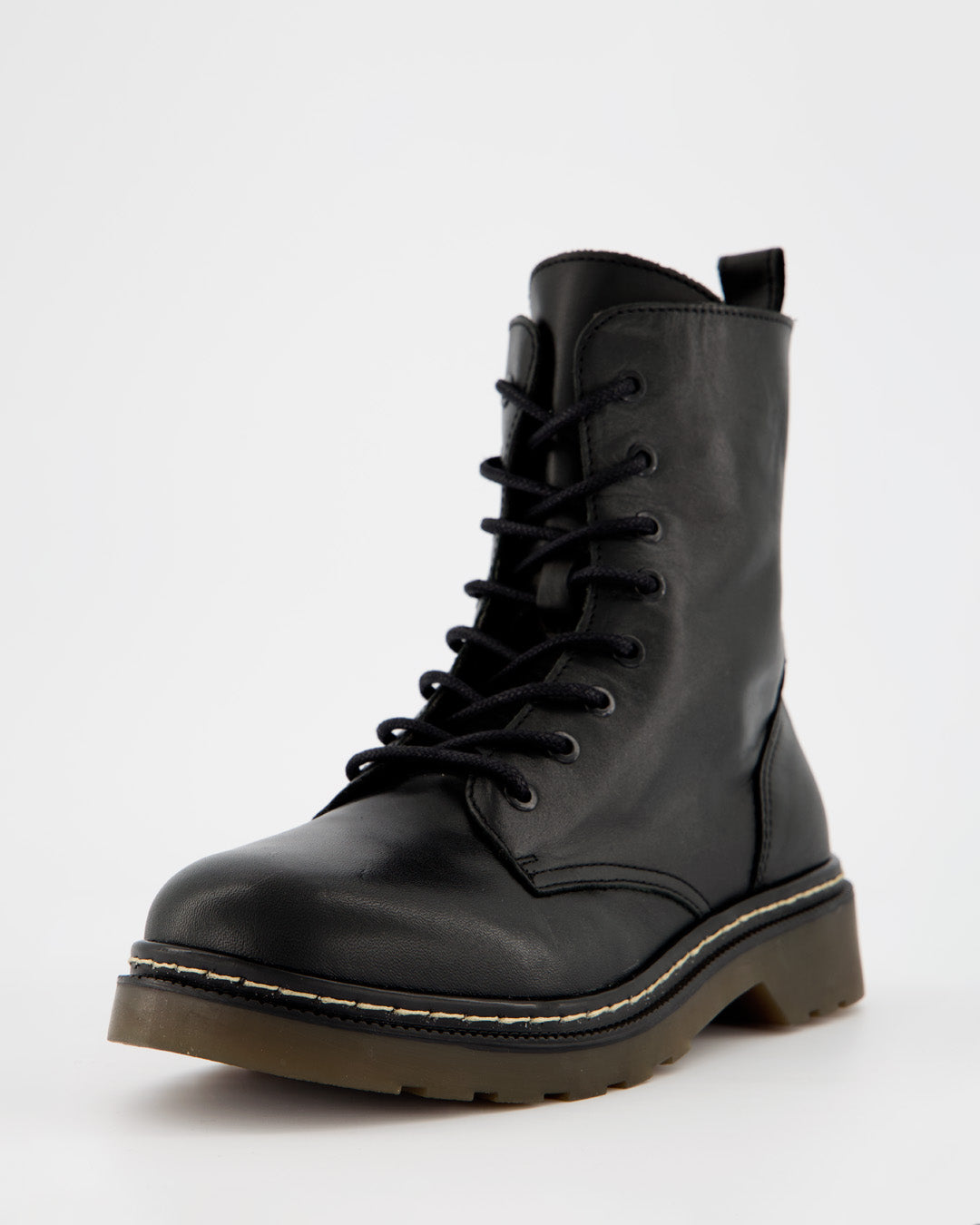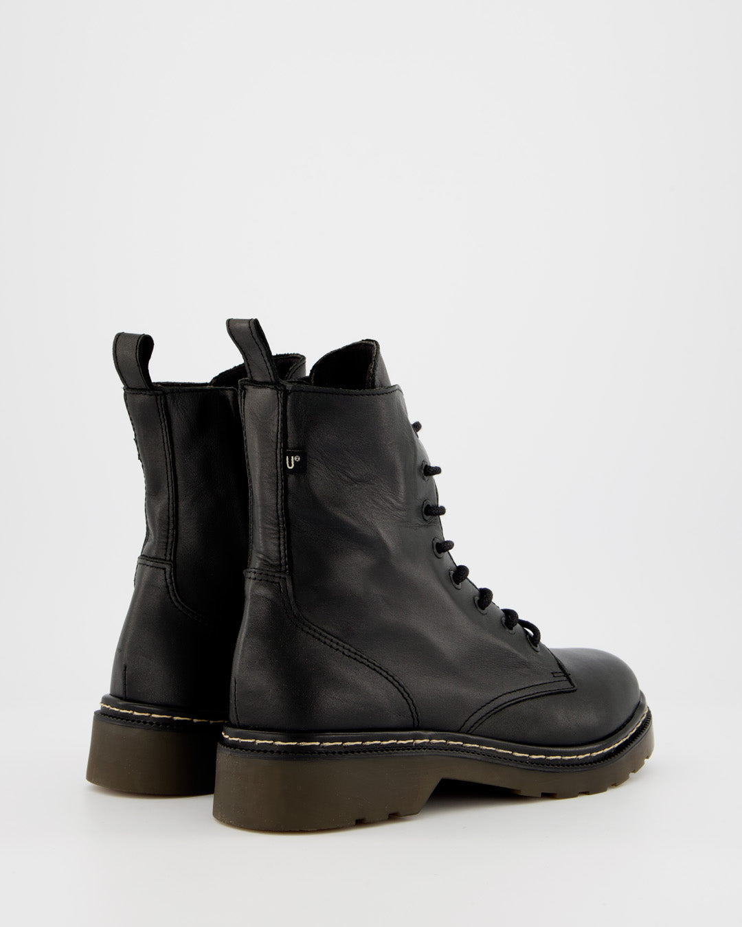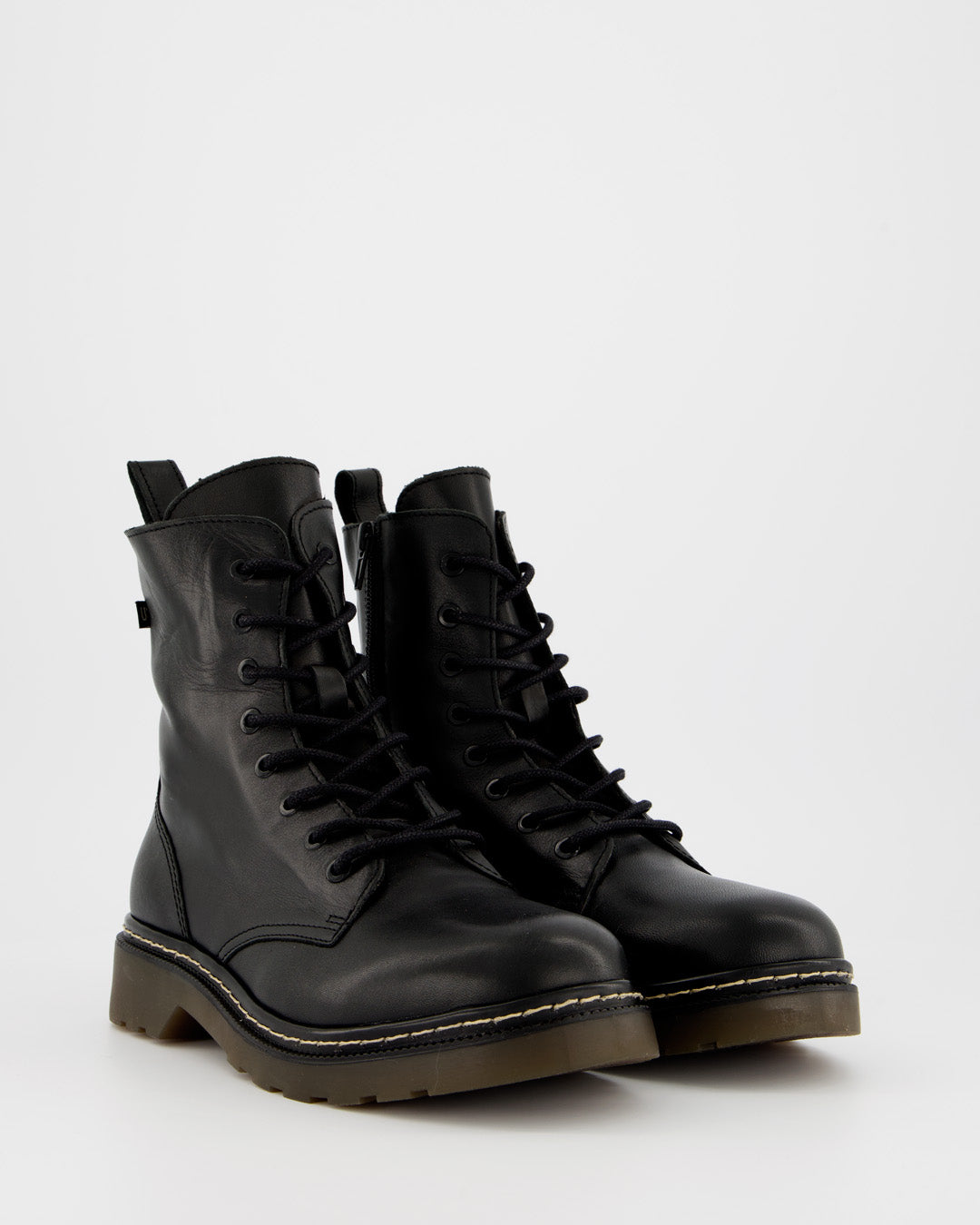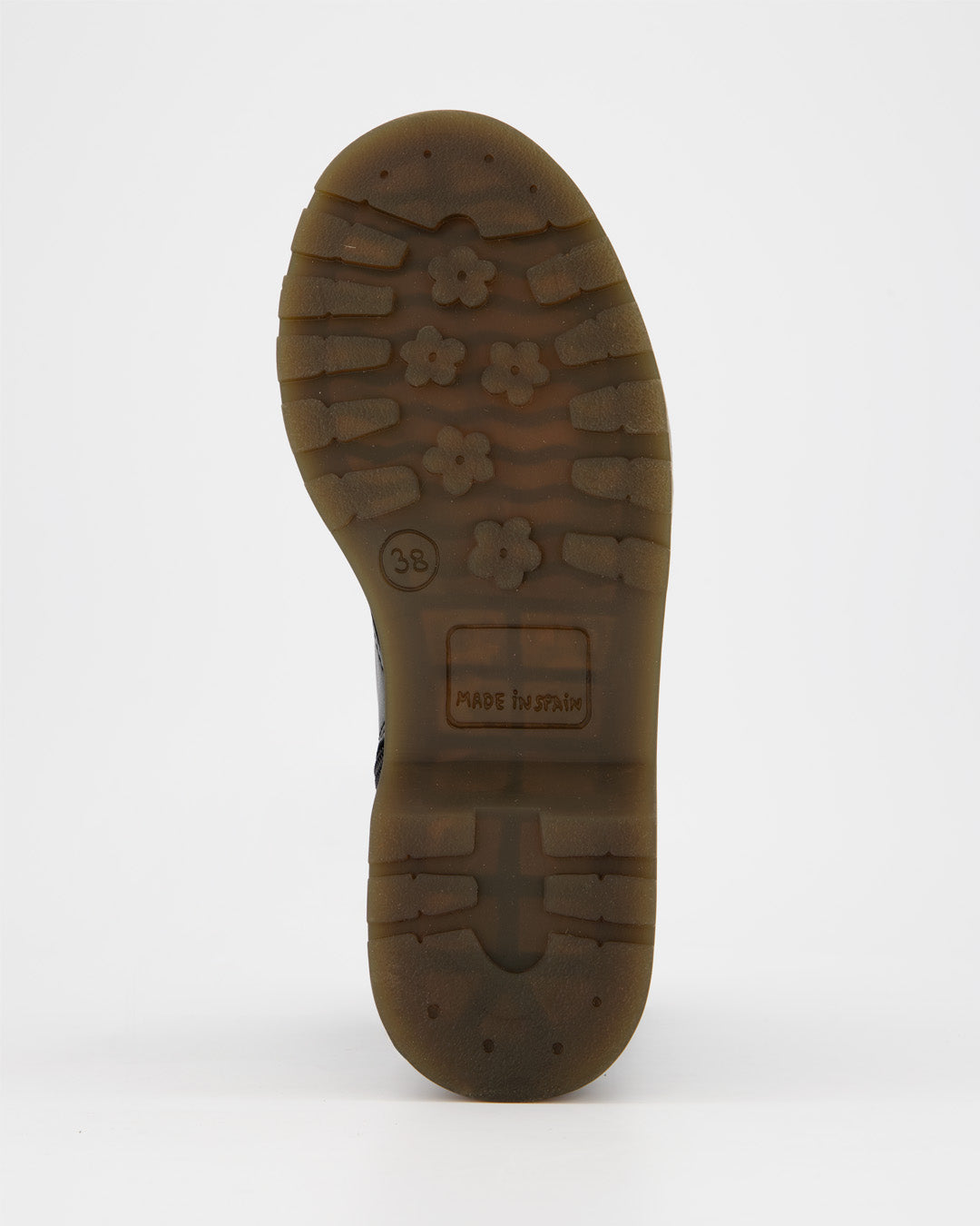 Military boot. Made of premium leather and textile lining. Lace-up with 8 eyelets. Inner zipper. Rear pull tab. 4 cm rubber sole.
