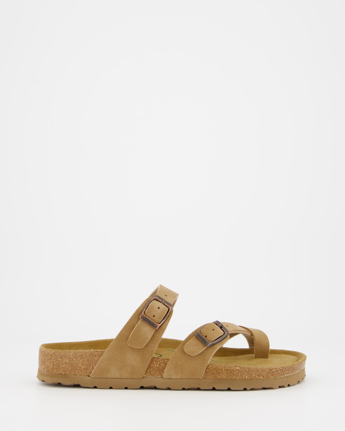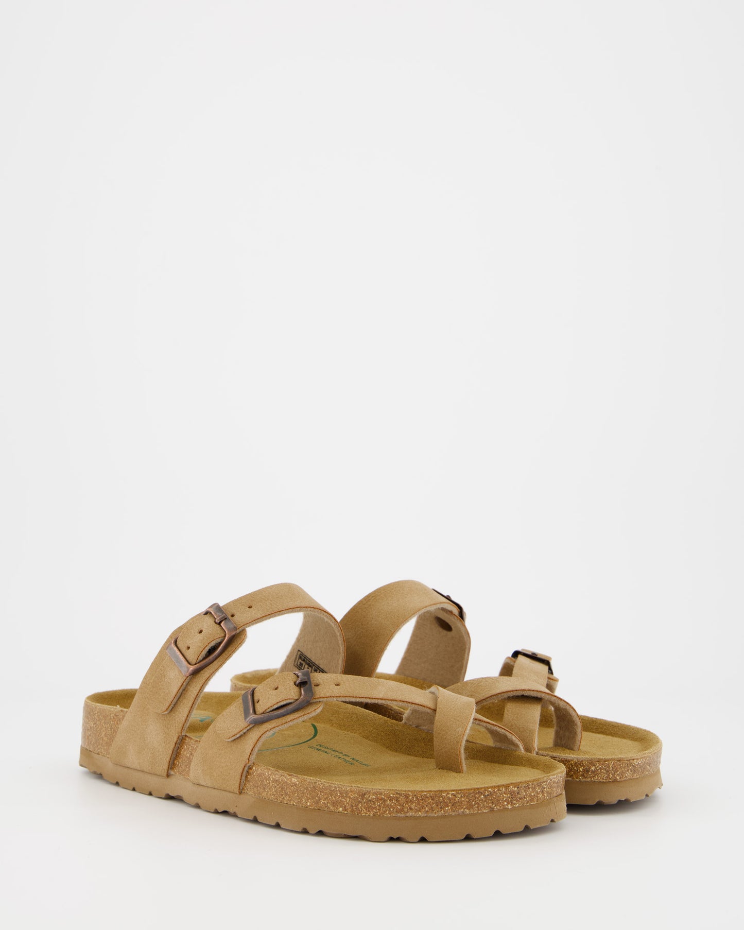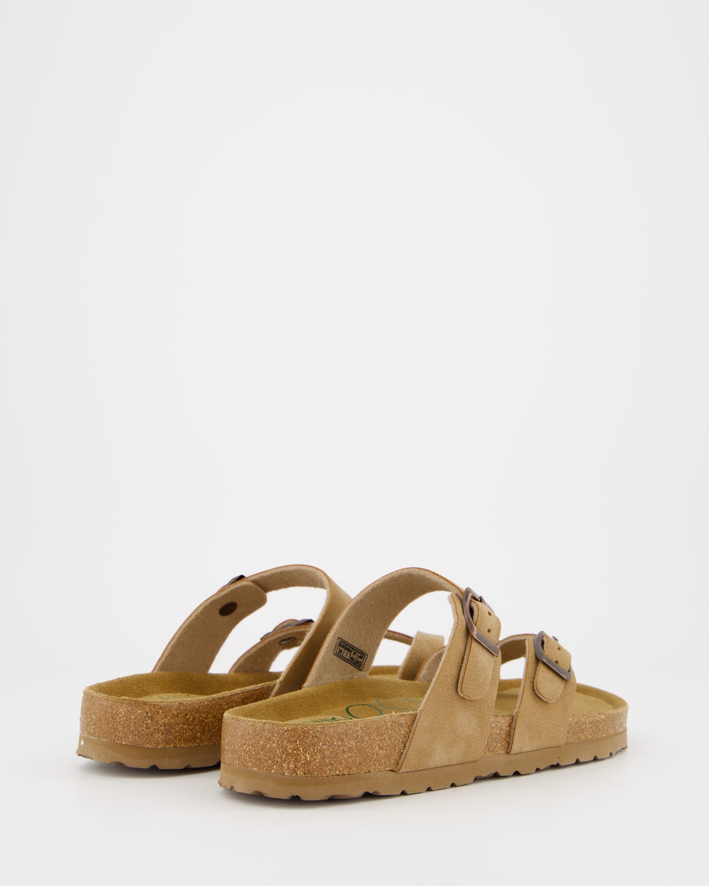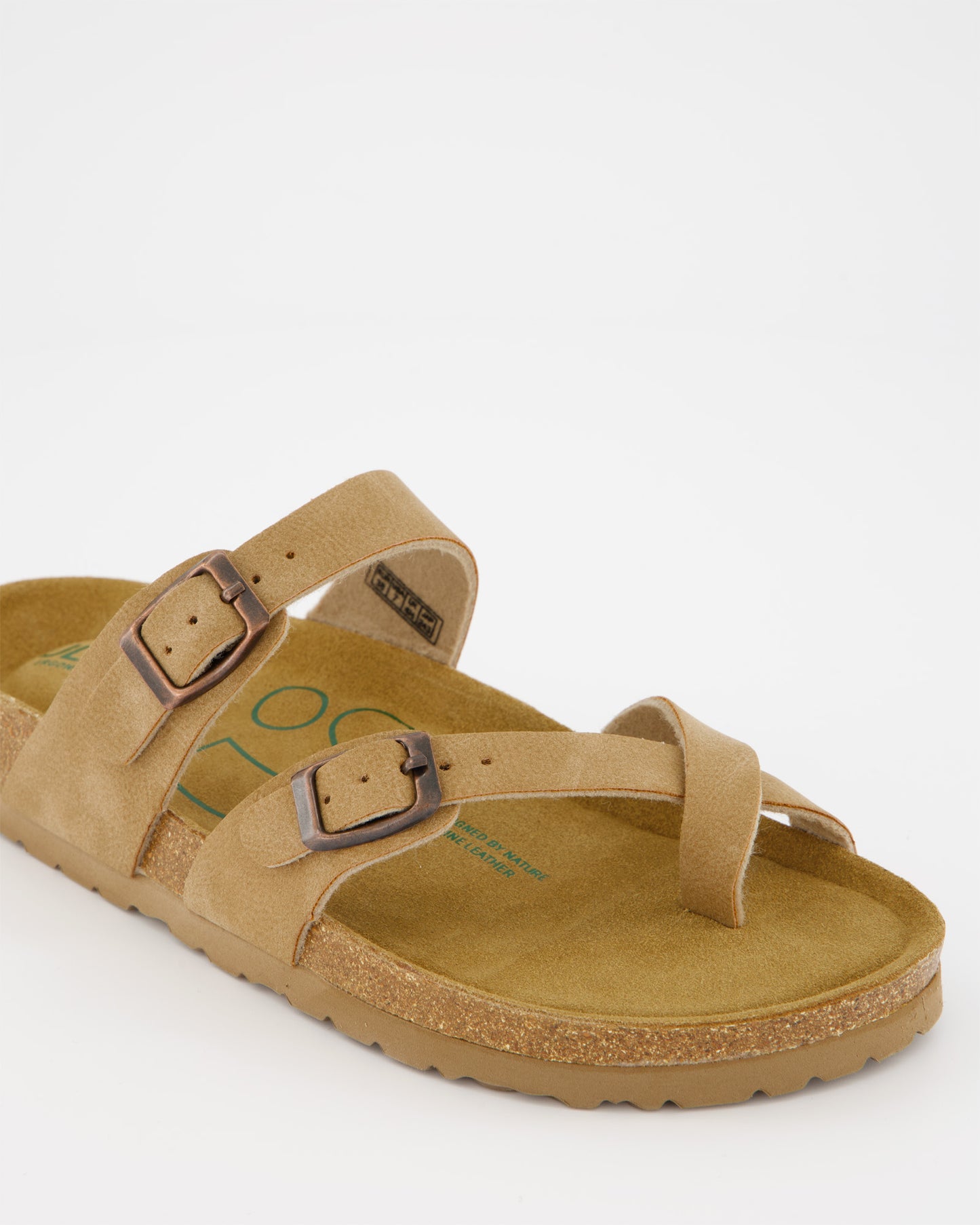 Sandals made of leather and synthetic materials. Adjustable buckle closure. 100% recycled anatomical insole. 3 cm high rubber sole.
