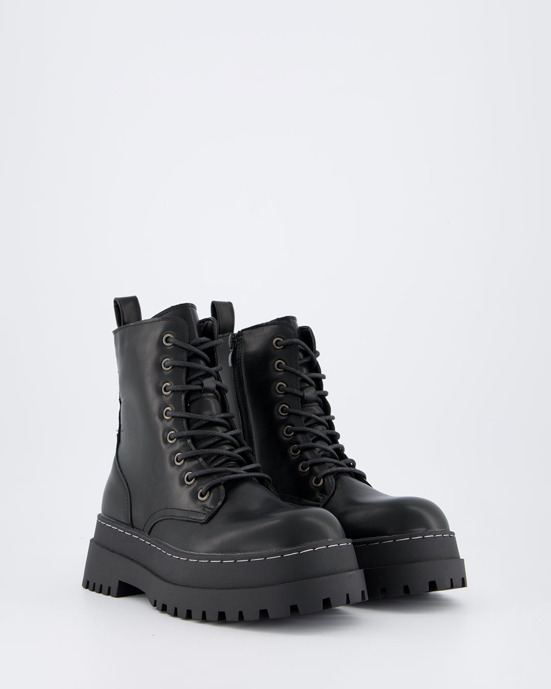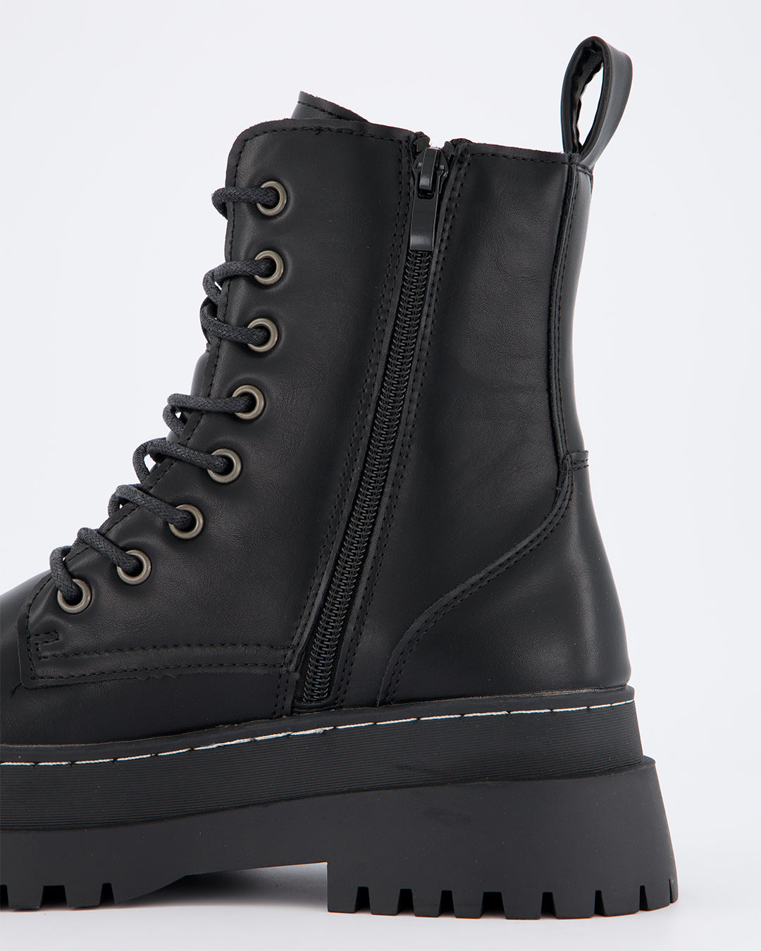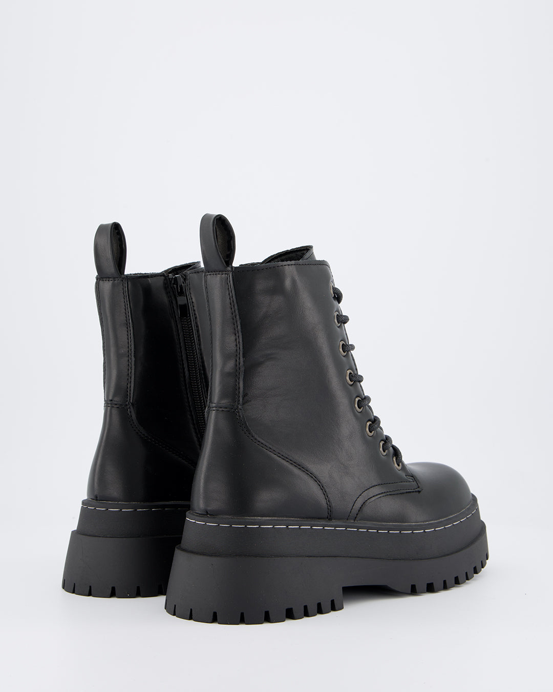 Military-style platform ankle boots. Made of synthetic leather. Lace-up closure. Interior zipper. 6 cm platform.