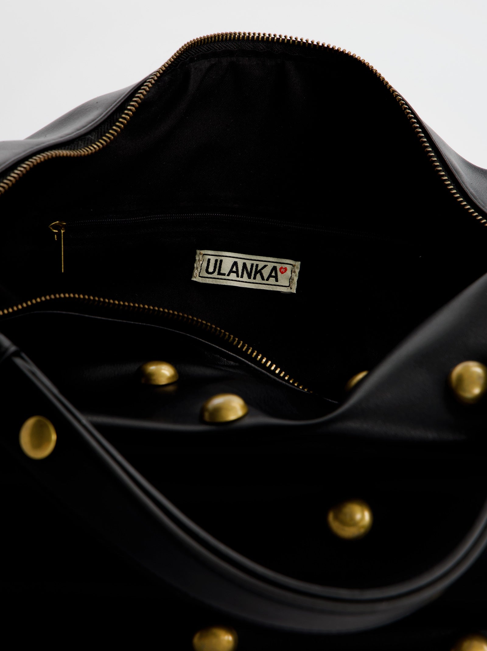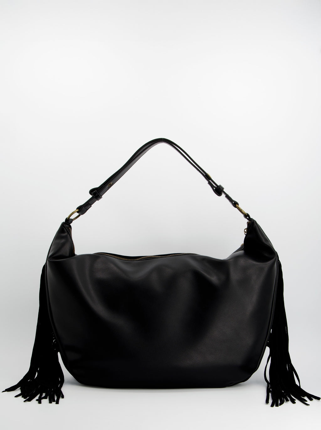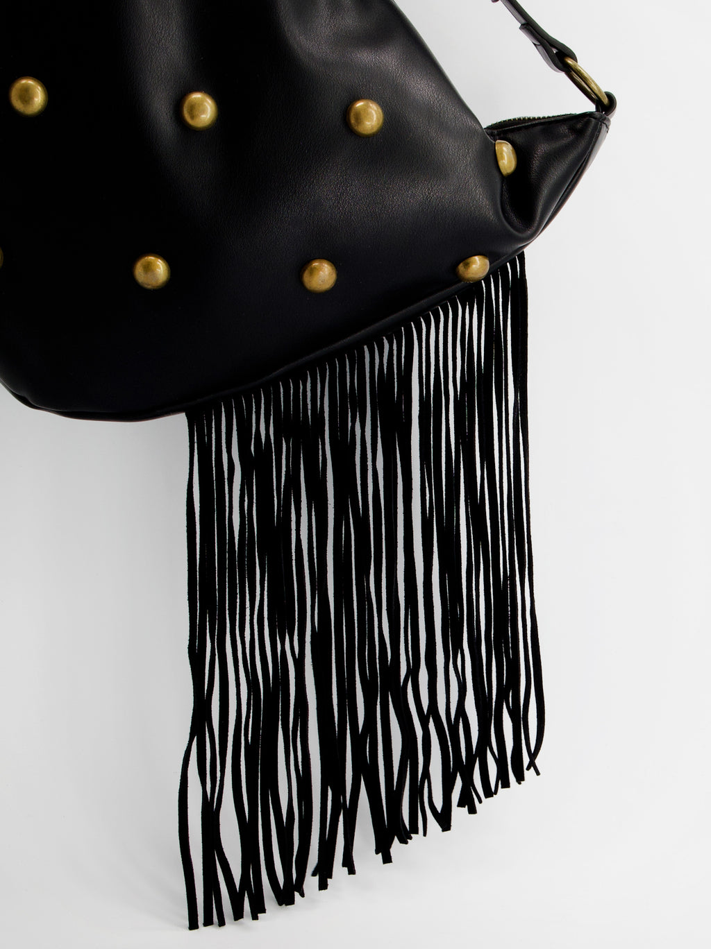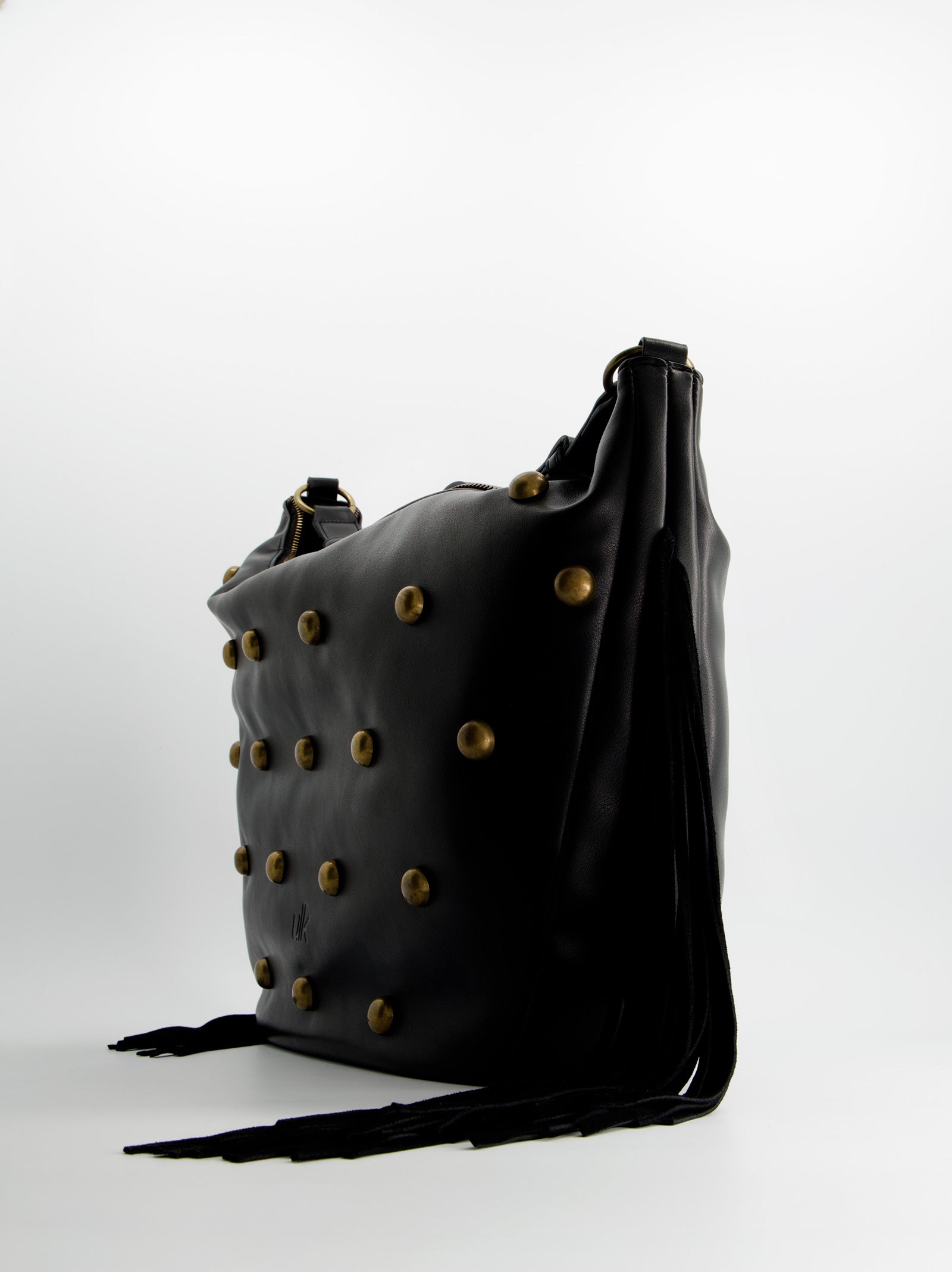 Black shoulder bag with studs and fringes. Adjustable strap. Measurements 35x47 cm.