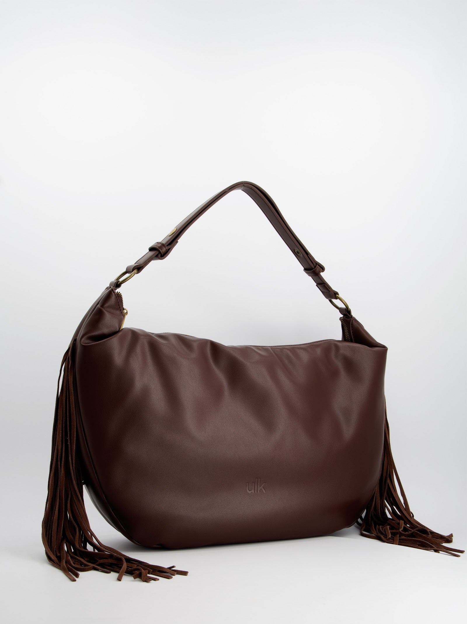 Brown shoulder bag with side fringes. Made with a satin finish.