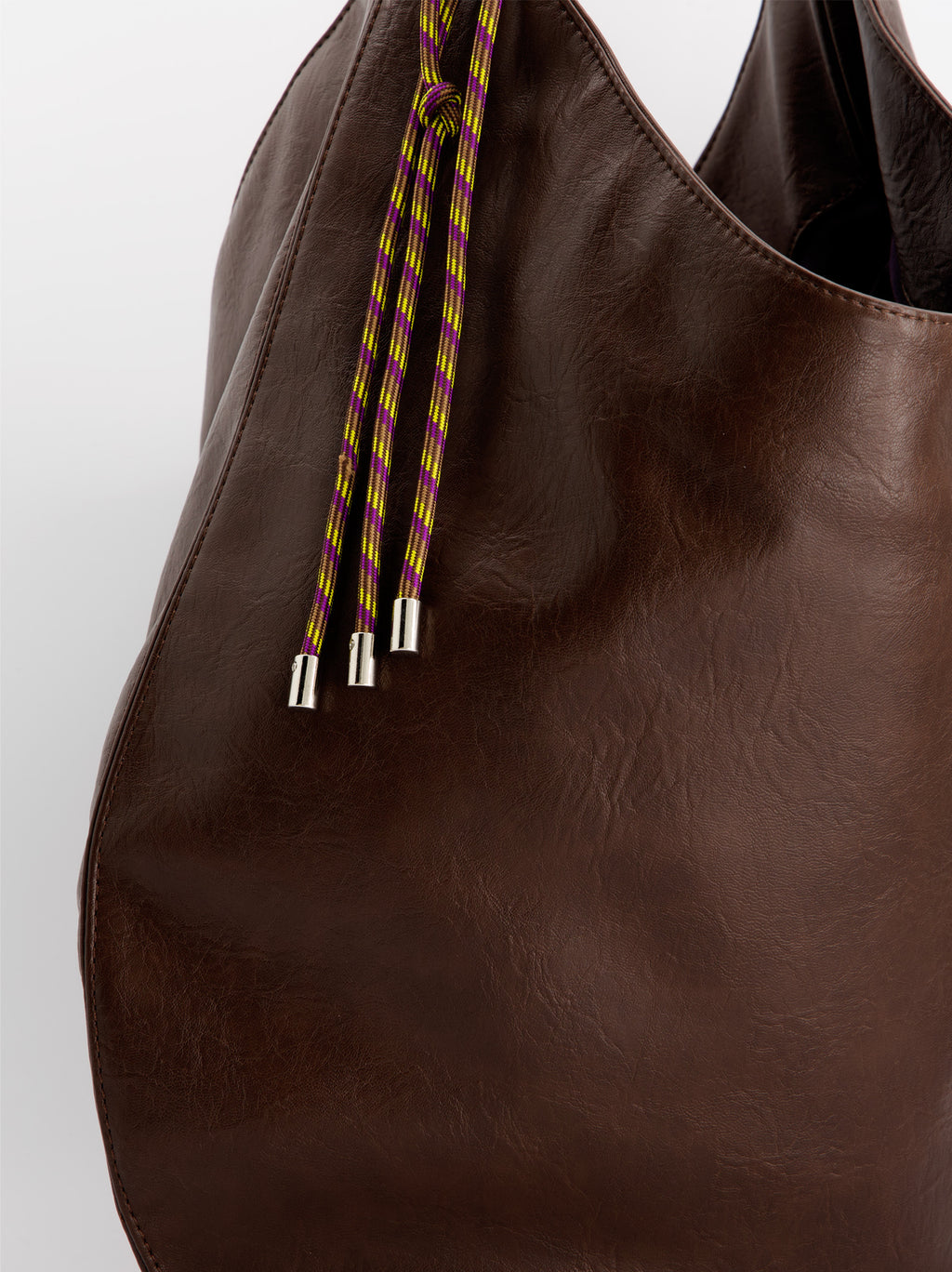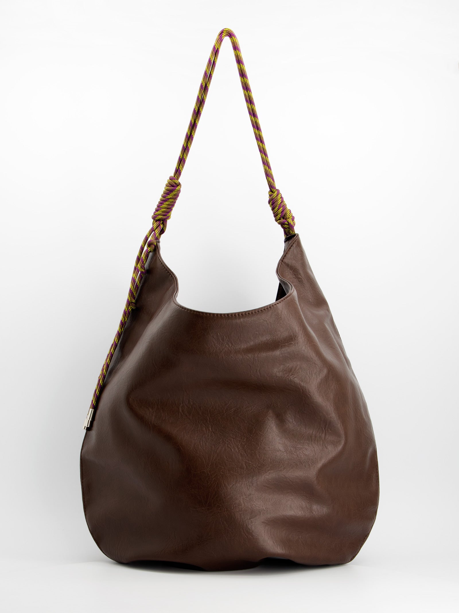 Hobo shoulder bag. It fuses a timeless design with contemporary details. Crafted from brown faux leather with a supple body for a relaxed silhouette, ideal for everyday use. A braided rope handle in vibrant hues adds contrast and personality.
