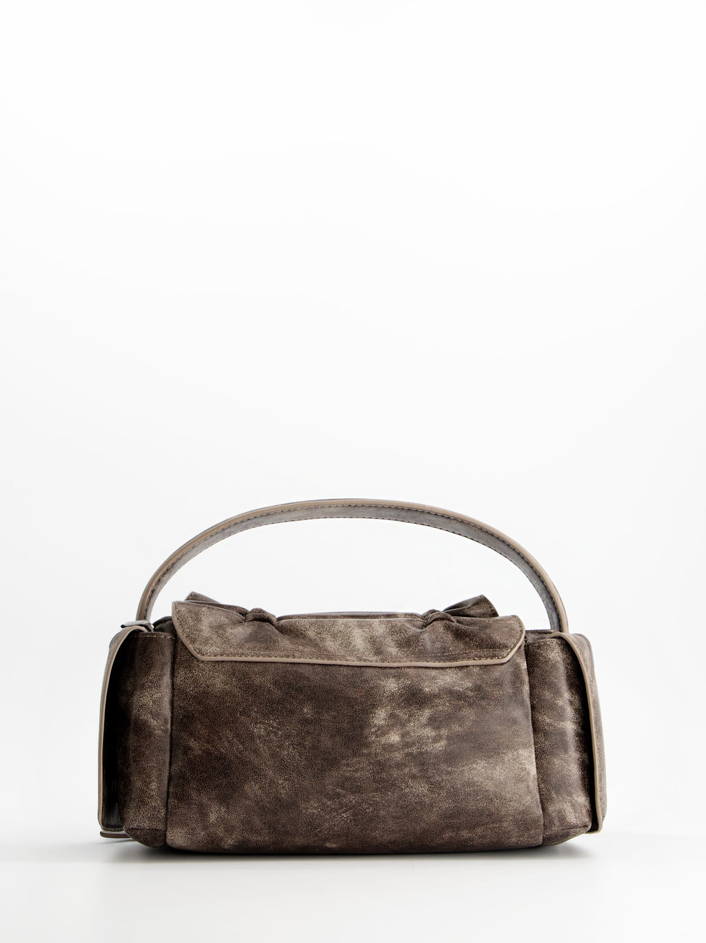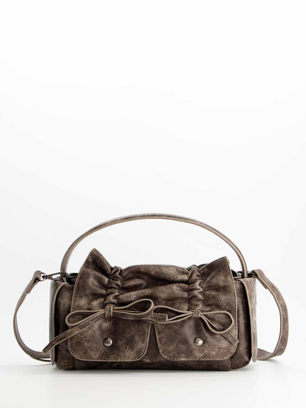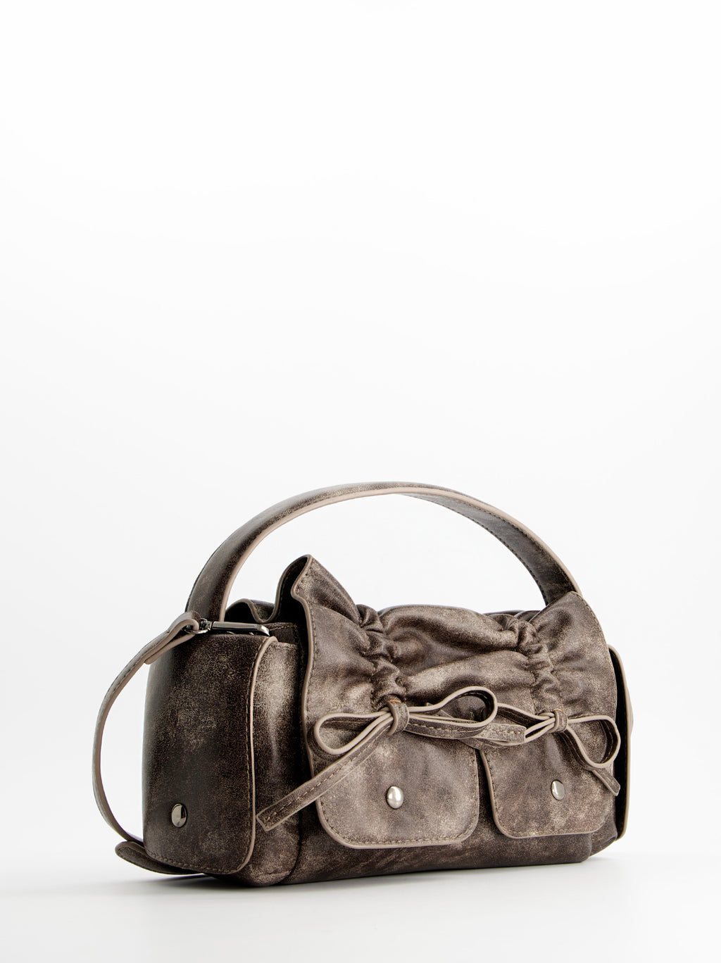 Small satchel-style handbag, inspired by vintage concepts. It stands out for its structured and feminine design. Finished in distressed faux leather, it features a front flap with button closures and a central gathering accompanied by two bows for a soft and romantic look. It features a top handle and an adjustable and removable strap, making it a versatile piece.