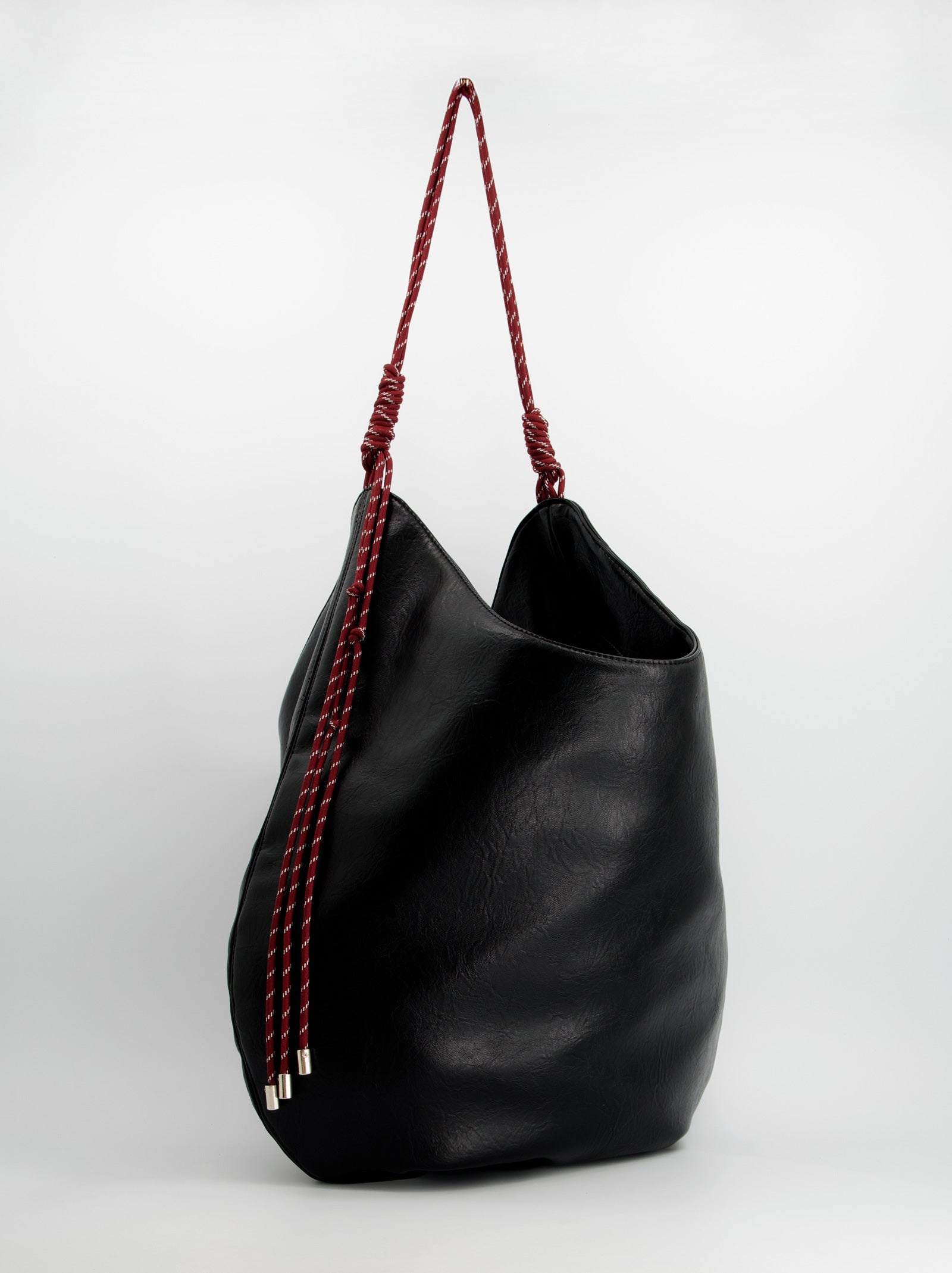 Hobo shoulder bag. It fuses a timeless design with contemporary details. Crafted from black faux leather with a supple body for a relaxed silhouette, ideal for everyday use. Braided rope handle.