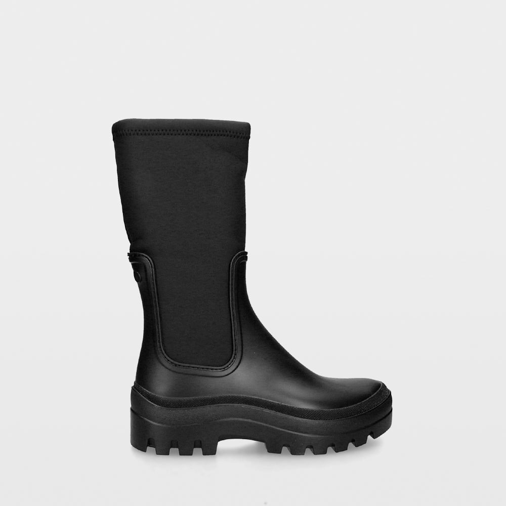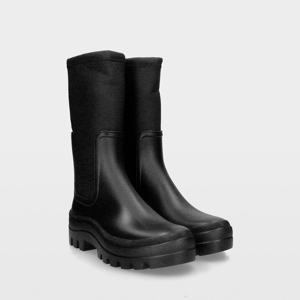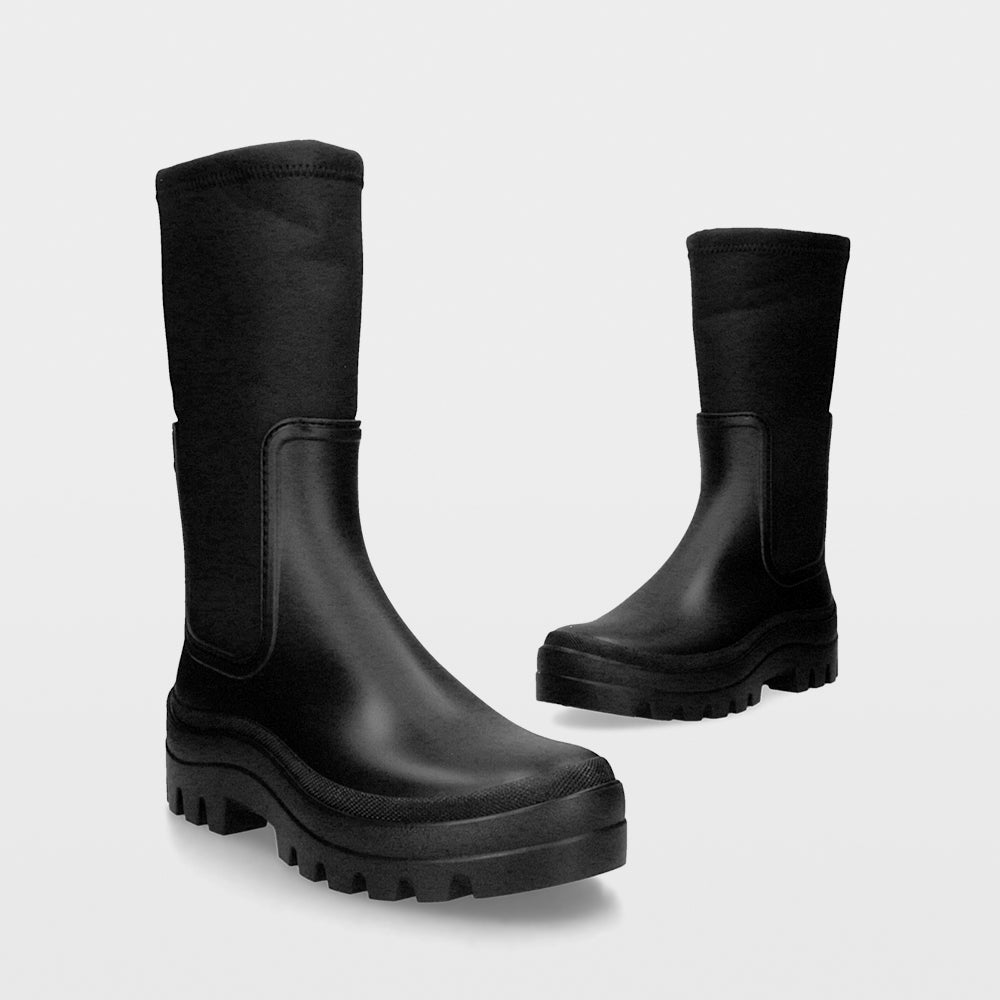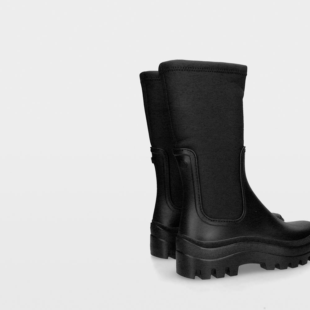 Track-style plain-coloured rain boot, matte finish, neoprene on the sides, removable comfort insole and vertical grooves on the sole. 5cm sole. 25cm shaft.