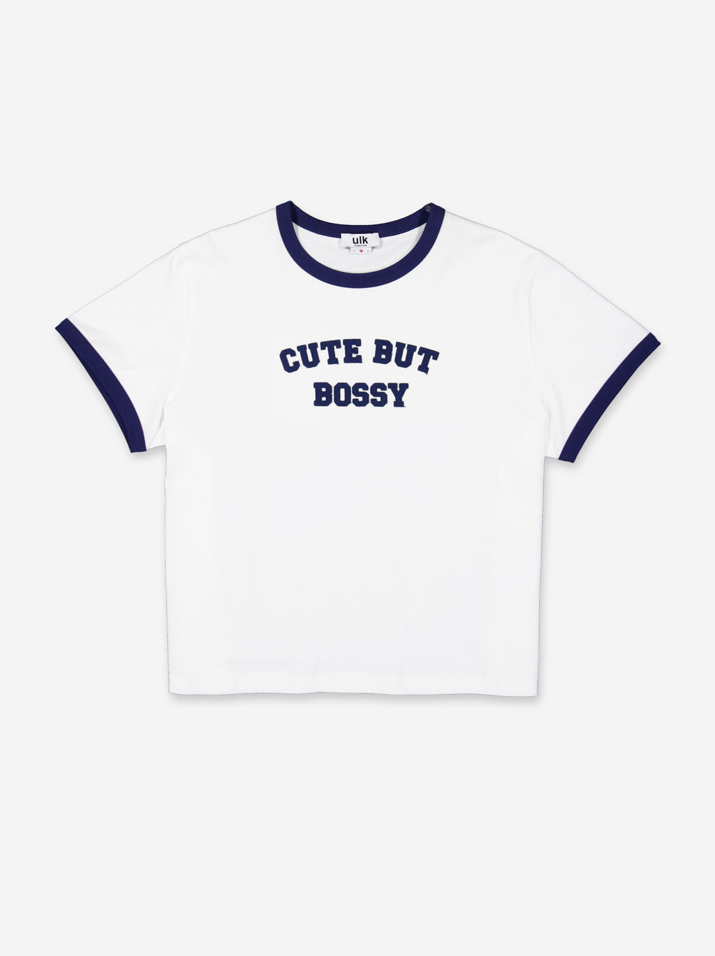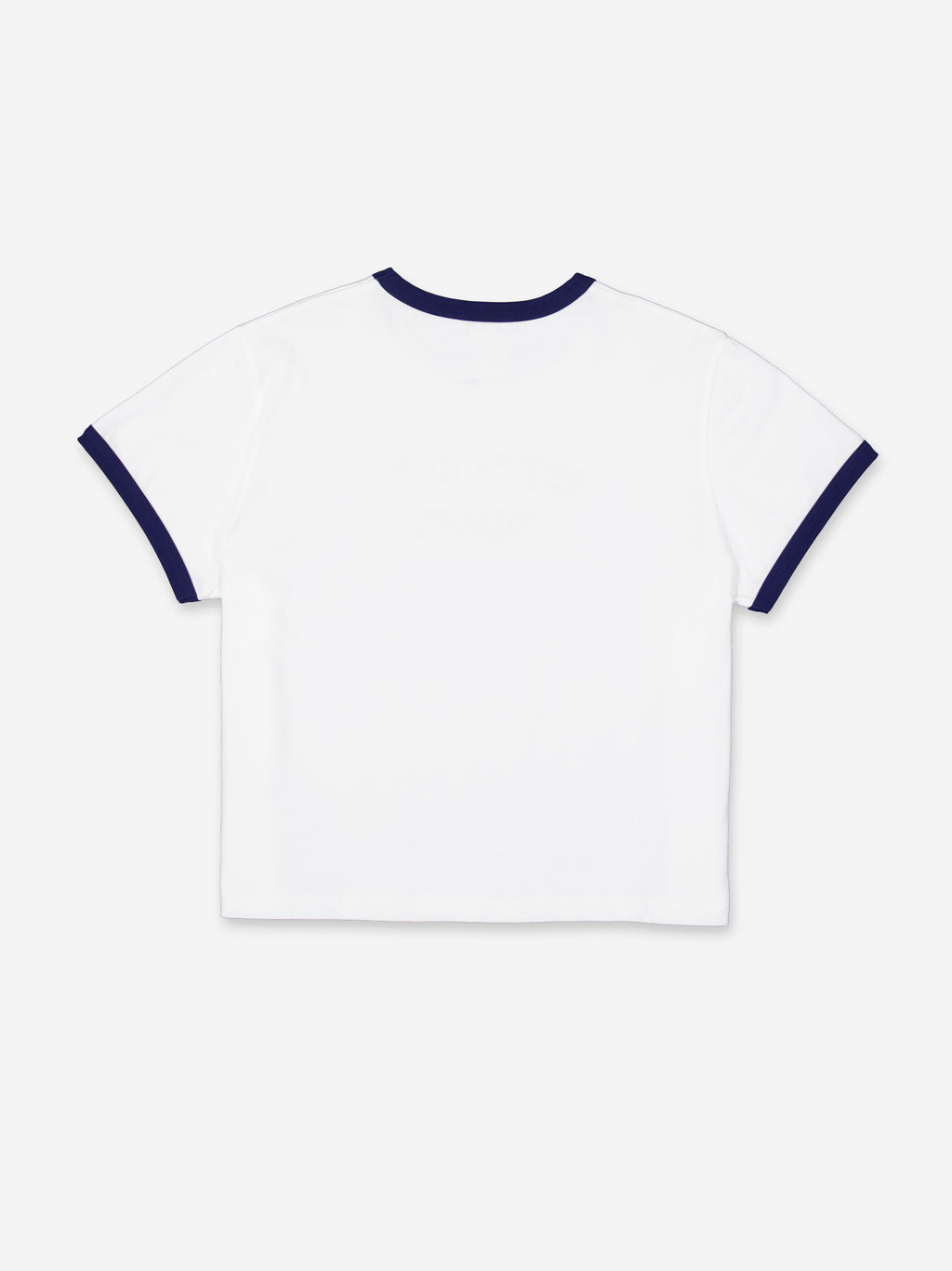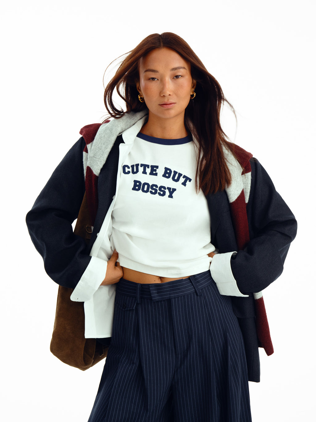 T-shirt with embroidered slogan. Contrast-color trim on the sleeves and neck.