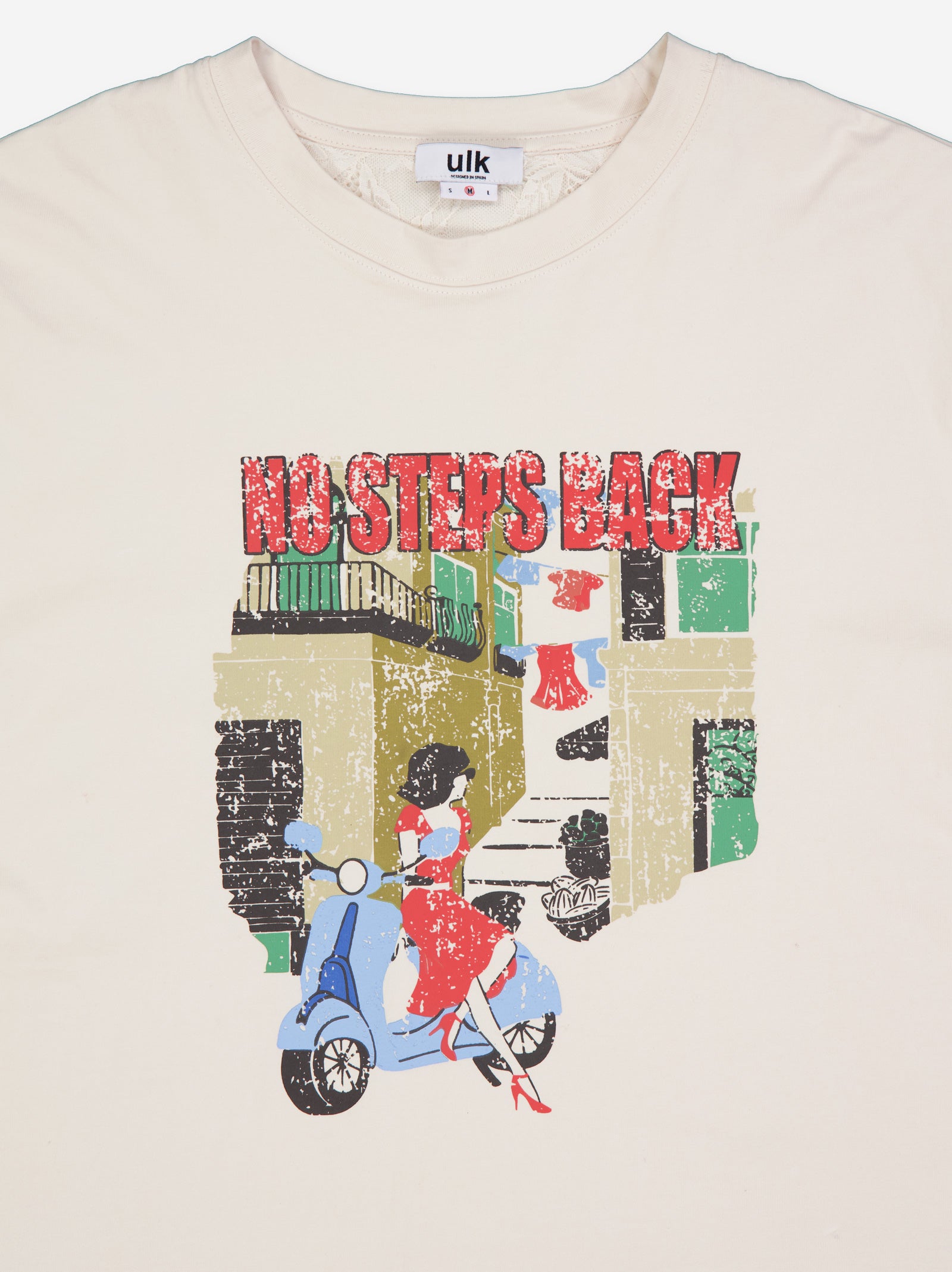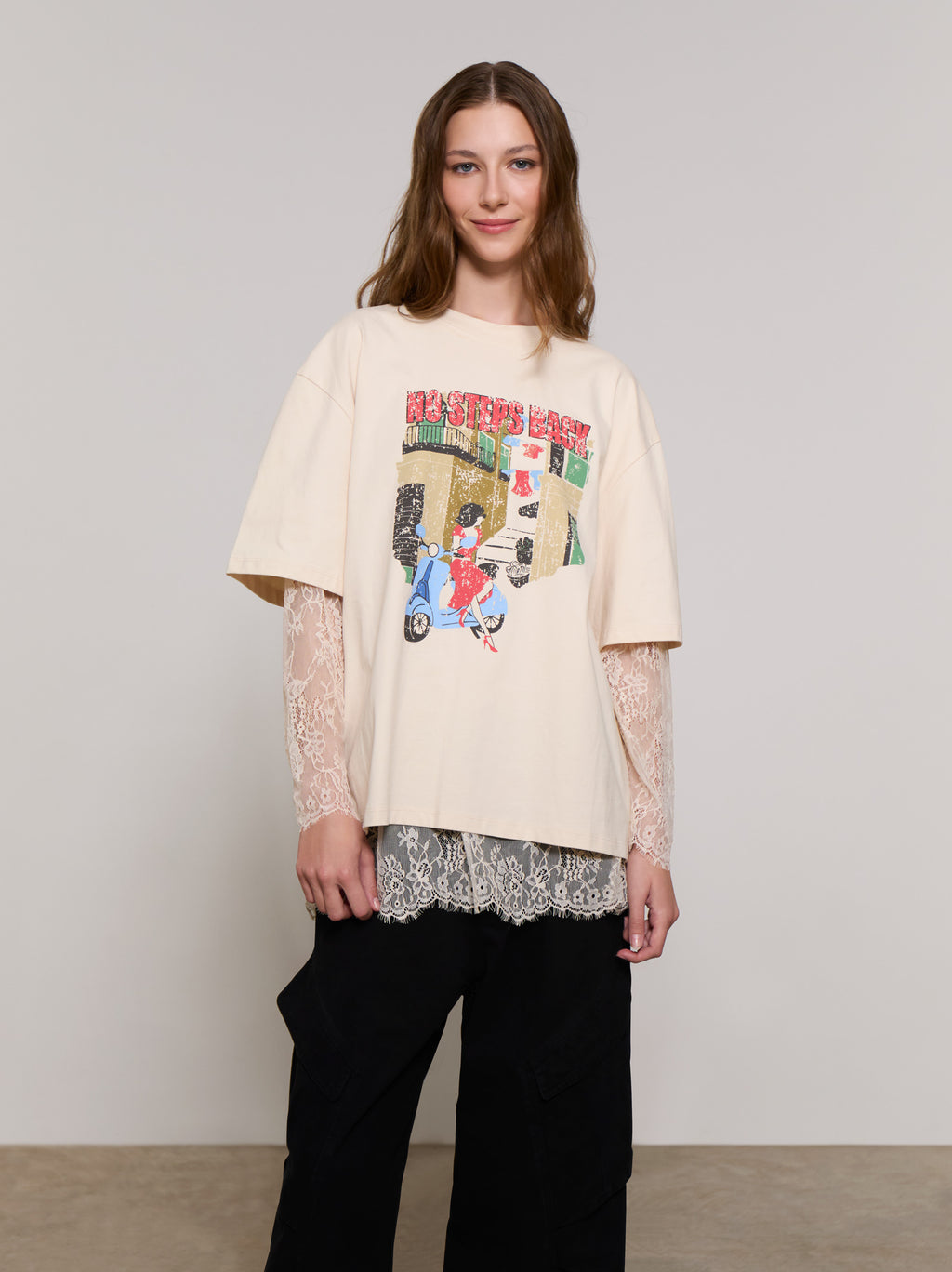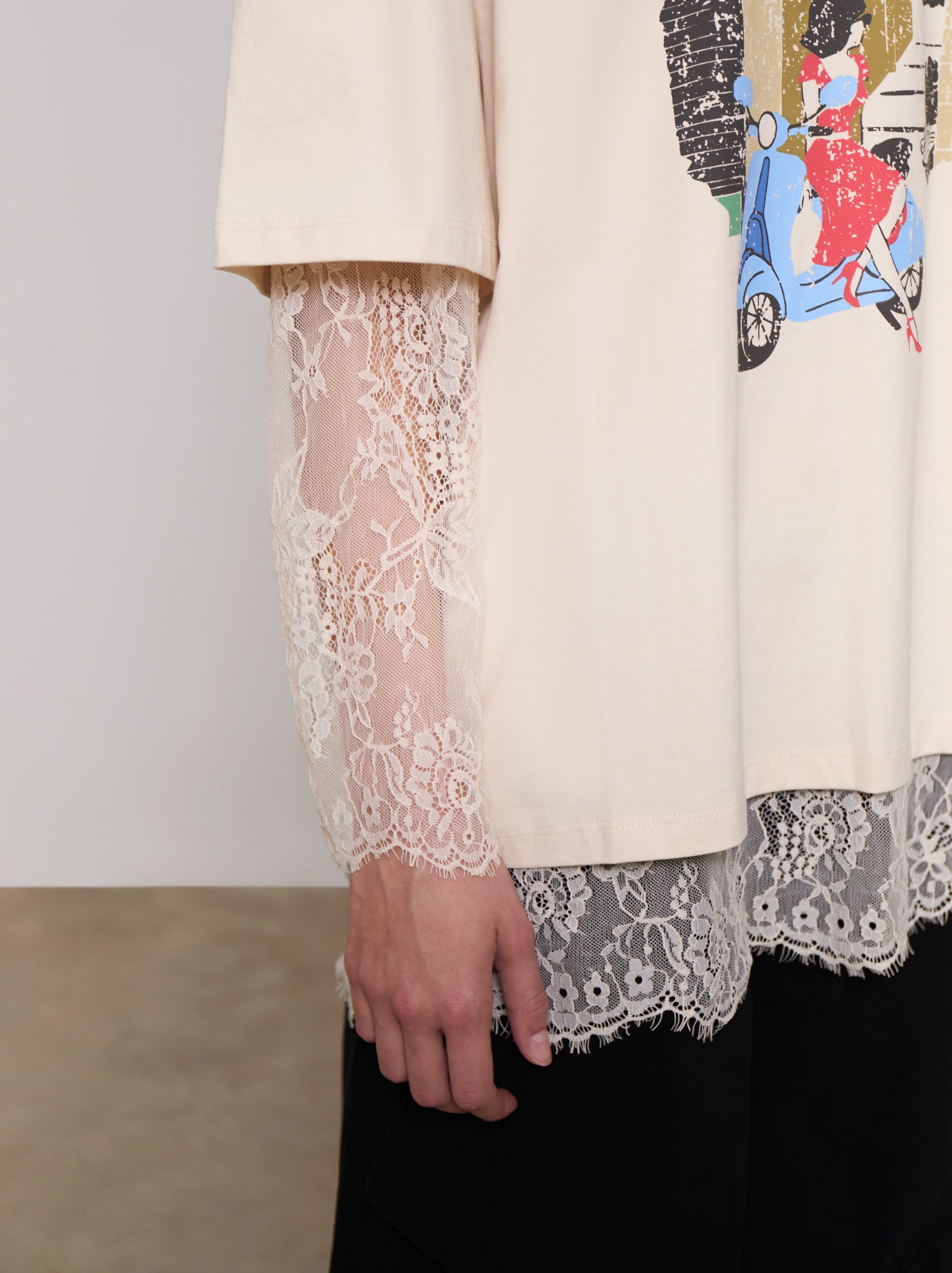 Printed double-breasted T-shirt. Combined lace fabric with a double-breasted effect.