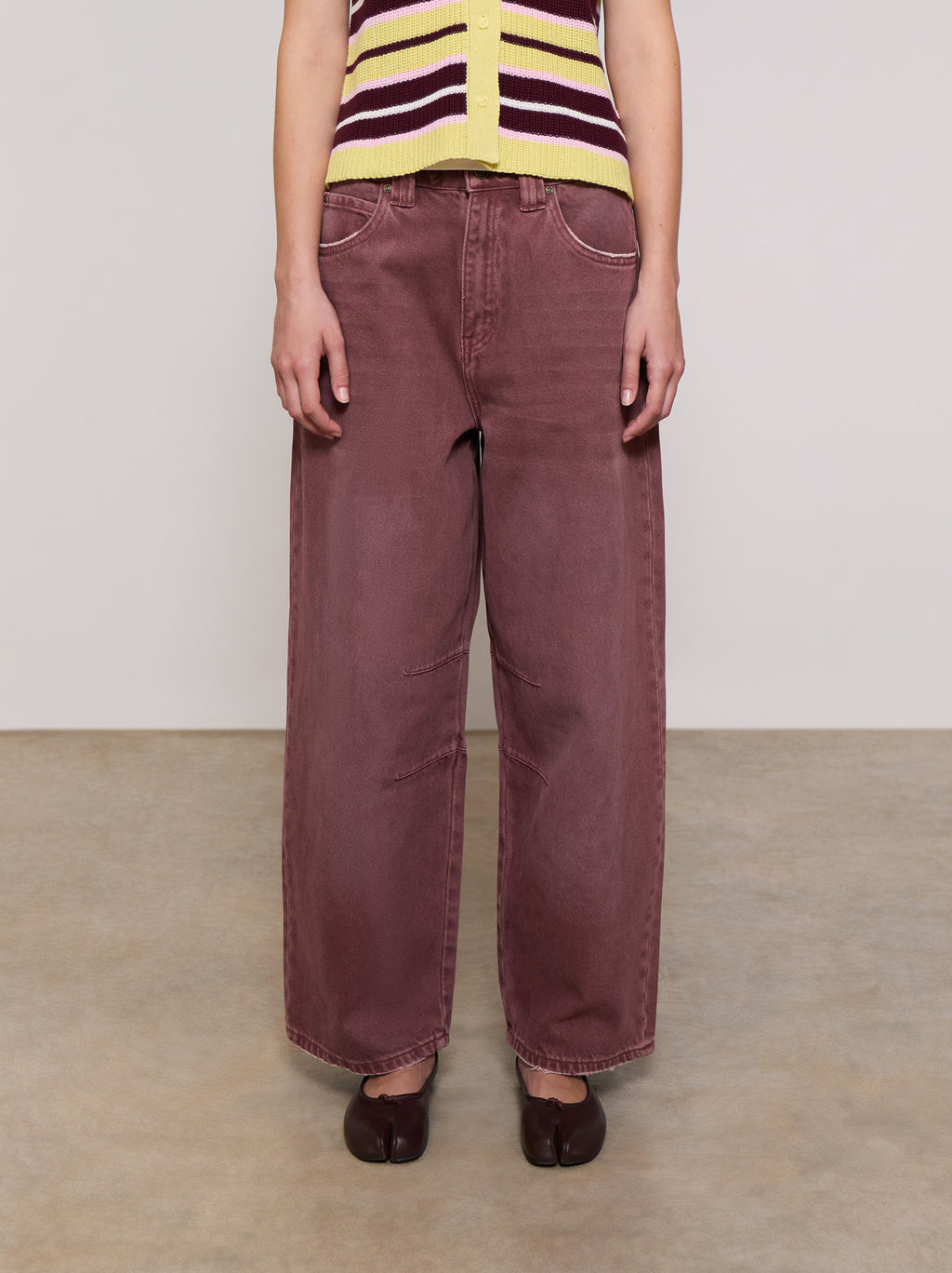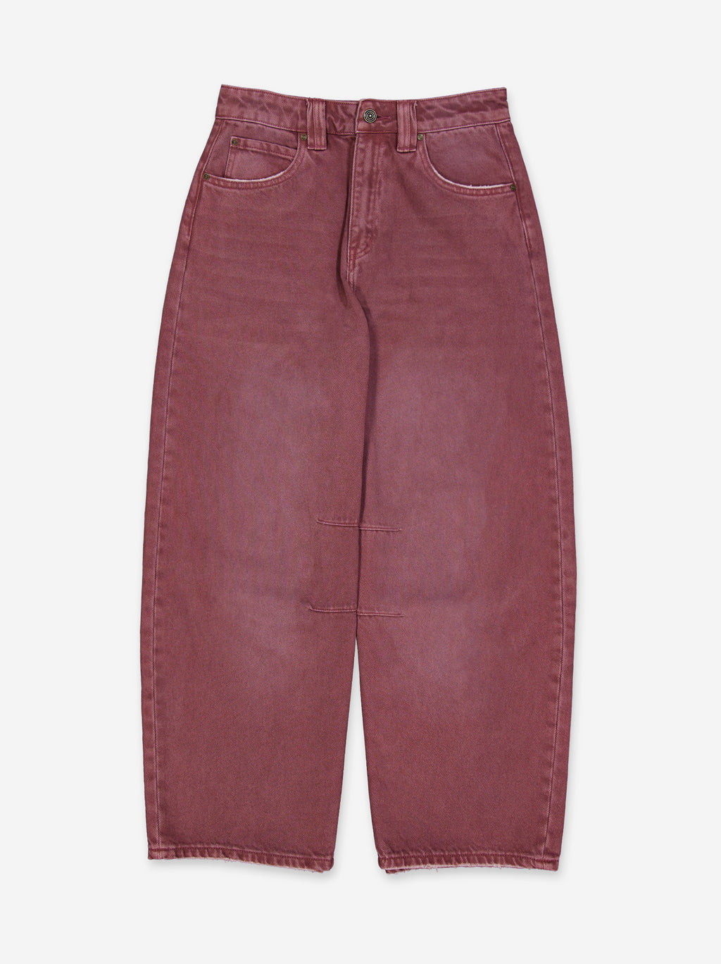 Mid-rise baggy jeans with five pockets. Seam detailing at the knee. Front zipper and metal button closure.