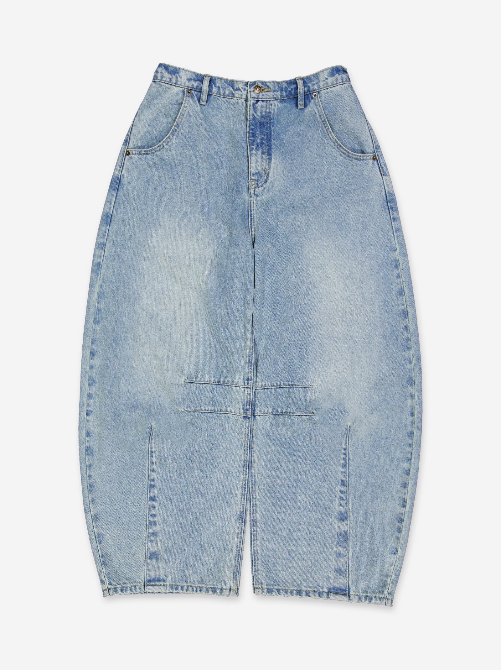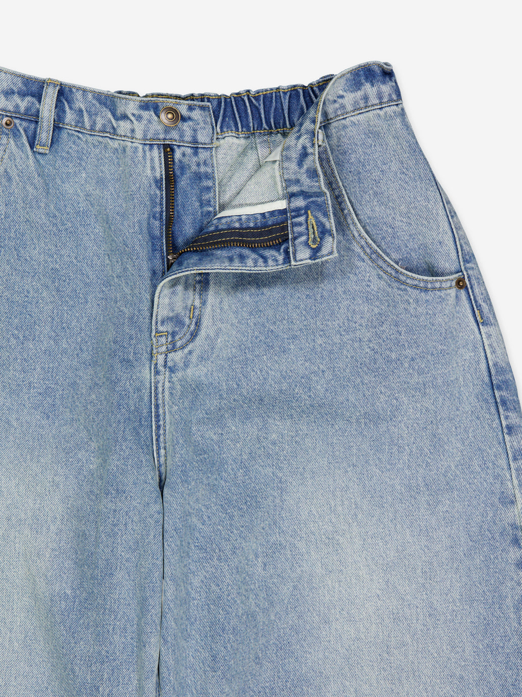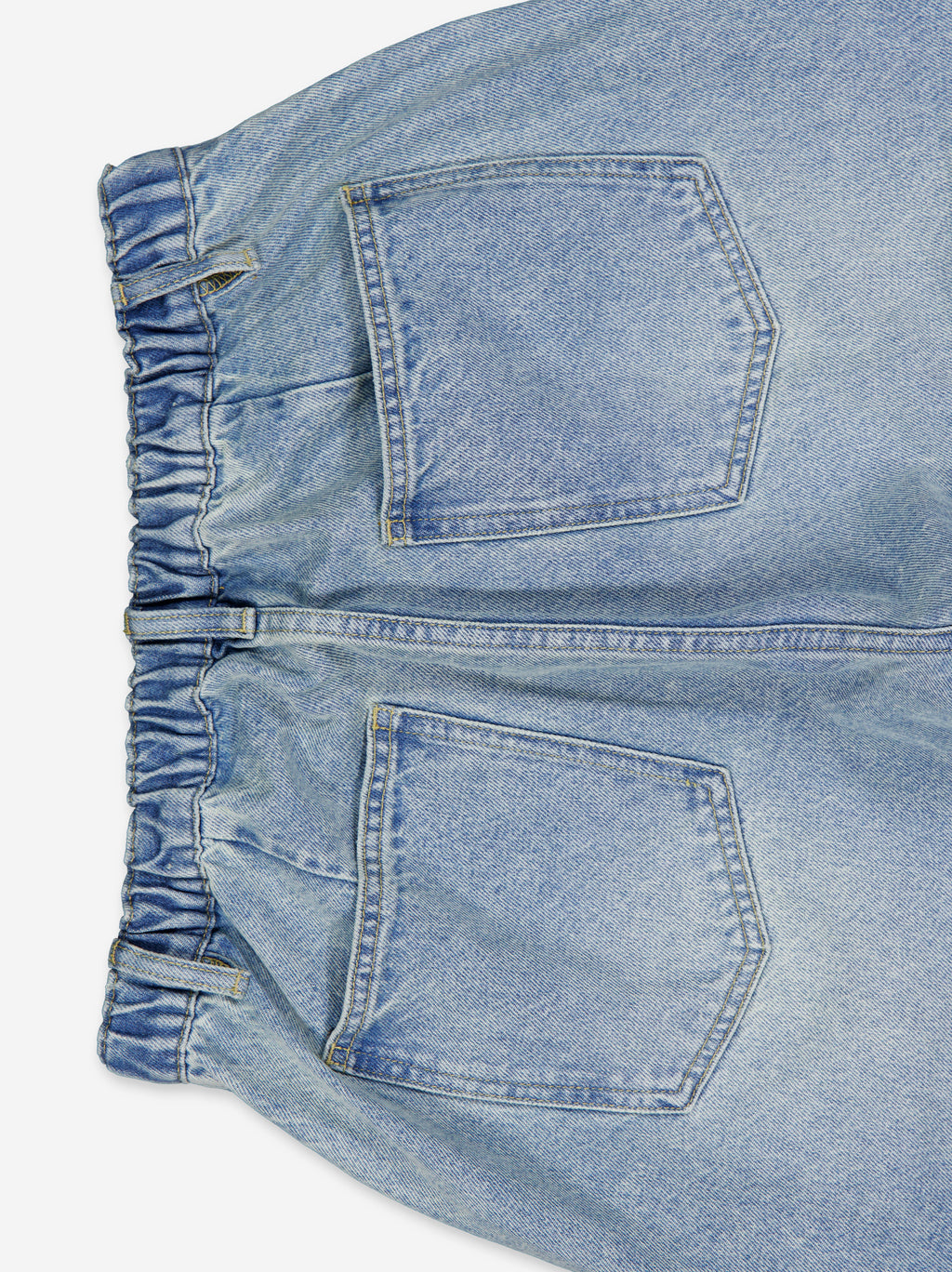 Mid-rise balloon jeans with four pockets. Seam detailing at the knee. Front zipper and metal button closure. Elastic waistband.
