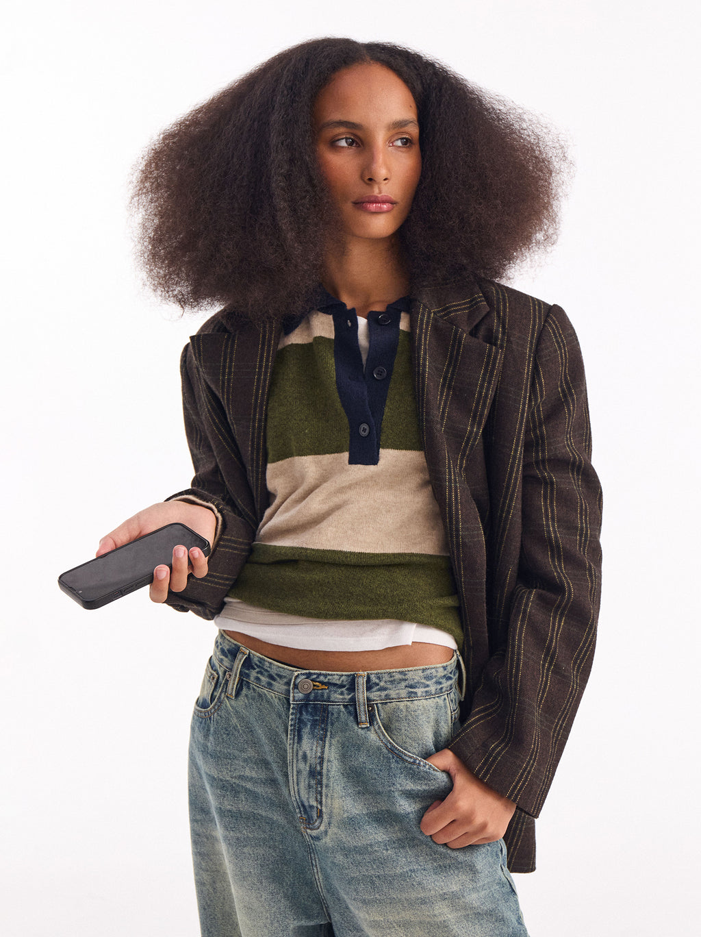 Oversized knit sweater. Striped print. Polo collar with buttons.
