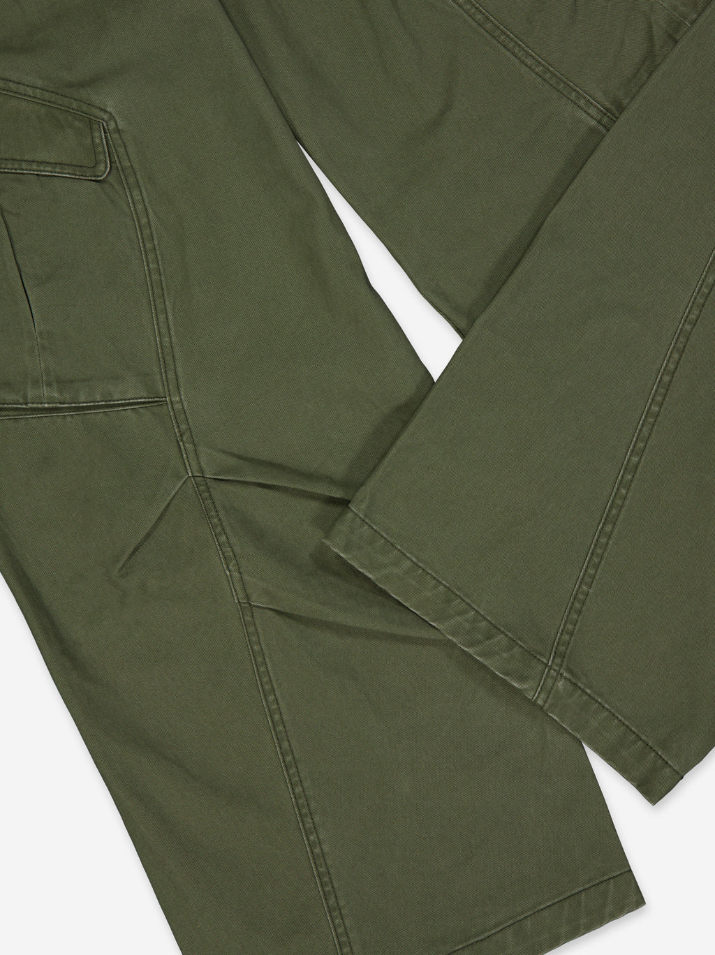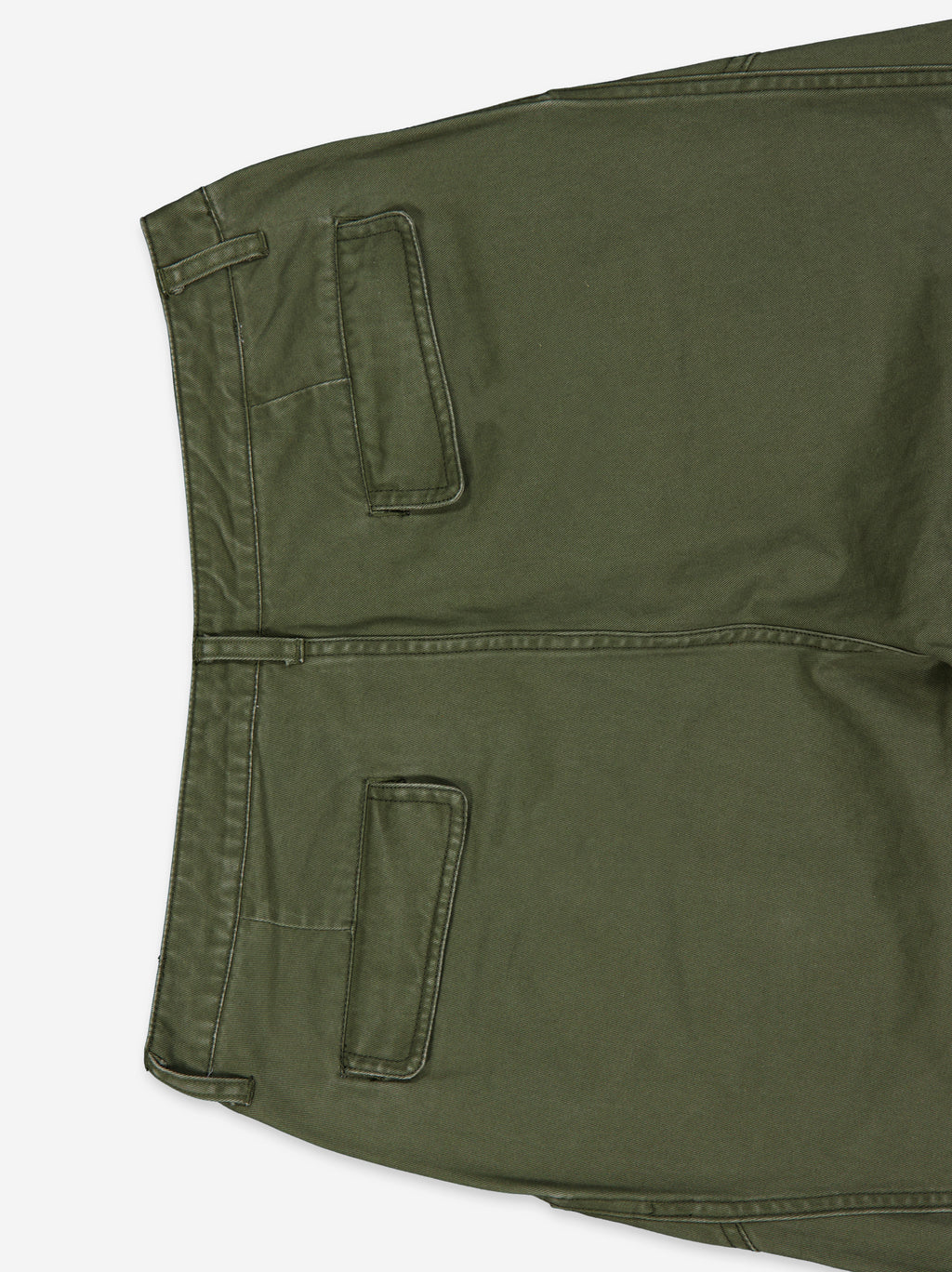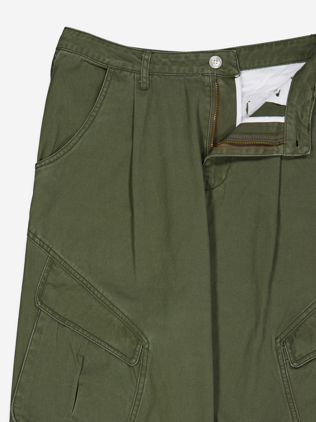Mid-rise cargo pants with belt loops. Leg and back pockets. Front zip and button closure.