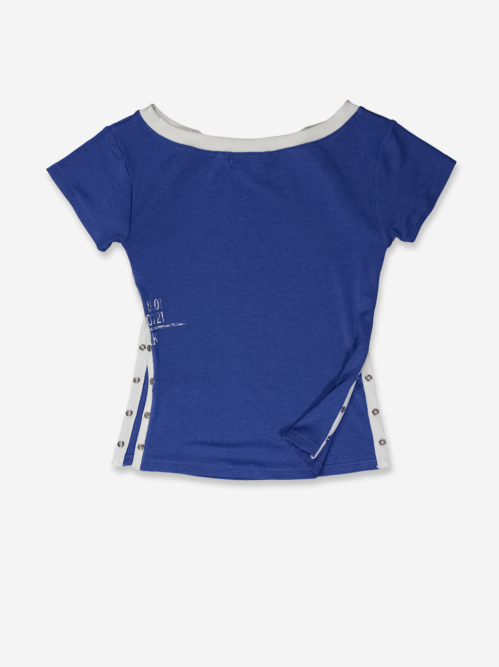 "Blue short-sleeved t-shirt with a modular design and sporty aesthetic. It features panels outlined with contrasting white piping along the shoulders and sides, finished with metallic snap buttons that allow the garment to be transformed and its silhouette to be altered. Includes a small graphic detail on the front for added identity. With a soft feel and comfortable fit, it's a versatile piece that combines functionality and contemporary style.