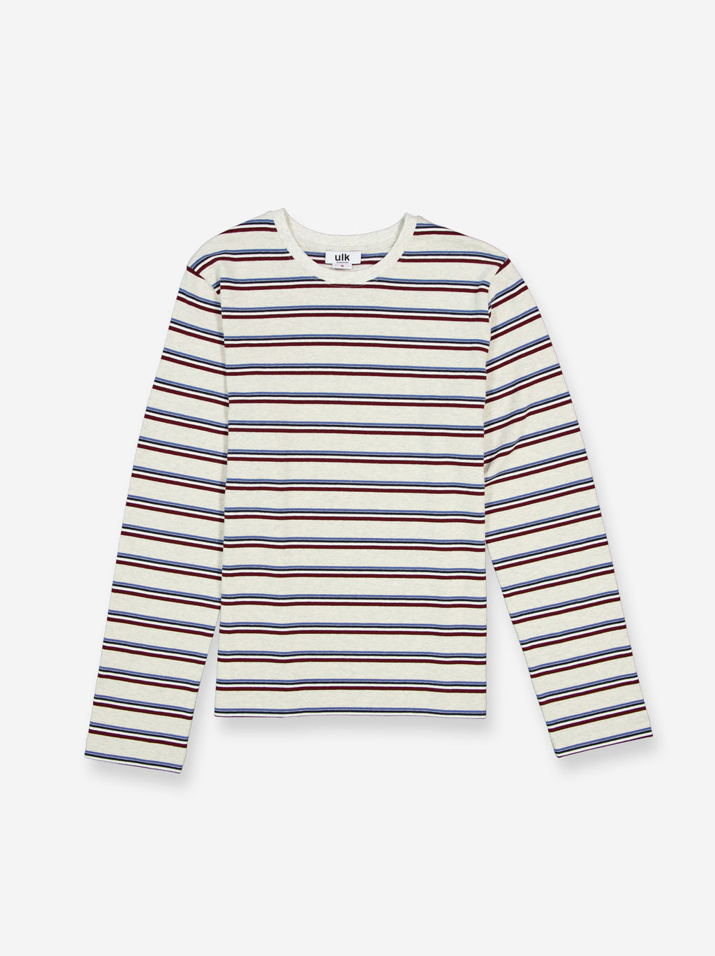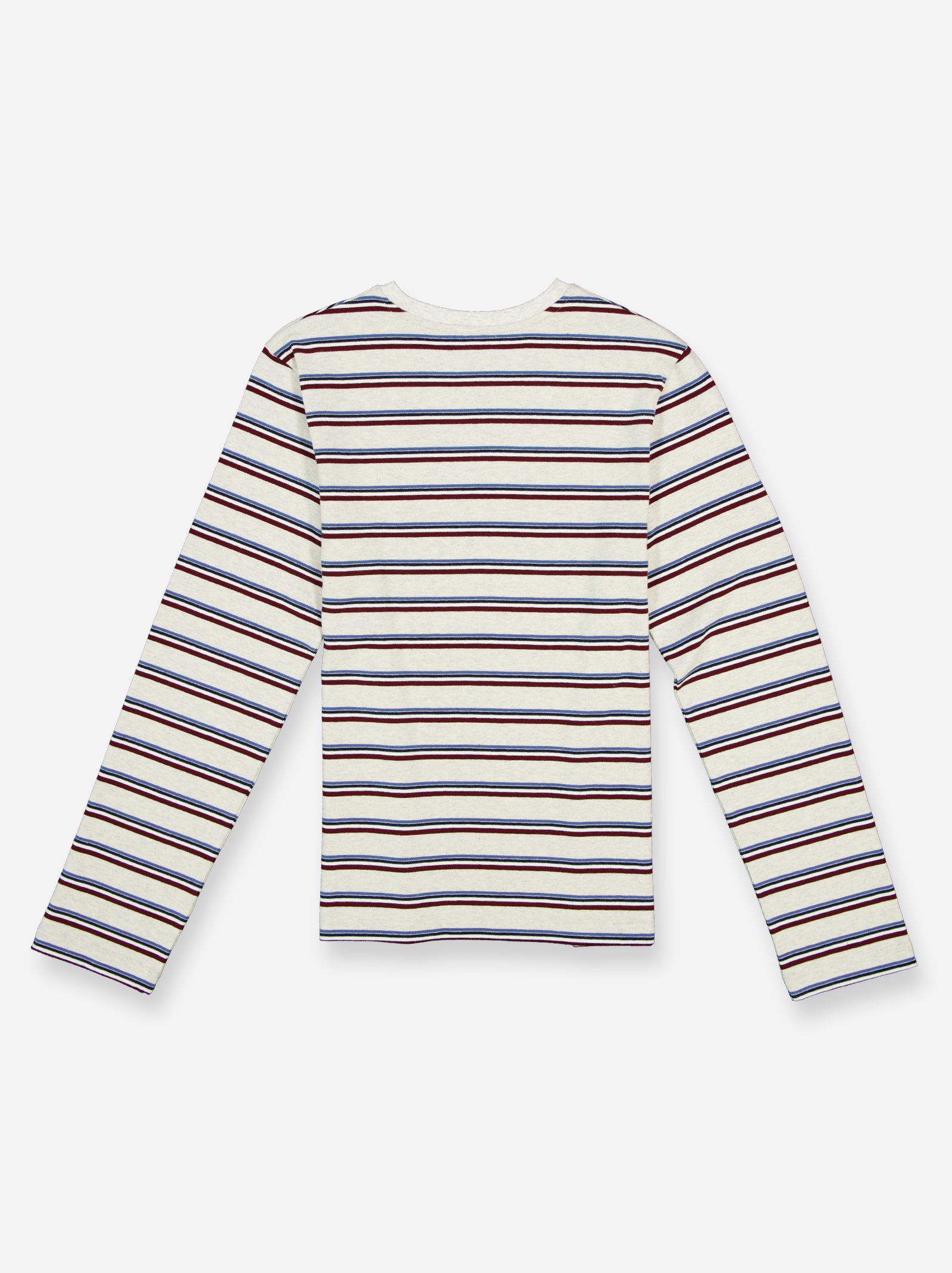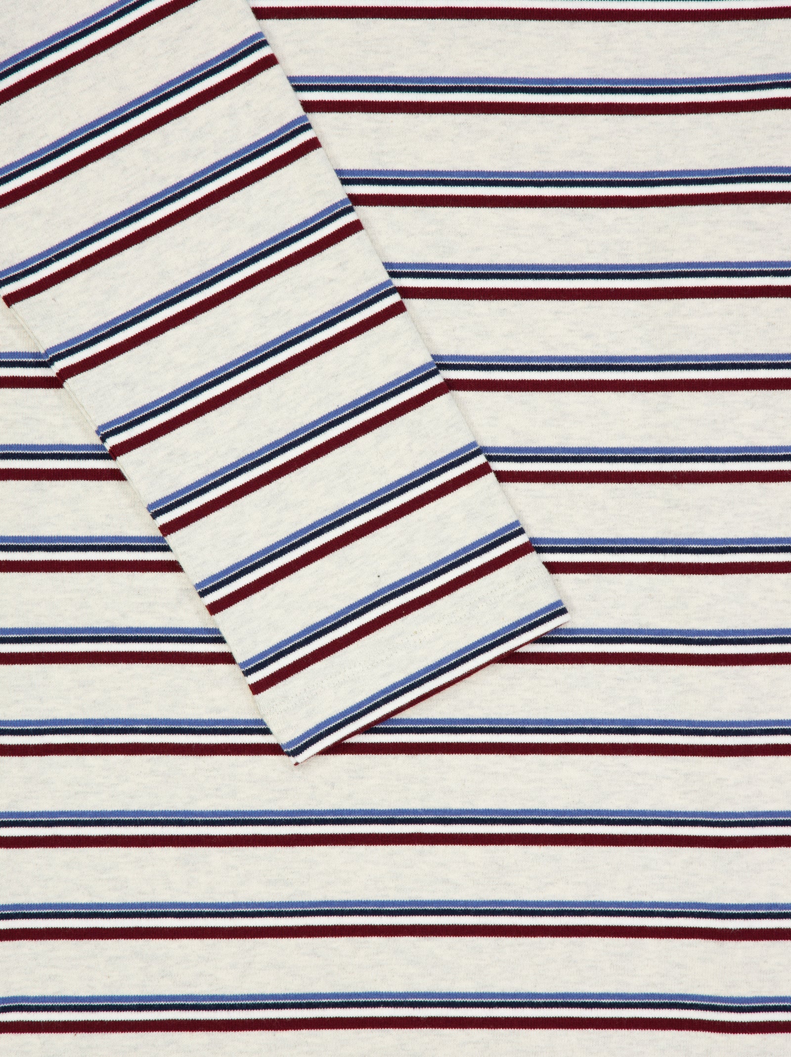 Camiseta de manga larga con diseño de rayas horizontales multicolor. Confeccionada en tejido de punto. Cuello redondo con acabado liso. Corte recto y terminaciones limpias en puños y bajo.