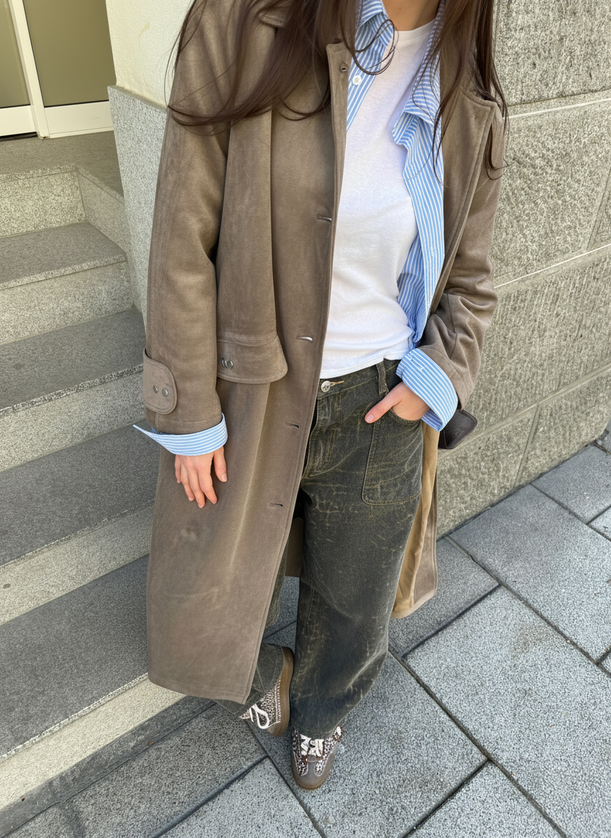 Abrigo largo efecto ante. Estilo trench, elegante, funcional y corte clásico recto. Cierre frontal de botones, puños ajustables y bolsillos con solapa.
