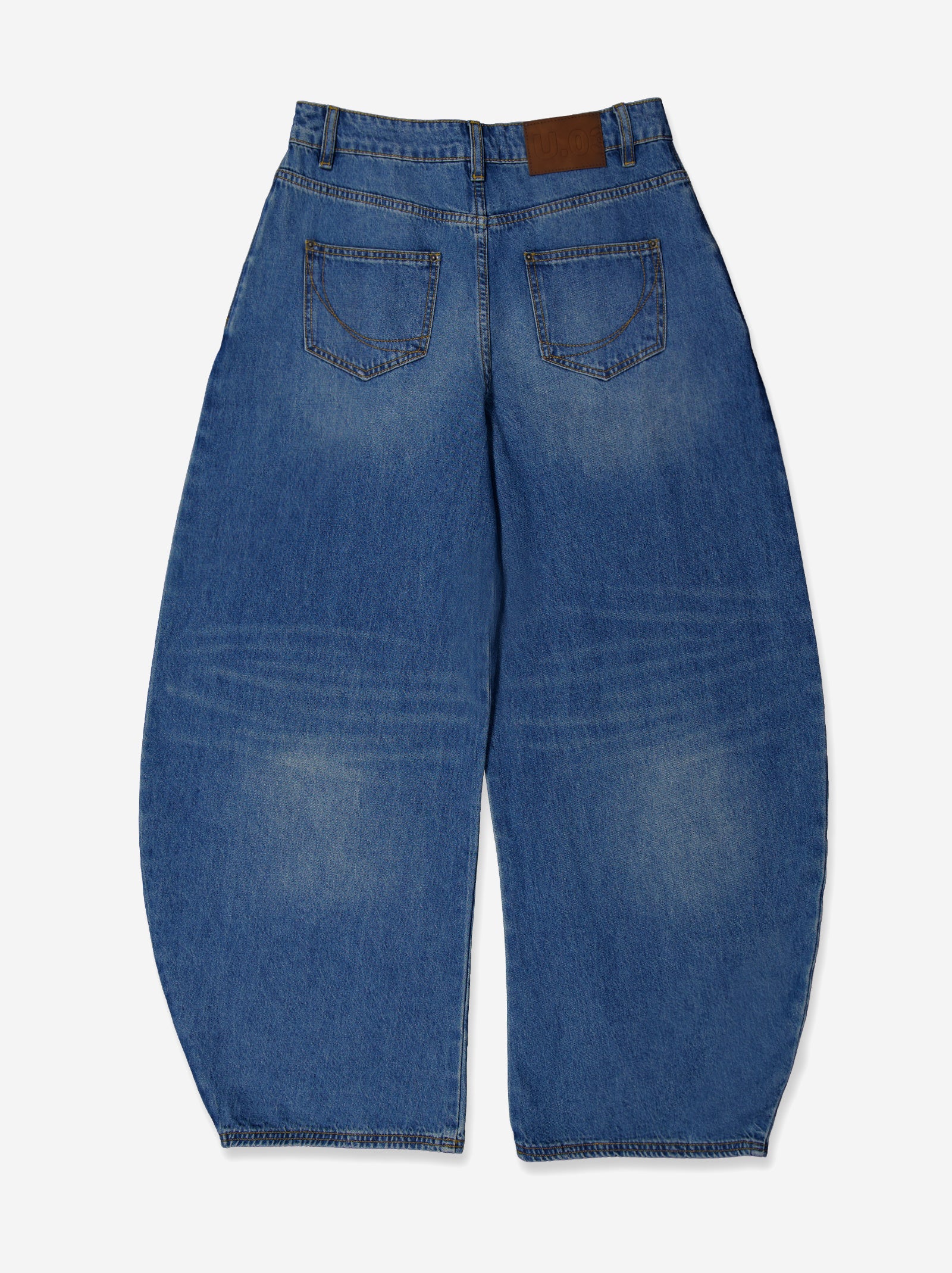 Blue denim jeans with a washed effect that provides a slightly worn and contemporary finish. They feature a mid-rise and wide leg with volume, creating a modern and relaxed silhouette. The five-pocket design and front closure maintain the classic denim essence, reinterpreted with a more contemporary cut. Perfect for pairing with fitted garments or more oversized looks. Materials: 100% cotton.