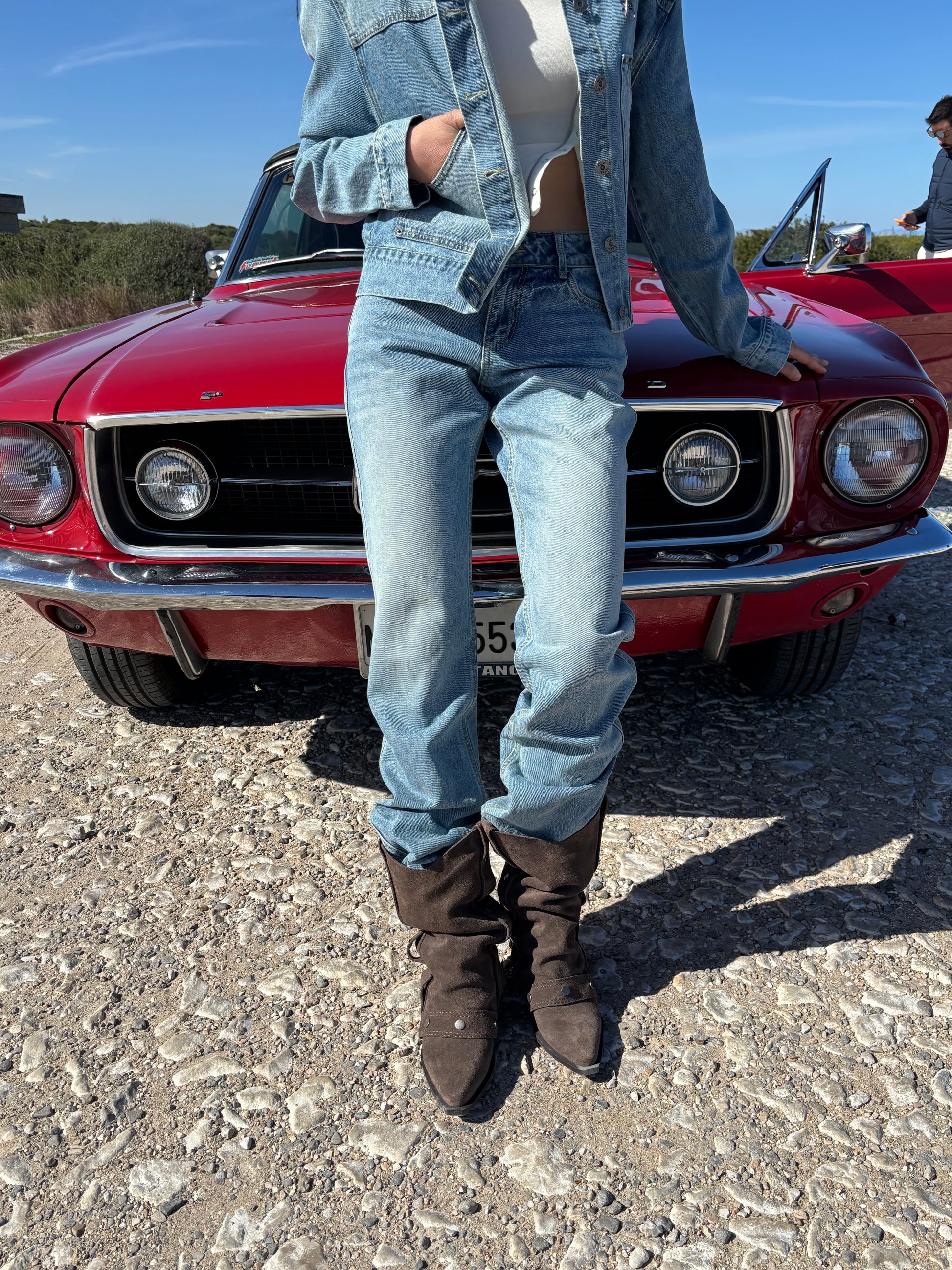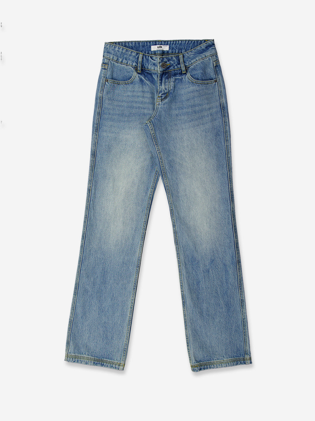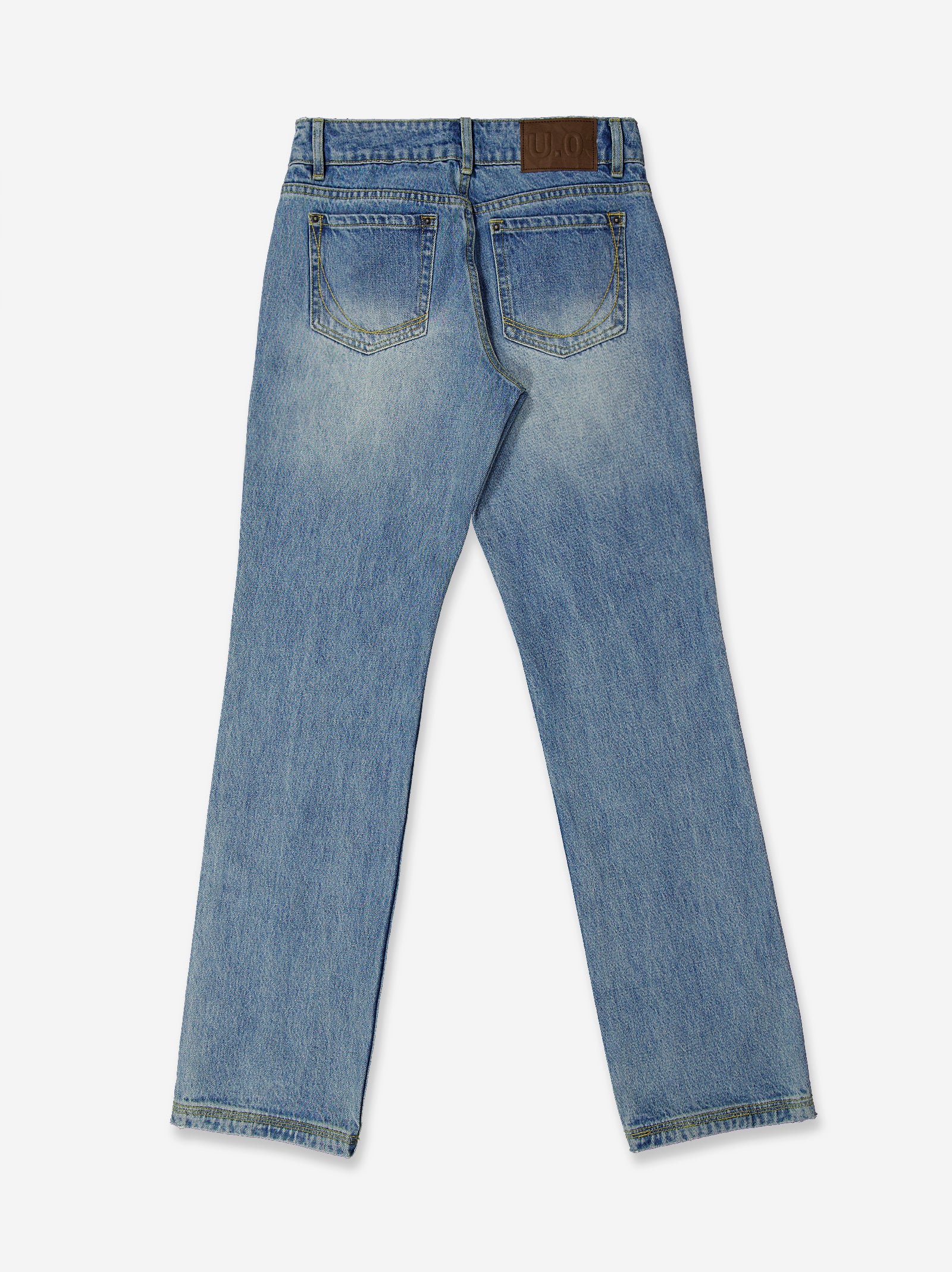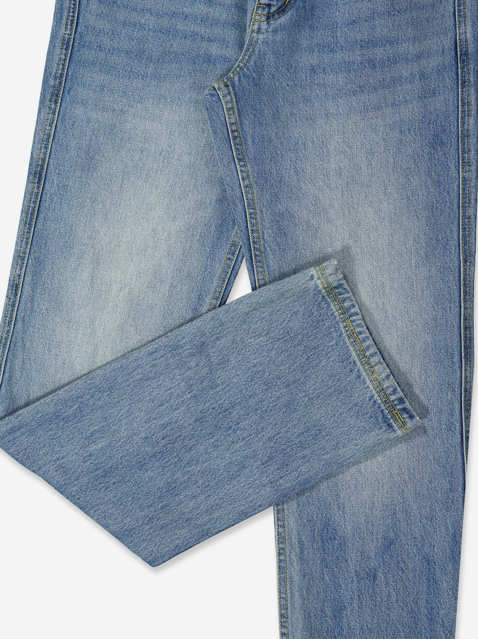 Light blue denim jeans with a washed finish that creates a faded effect on the front. Features a classic five-pocket design with contrast stitching and a front button and zip closure. Its straight cut and comfortable structure make it a versatile garment with a casual and modern feel. Materials: denim cotton.